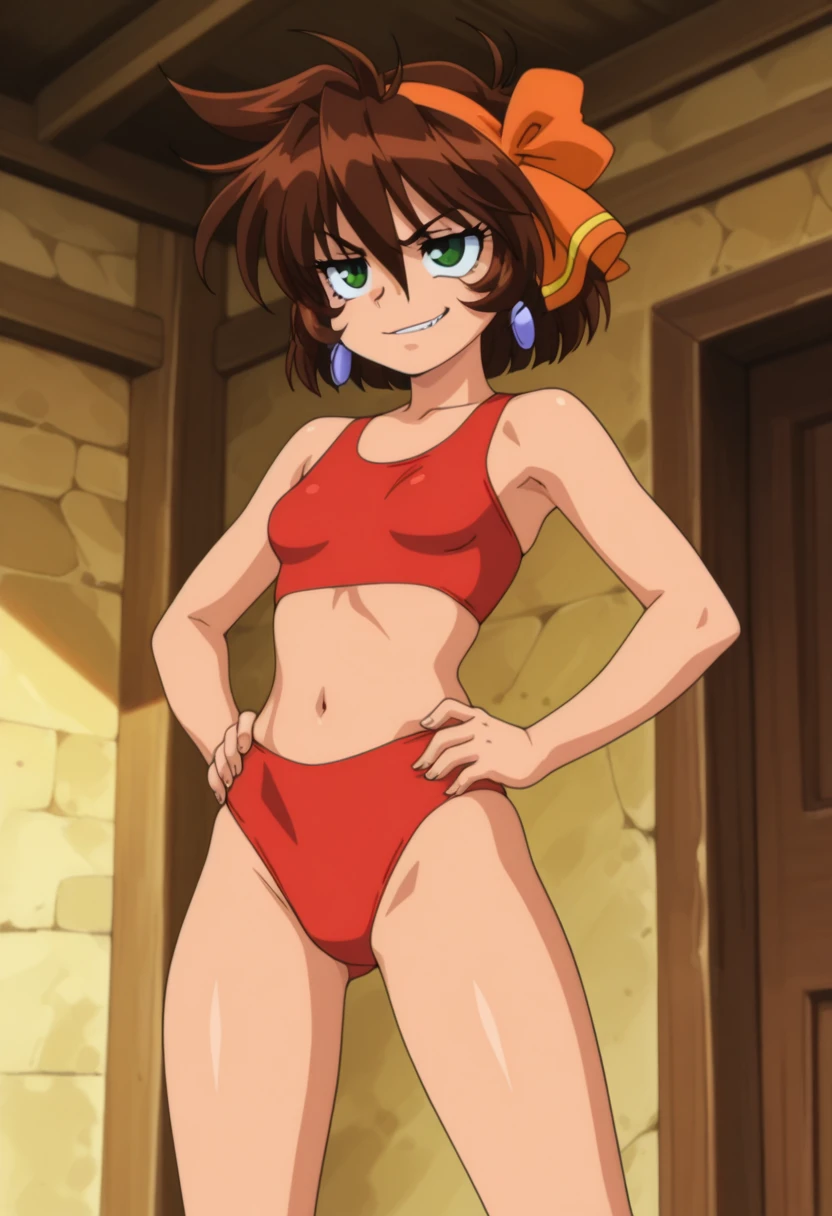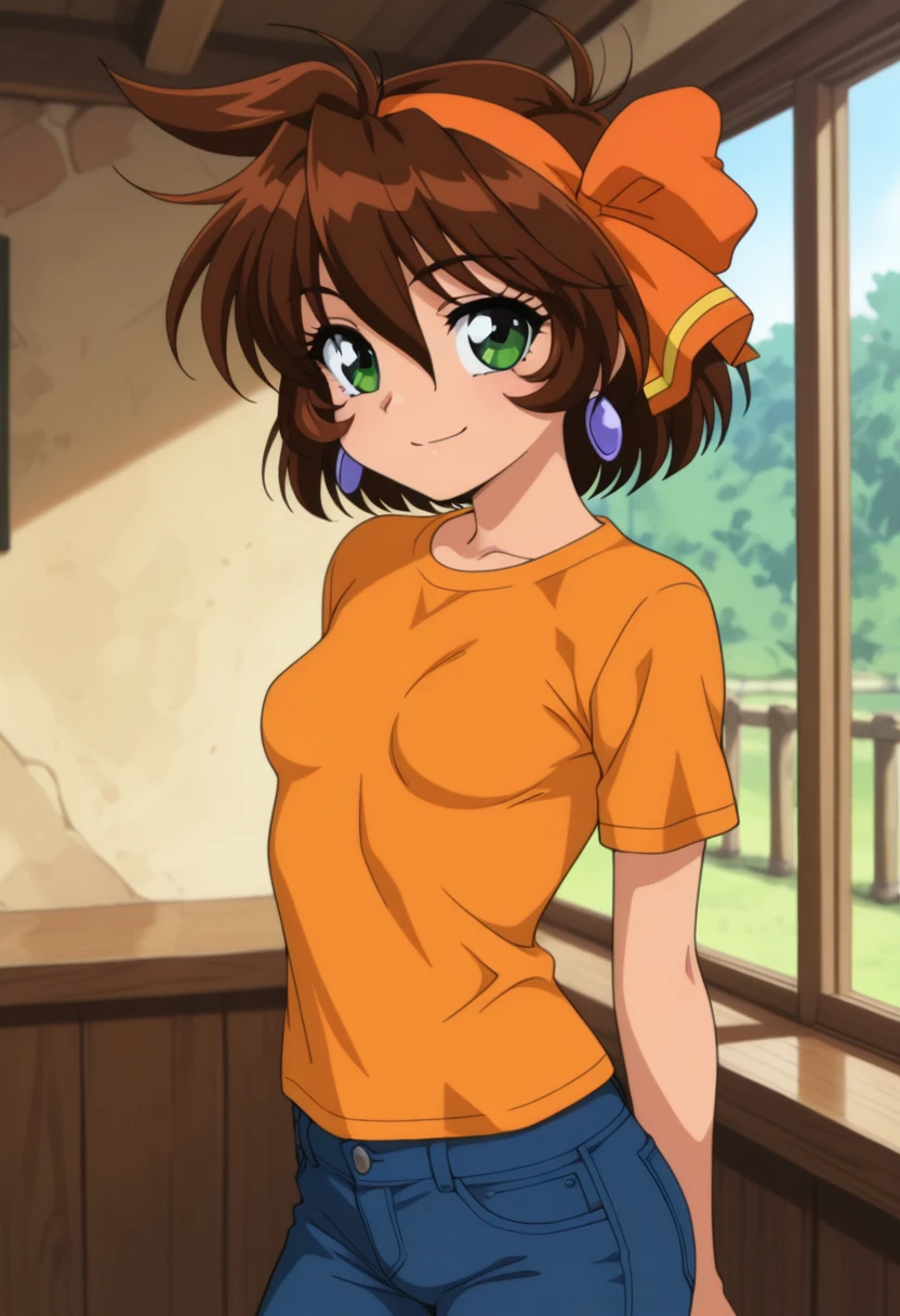 merrillww, green eyes, brown hair, short hair, orange hair ribbon, orange hairband, earrings, small breasts,