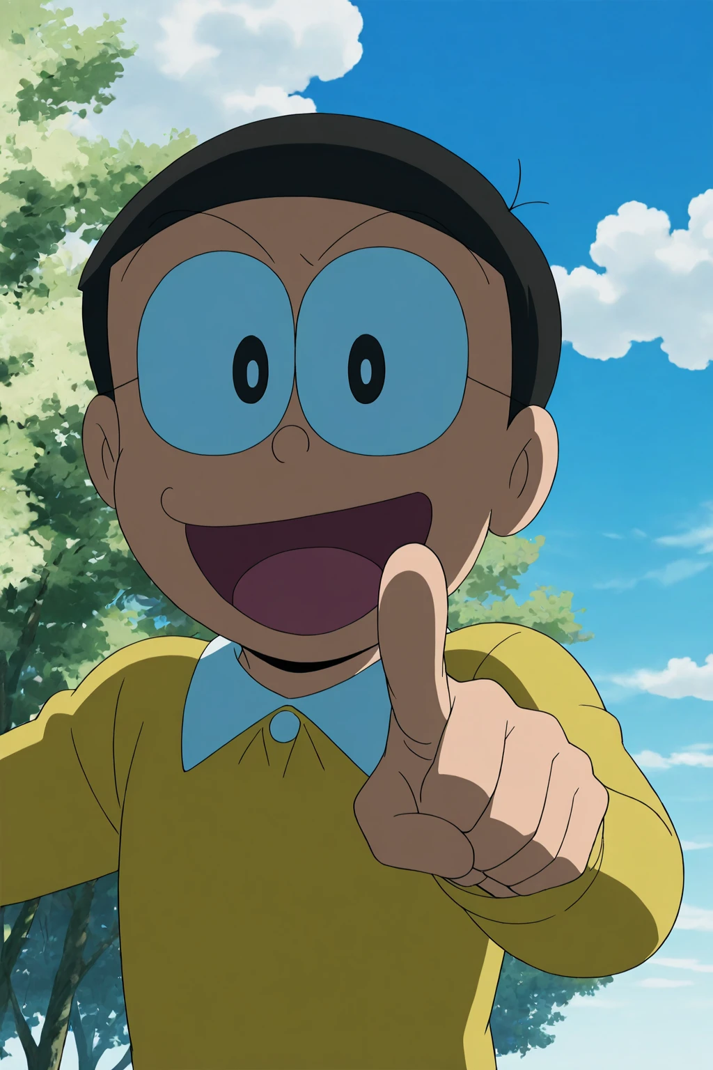 Nobi Nobita,1boy,short hair, black hair, glasses,alopecia on the head, tight glasses,Yellow long-sleeved shirt, blue pants, white socks, green shoes,