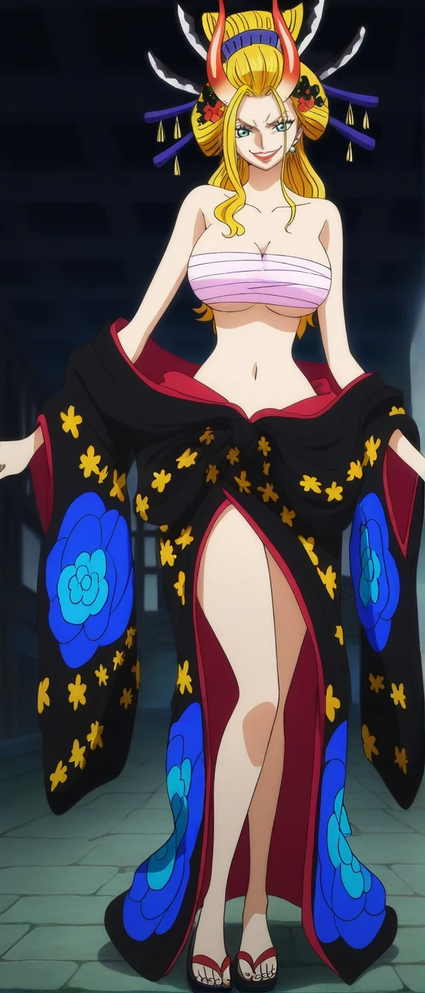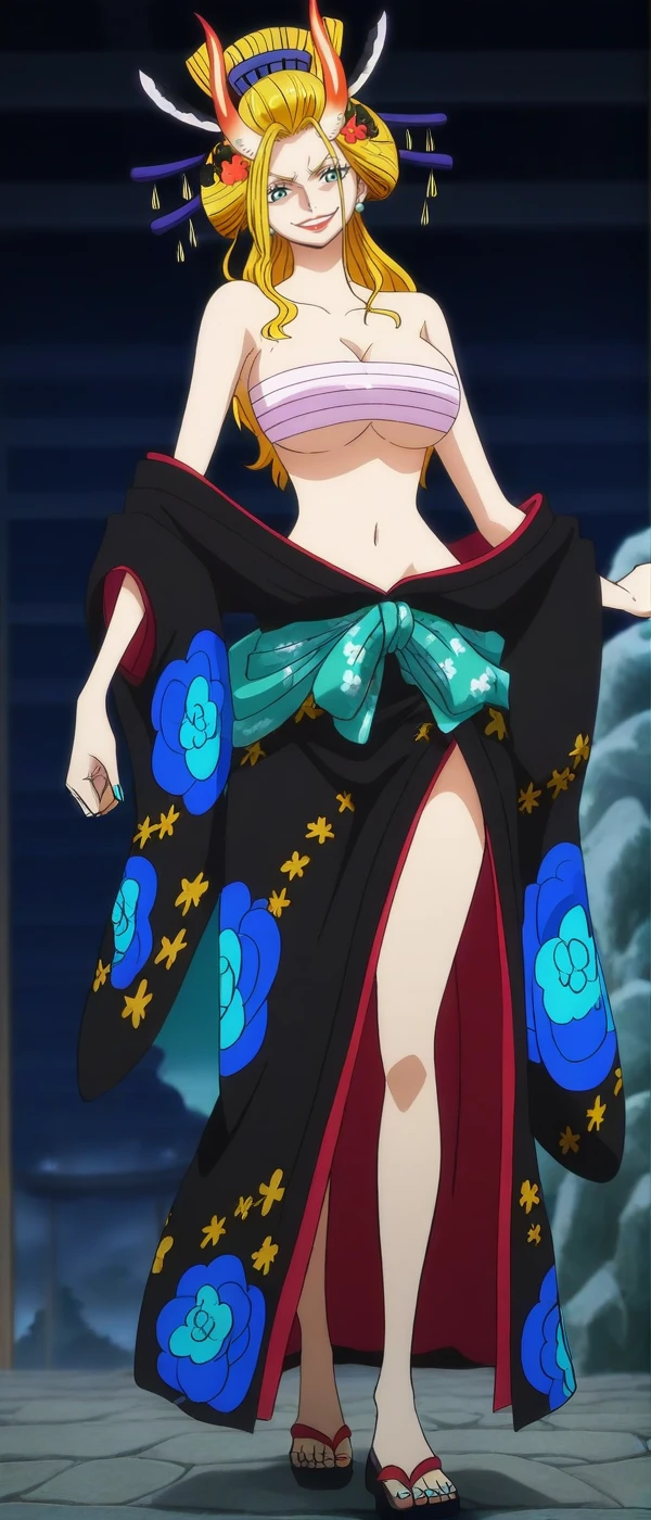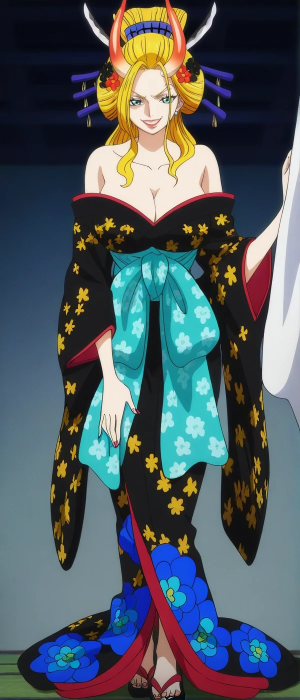 updo, blonde hair, aqua eyes, horns, colored horns, big breasts, earrings, japanese clothes, kimono, hair ornament, hair stick, lipstick