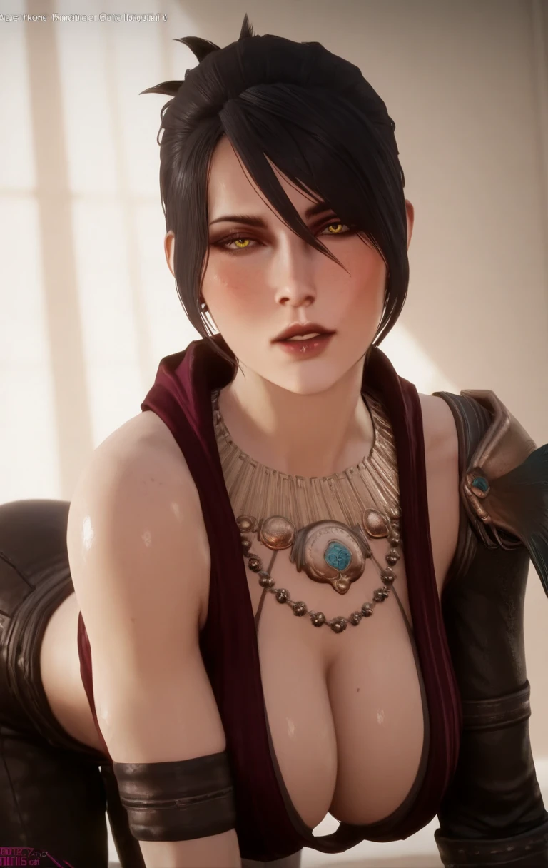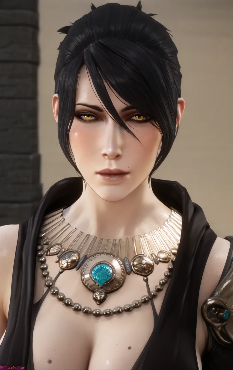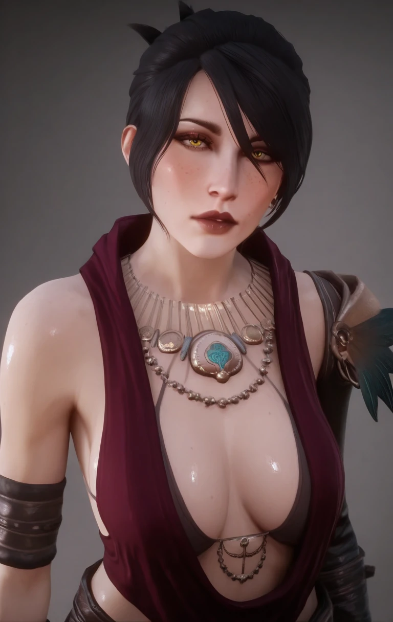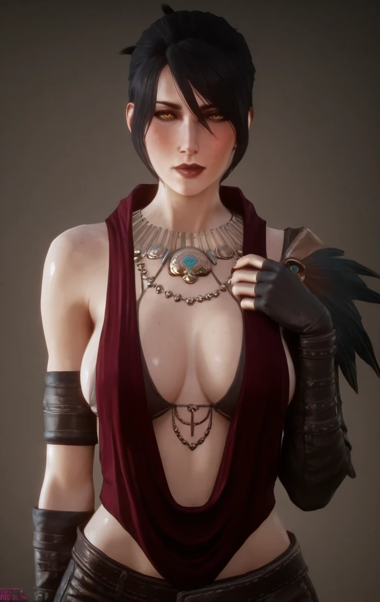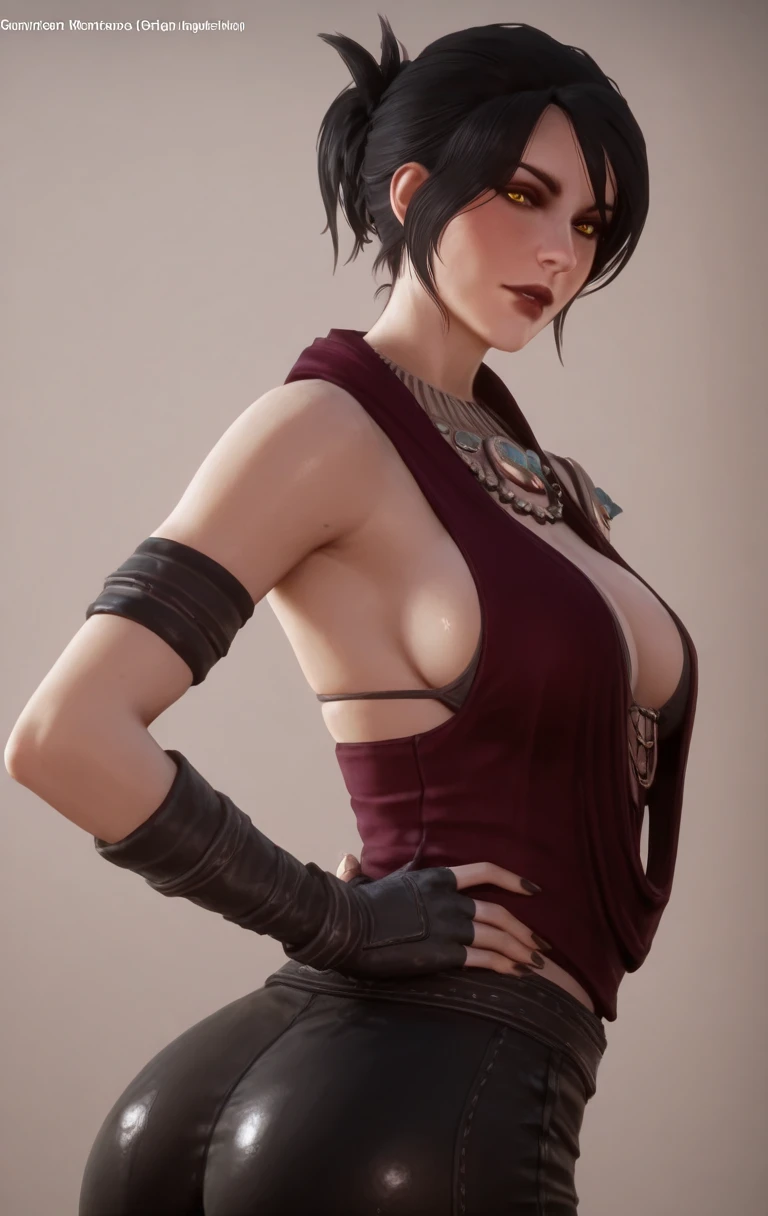 1girl, solo, m0rr1g4n, looking at viewer, short hair, black hair, yellow eyes, jewelry, earrings, necklace, mole, lips, mole under eye, realistic, freckles, red lips, fingerless gloves, black pants,