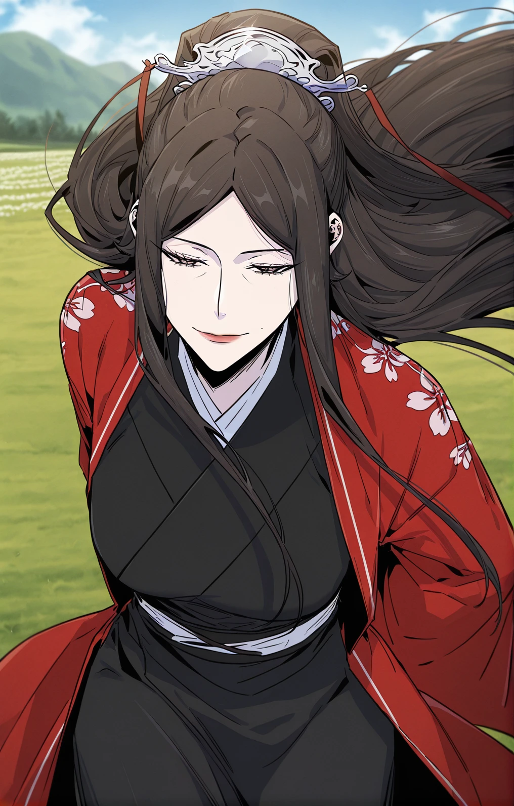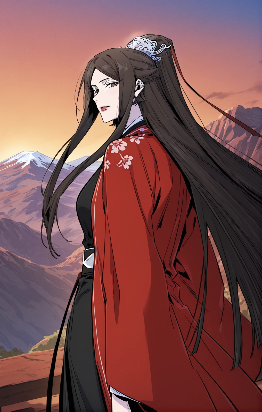 Soryeong_outfit, red robe, long robe, long sleeves, wide sleeves, floral robe, black inner robe, black skirt, long skirt, white waist sash, black belt,