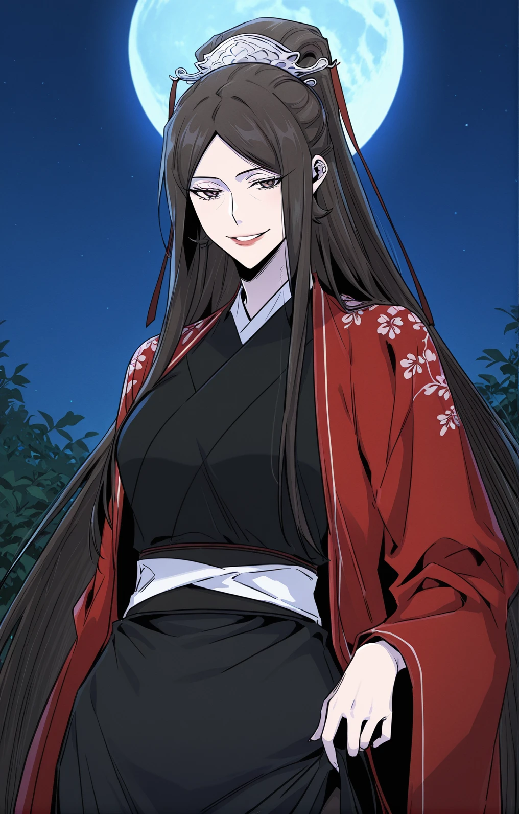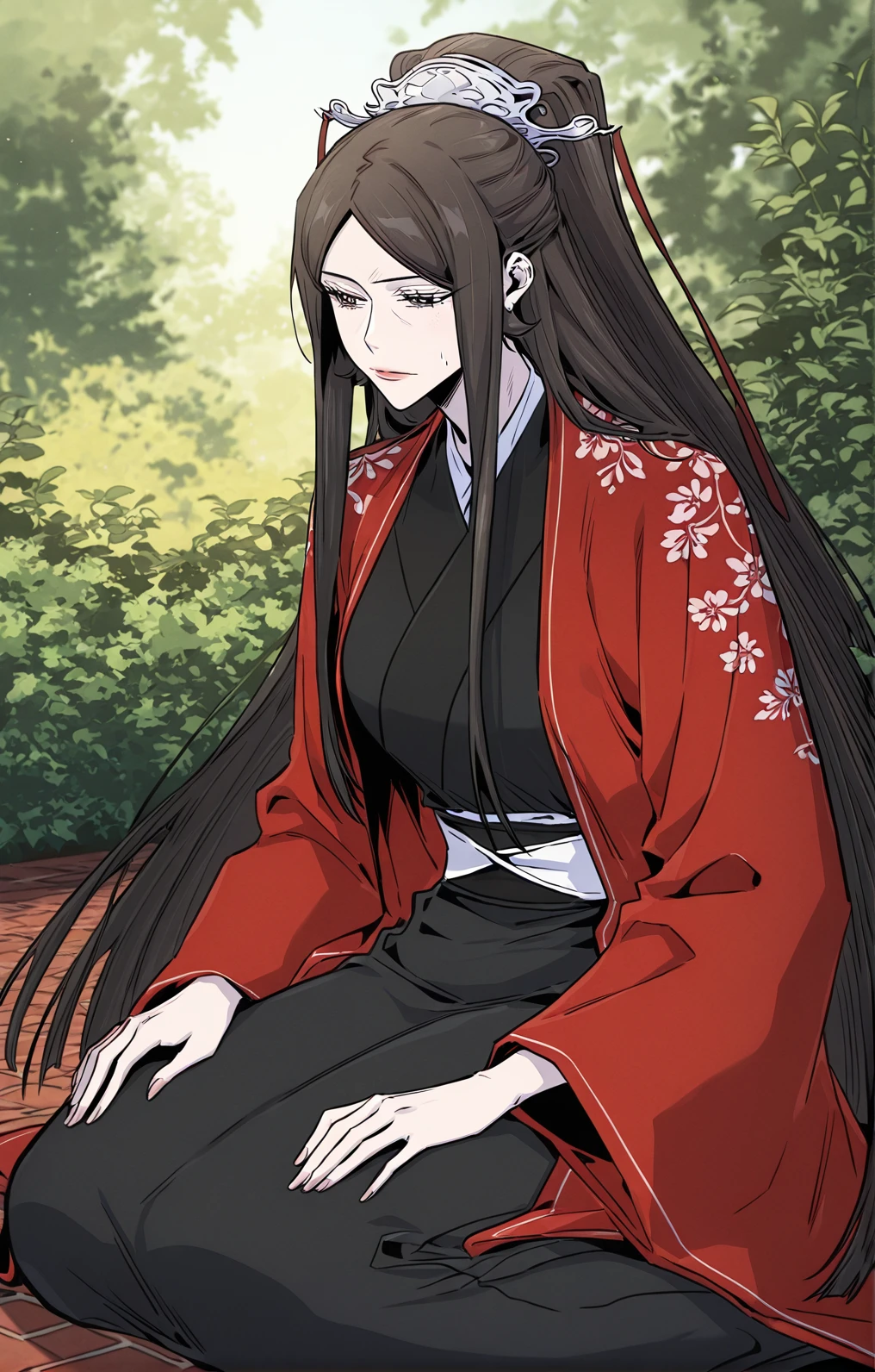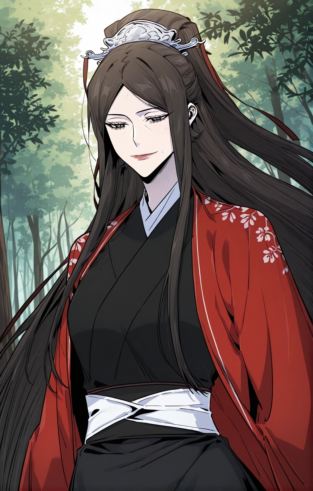 Soryeong, 1girl, solo, mature woman, brown eyes, under eye lines, dark brown hair, very long hair, straight hair, center parted bangs, long sidelocks, half updo, hair ornament, silver crown ornament,