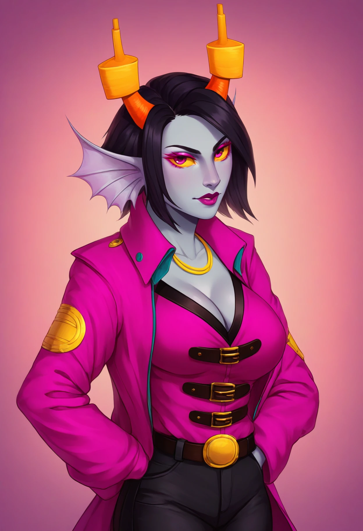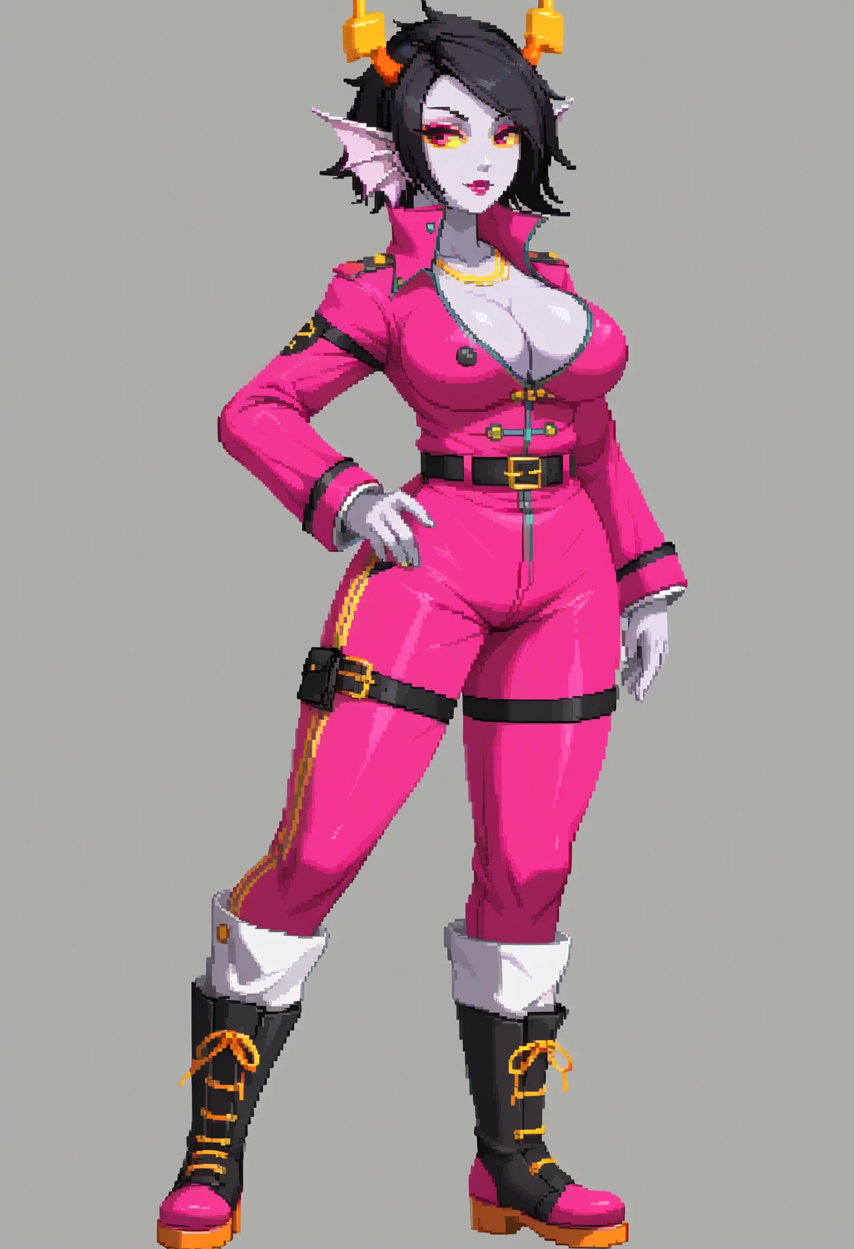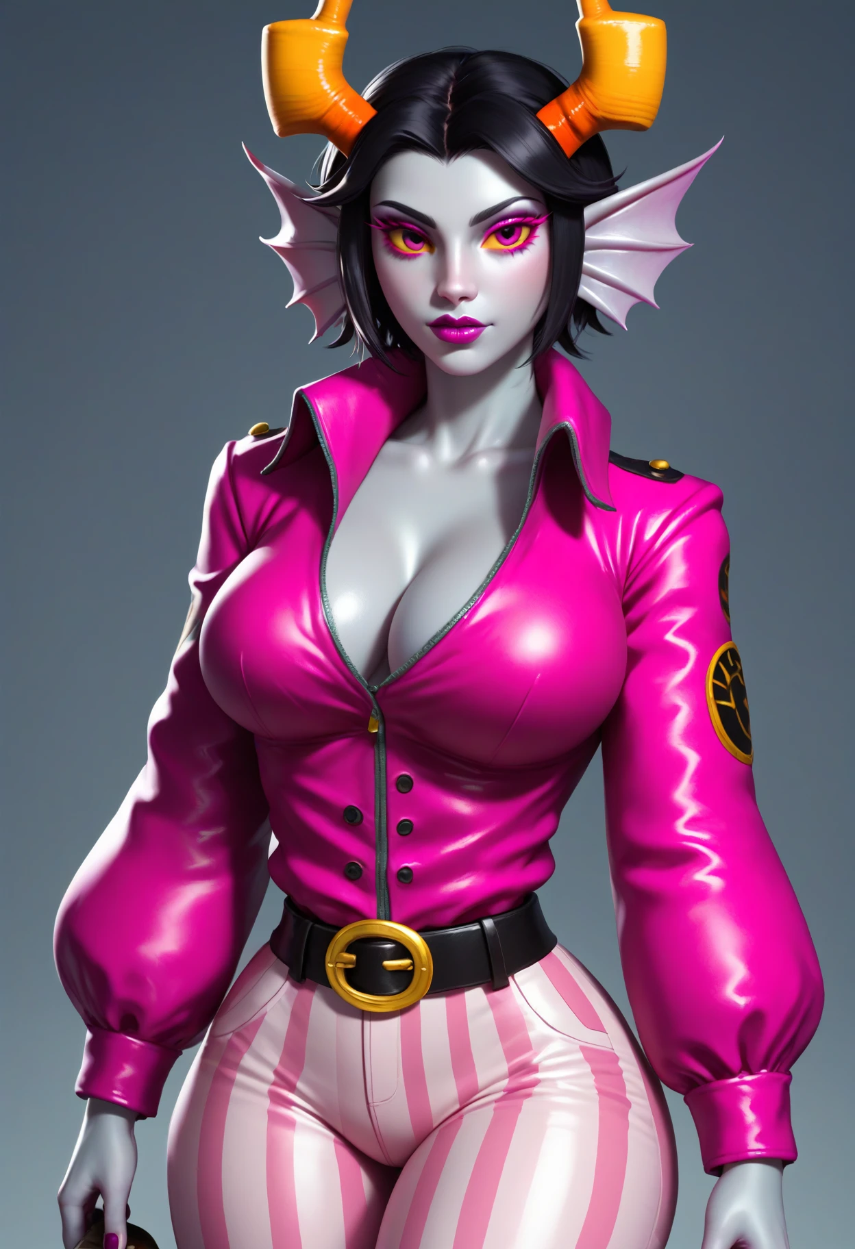 homestuck troll, grey skin, yellow sclera, pink eyes, black hair, short hair, head fins, makeup, eyeshadows, orange horns, large breasts