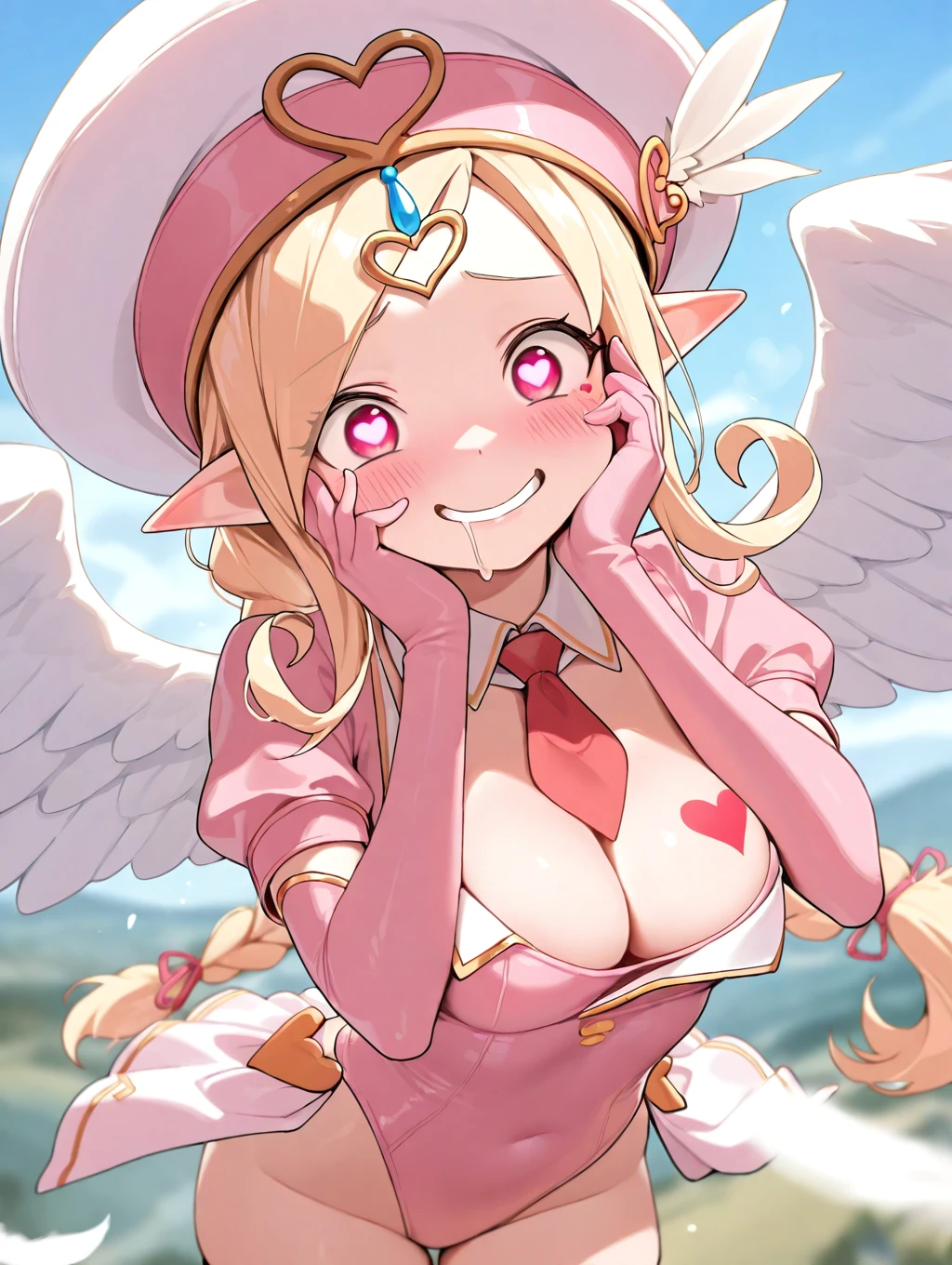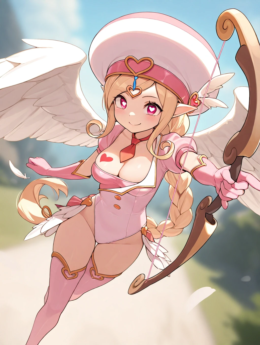 Cupid, blonde hair, long sidelocks, pink eyes, heart_pupils, pointy ears, wings, long hair, single_braid, heart_tattoo_on breast, hat, white feathers on hat, pink leotard, cleavage, short sleeves, pink thighhighs, pink gloves, red necktie, jewelry, pink frills,