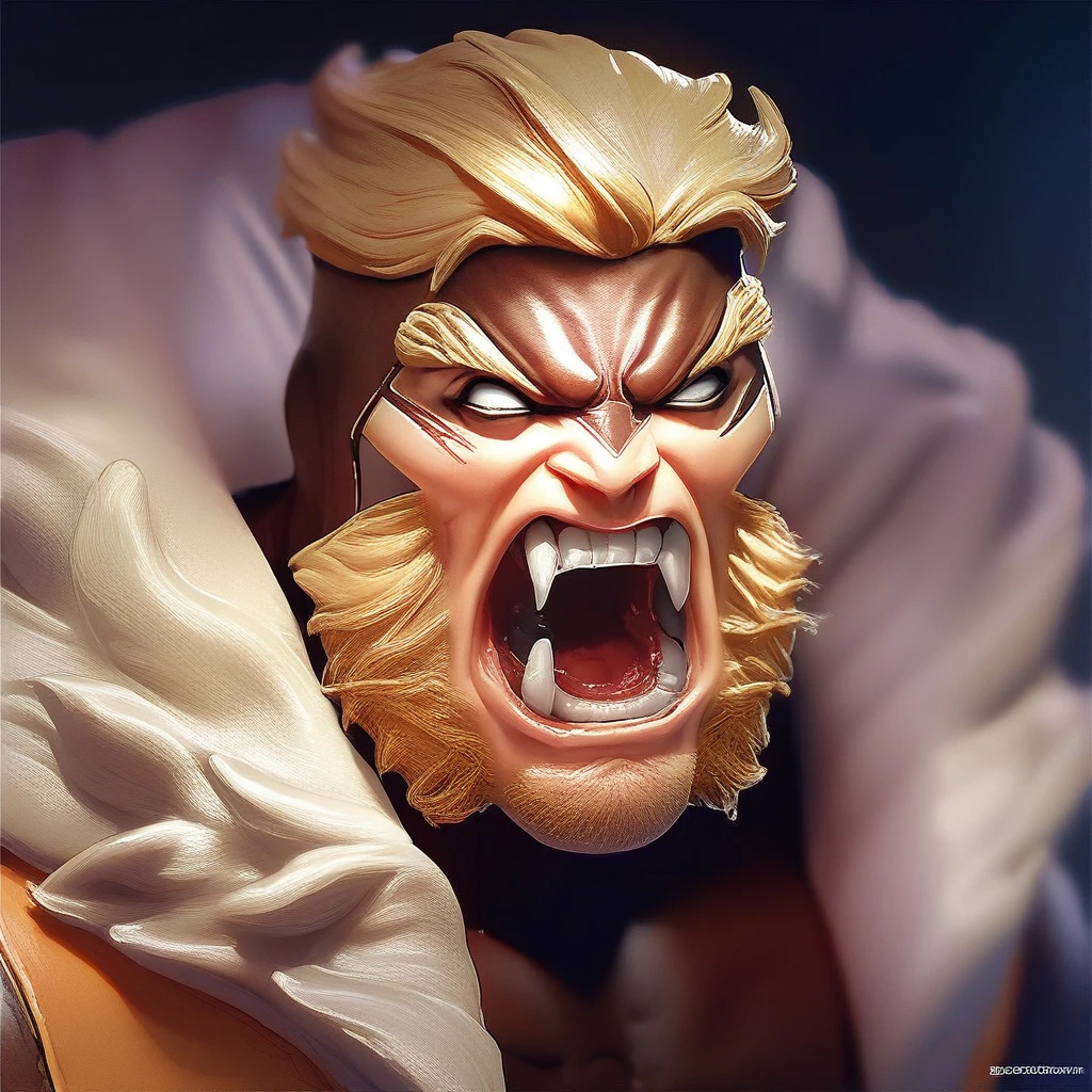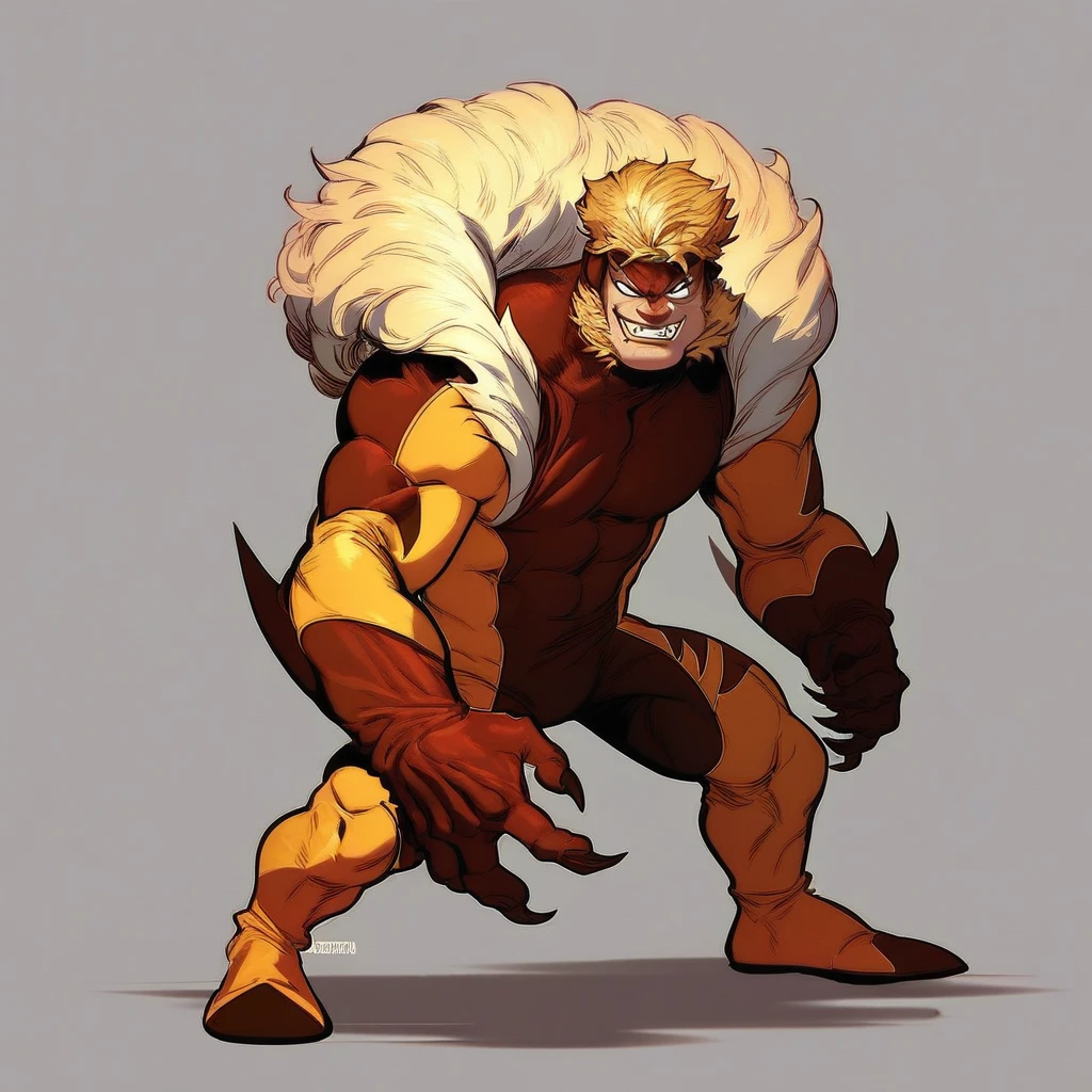 1boy, x_s@bretooth, blonde hair, sideburns, white sclera, fangs, bodysuit, claws, muscular,