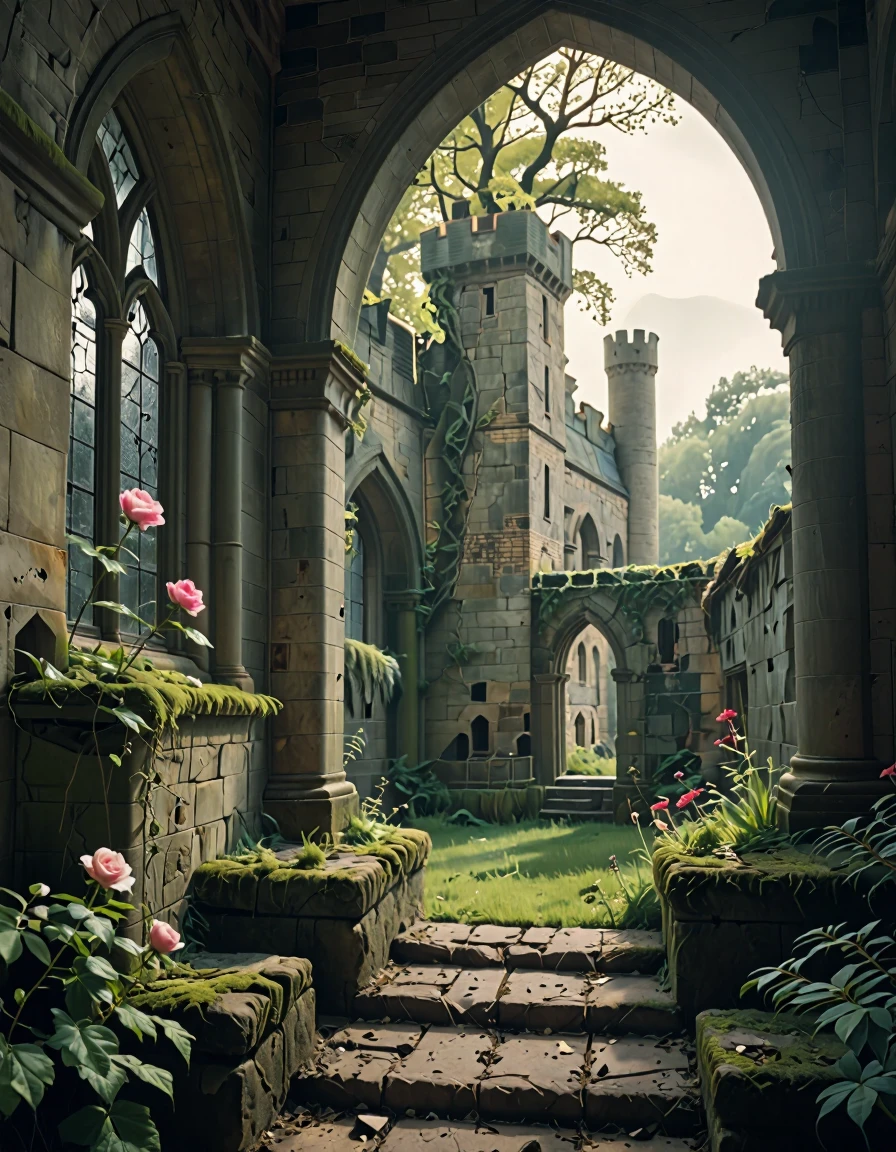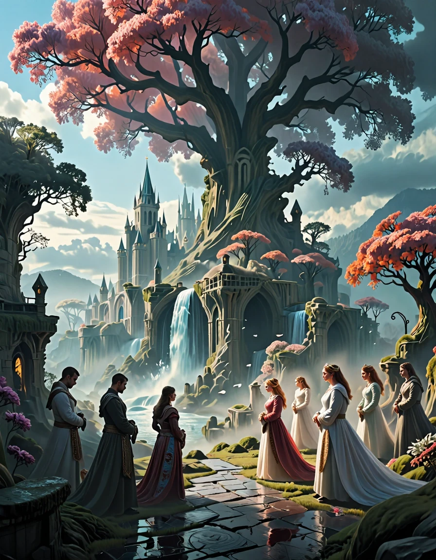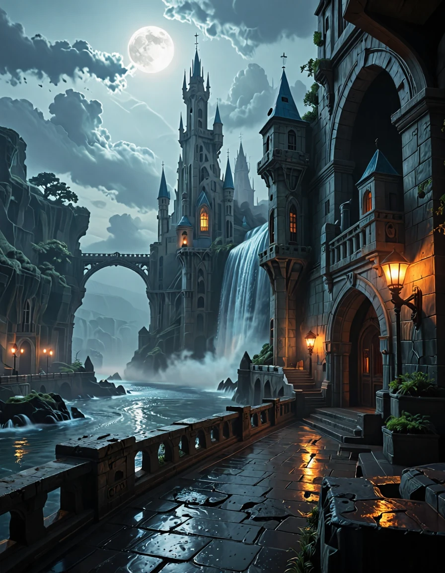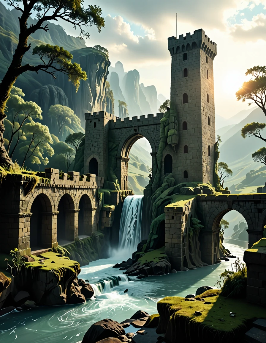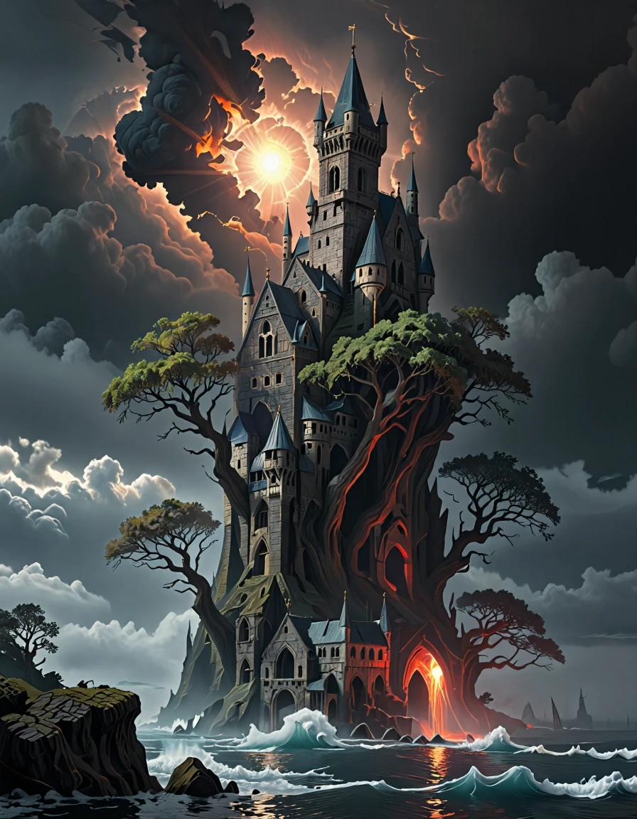 T10, landscape, mountains, waves, rocks, tree, vegetation, moss, rough sea, waterfall, ruins, sunset, blue, orange, yellow, brown,