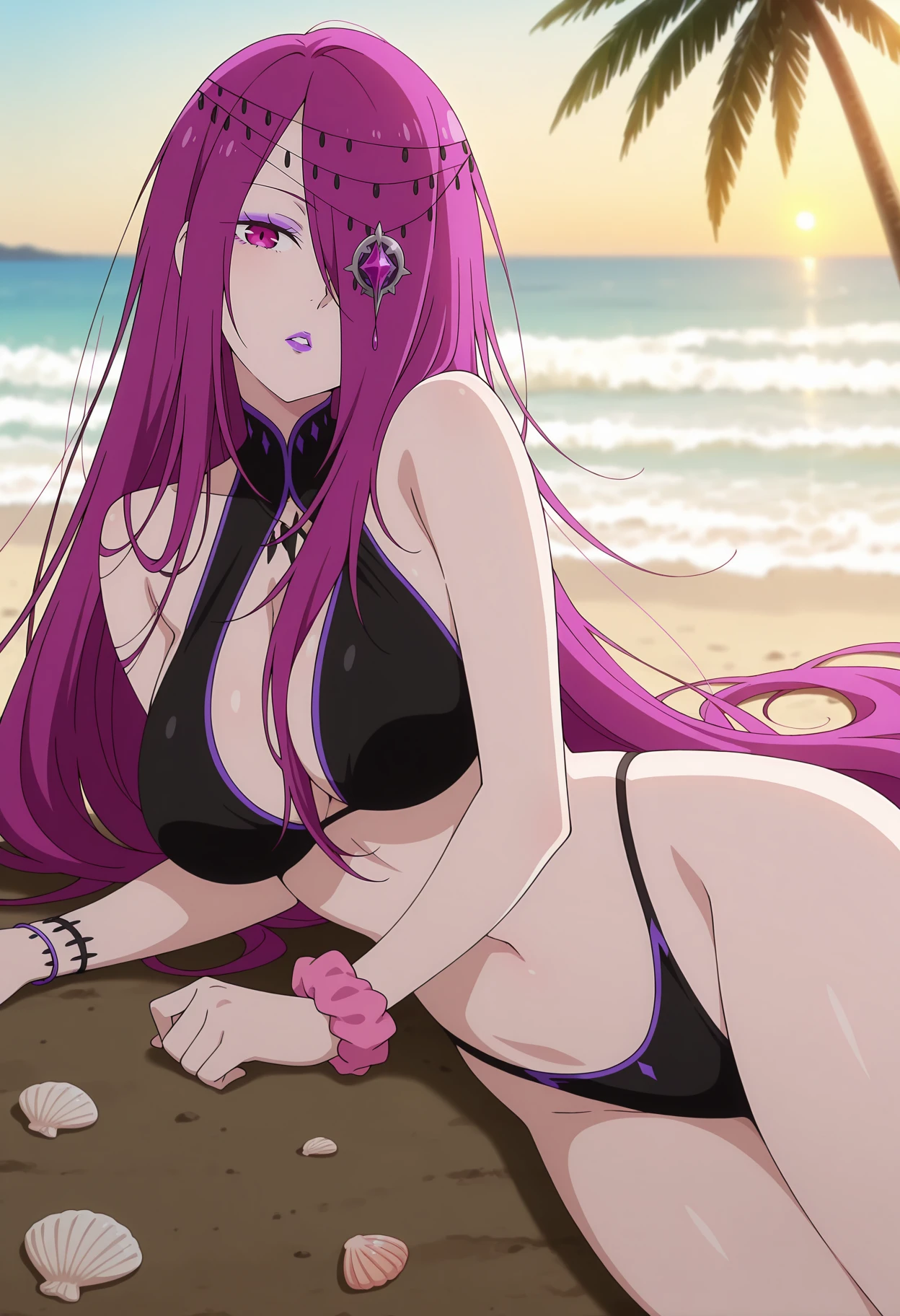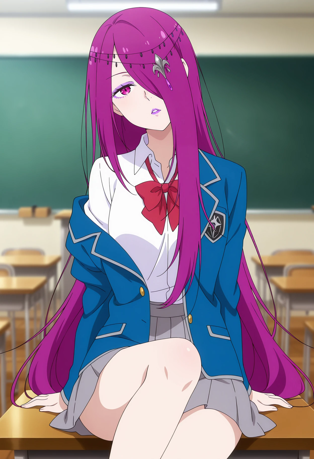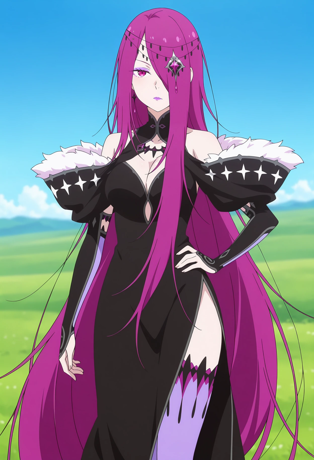 hair over one eye, long hair, purple hair, purple eyeshadow, purple eyes, circlet, hair ornament, purple lips