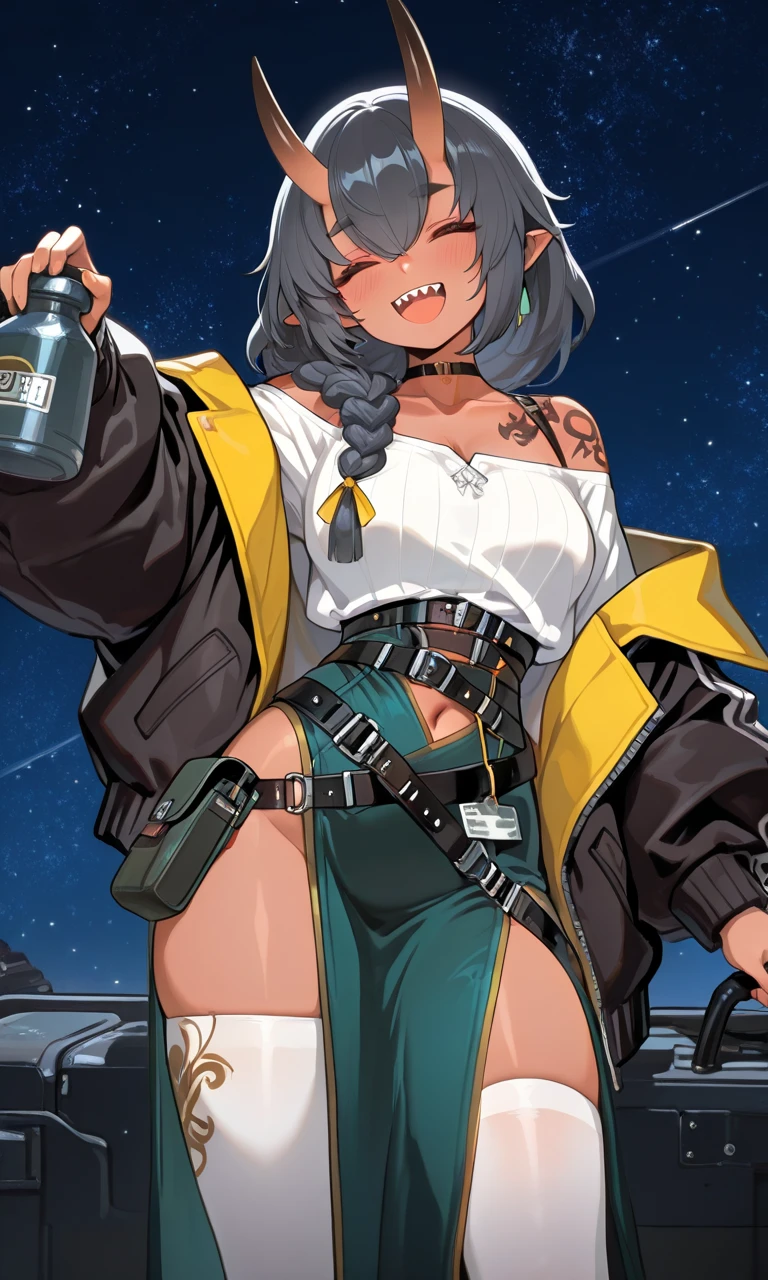 dark skin, eyes closed, pointy ears, skin-covered horns, single braid, navel, tattoos, choker,