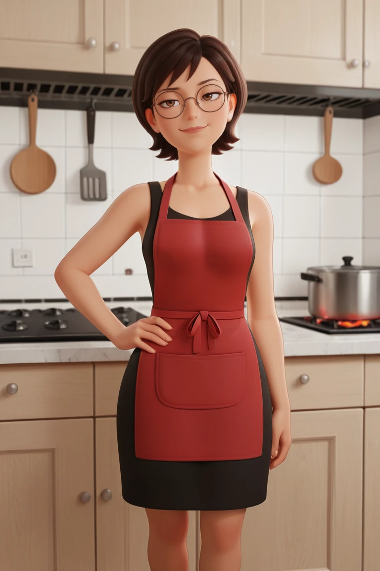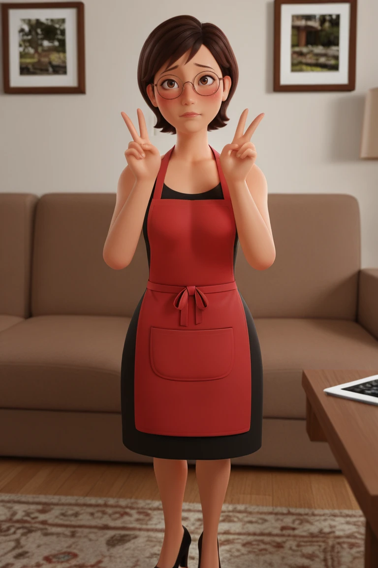 rika_ha,1girl, brown hair, short hair, brown eyes, glasses, high heels, black_dress, red_apron