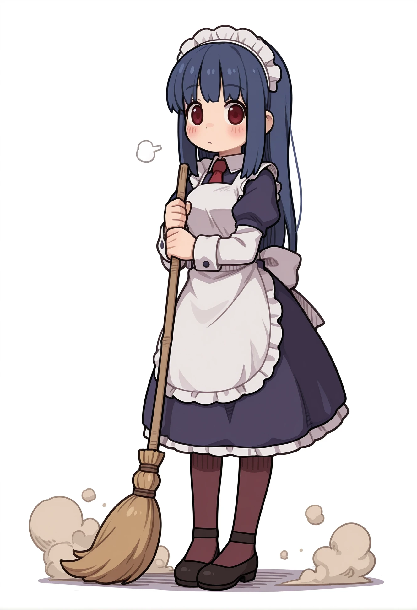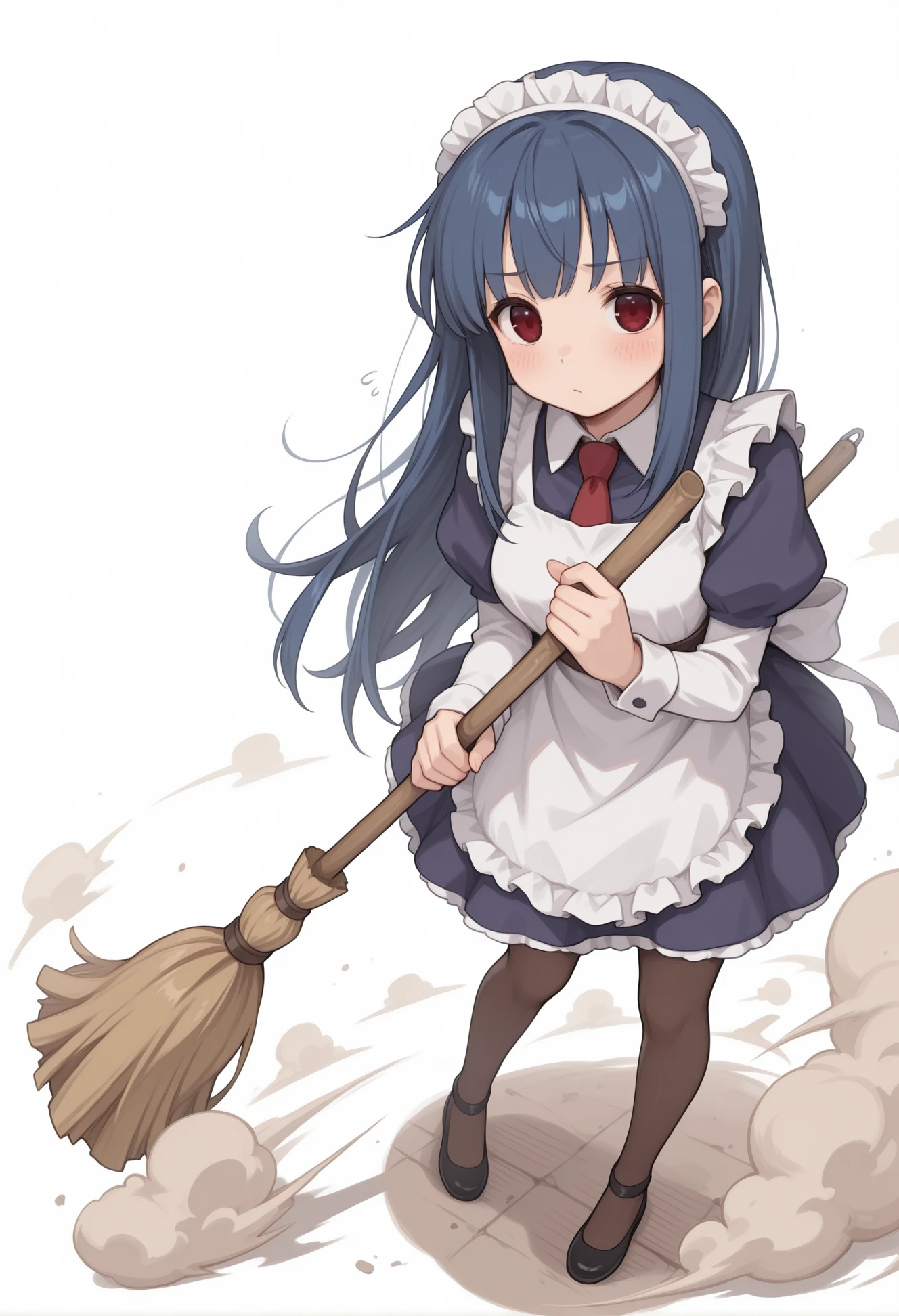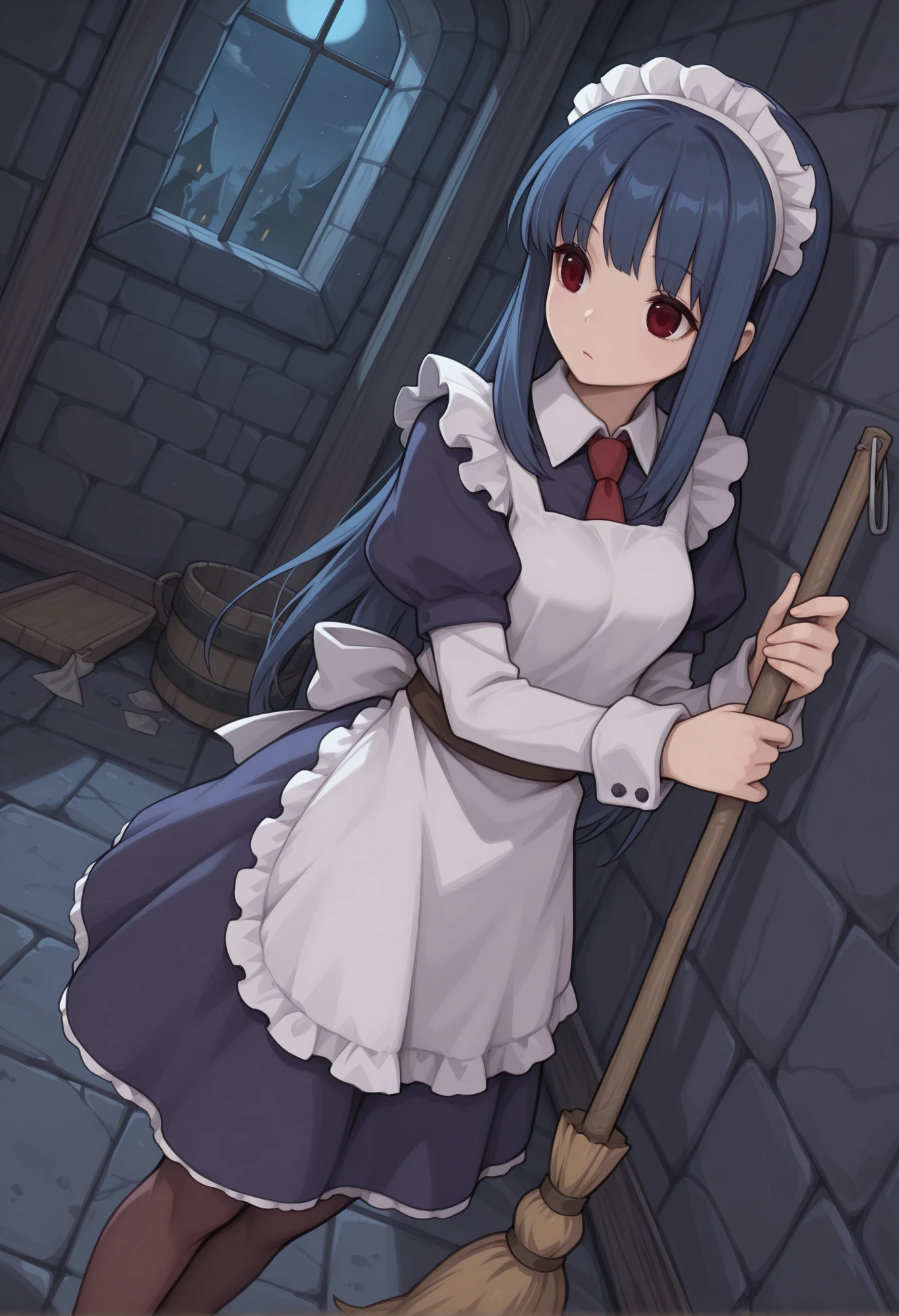 ragnarok_online, red eye, blue hair, long hair, apron, broom,dress, holding broom, maid headdress, necktie, purple dress, red necktie, white apron, tights,