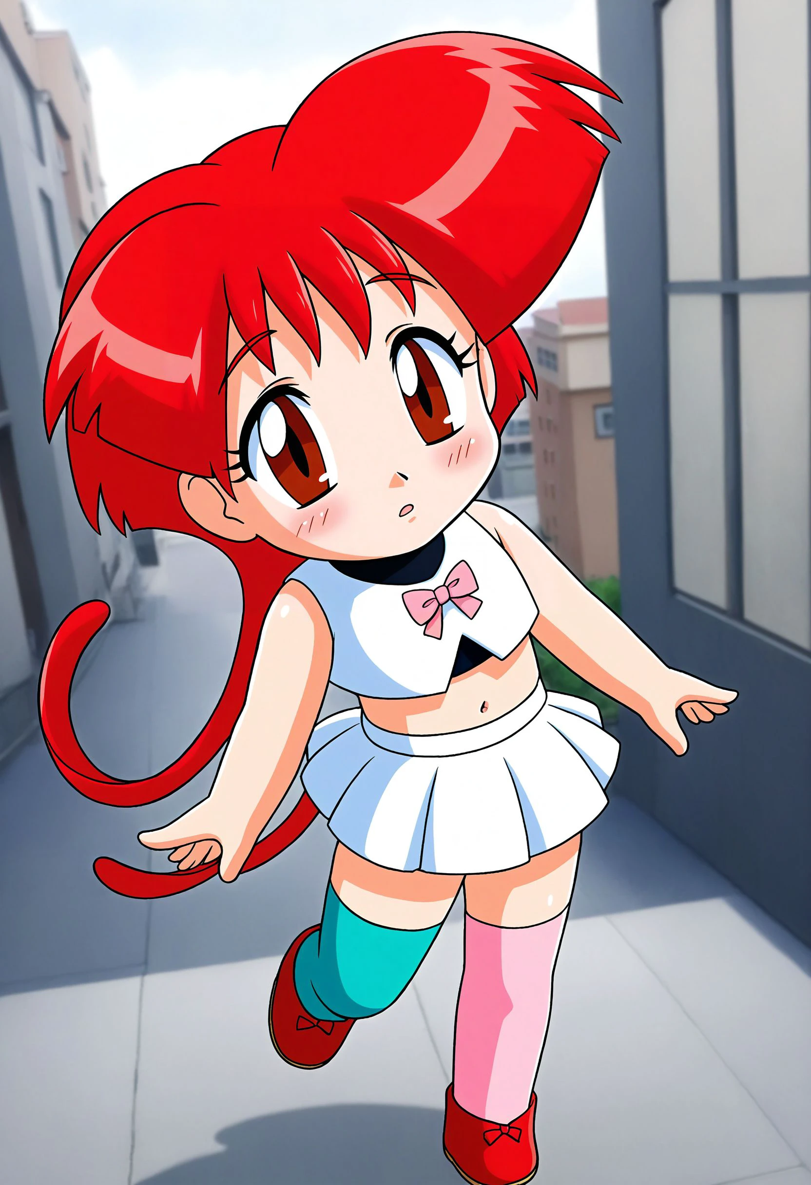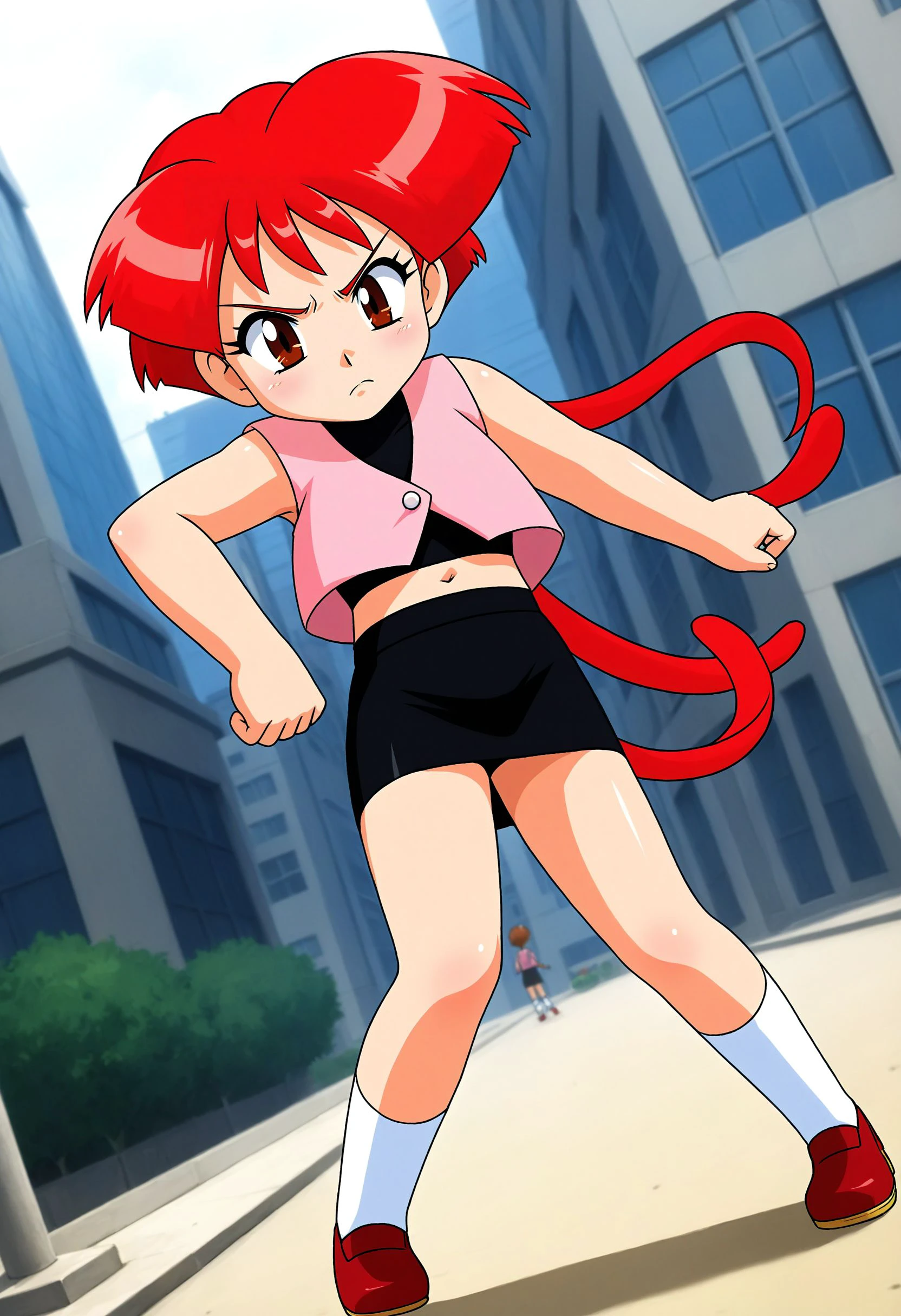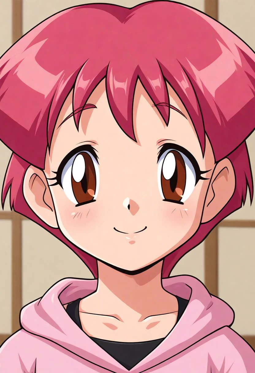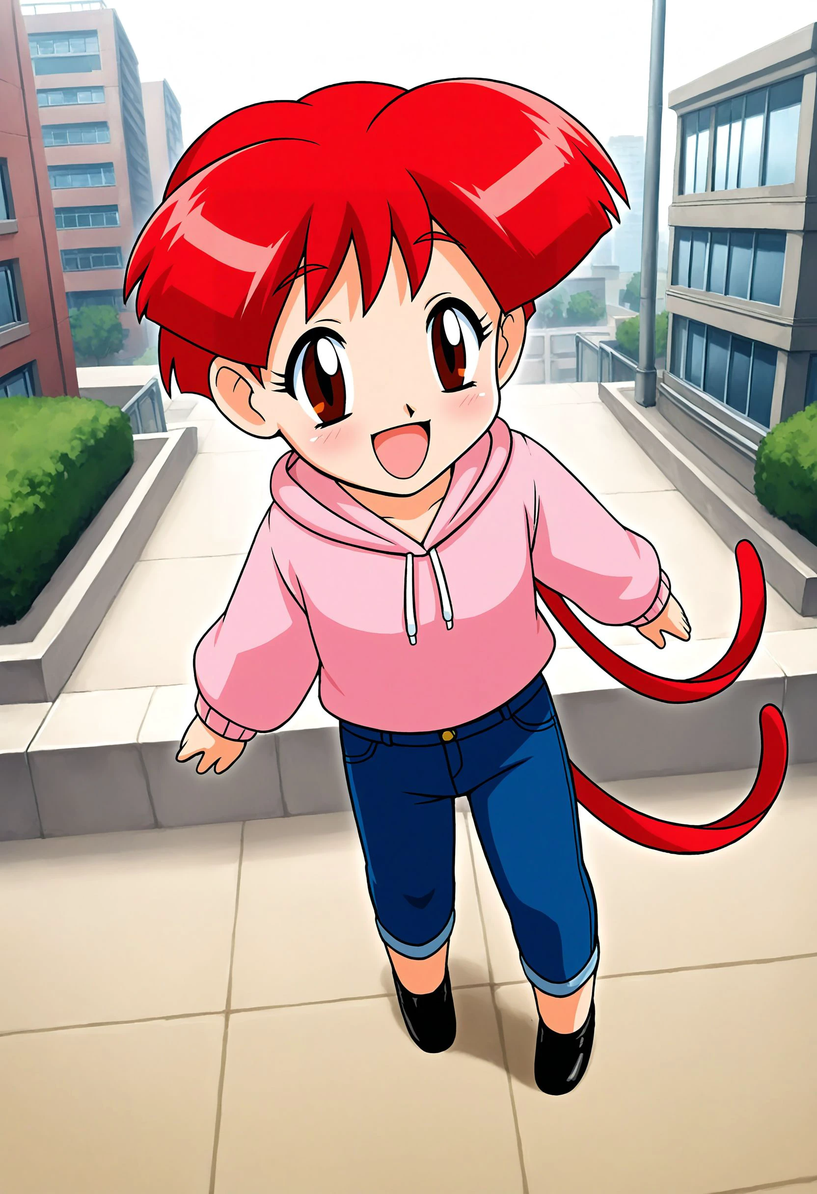 ggg-hatsunohana, red hair, red eyes, ggg-hatsunohana outfit, pink hoodie, jeans, black shoes,