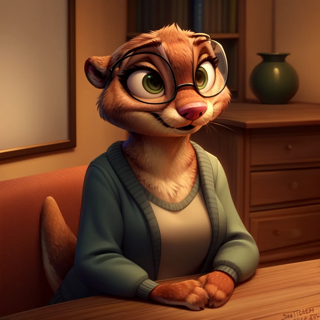 Tags, whiskers furry female, animal ears, animal nose, brown fur, otter, green eyes, mrs. otterton