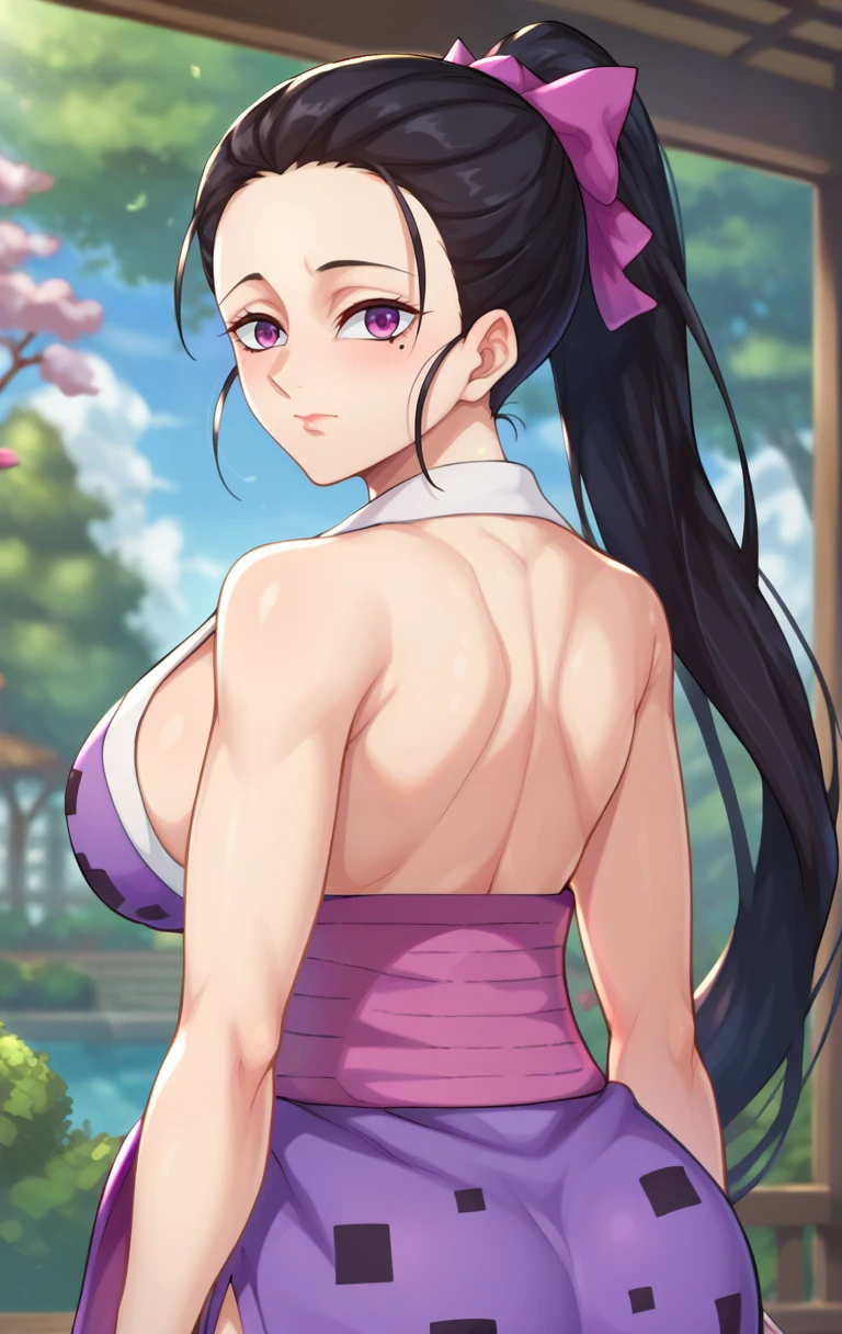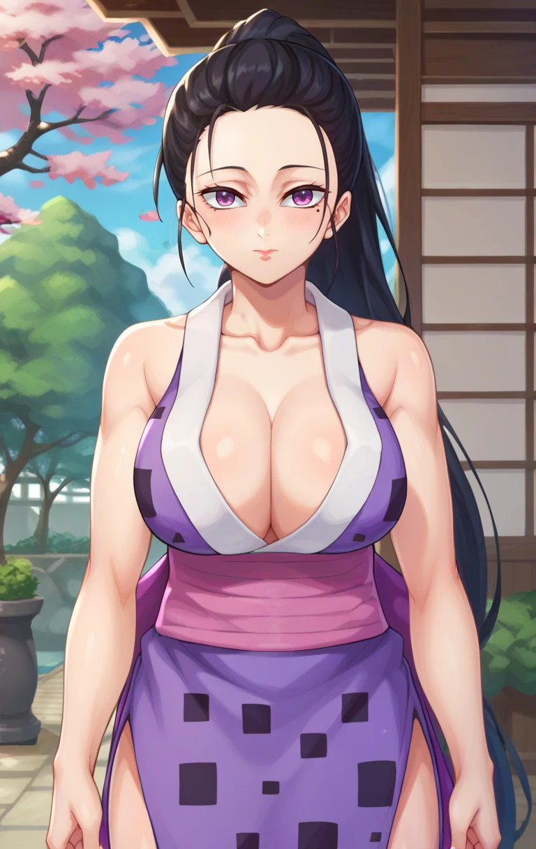 HinatsuruSDXL, 1girl, solo, long hair, looking at viewer, large breasts, black hair, cleavage, bare shoulders, purple eyes, collarbone, ponytail, japanese clothes, sleeveless, kimono, blurry, sash, garden, obi, sleeveless kimono, cowboy shot, mole under right eye,