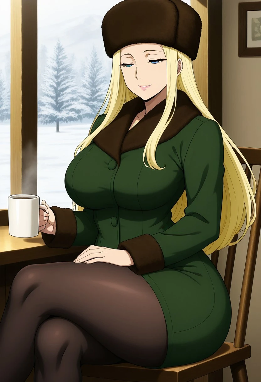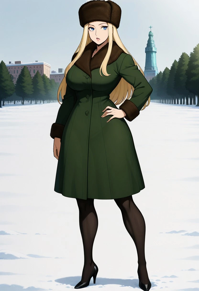 Ushanka hat, green ginger swing coat, pantyhose, black heels