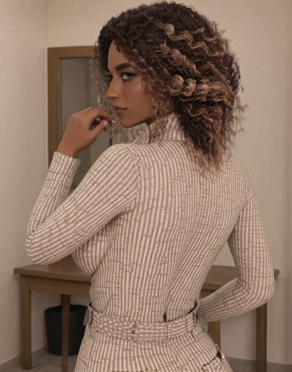 m4ckenzie, 1girl, dark skin, big breasts, bleu eyes, brown hair, curly hair, medium hair,