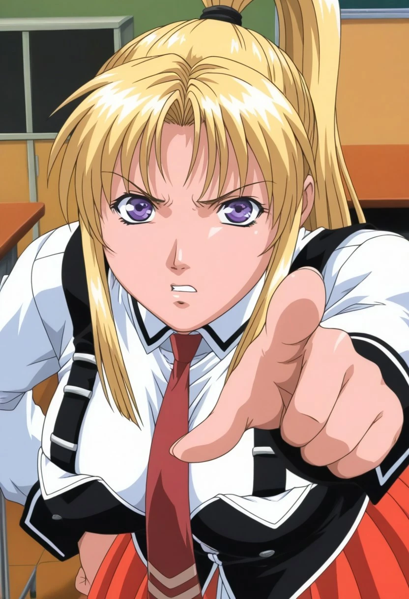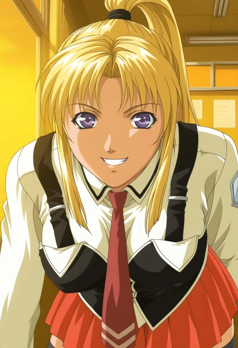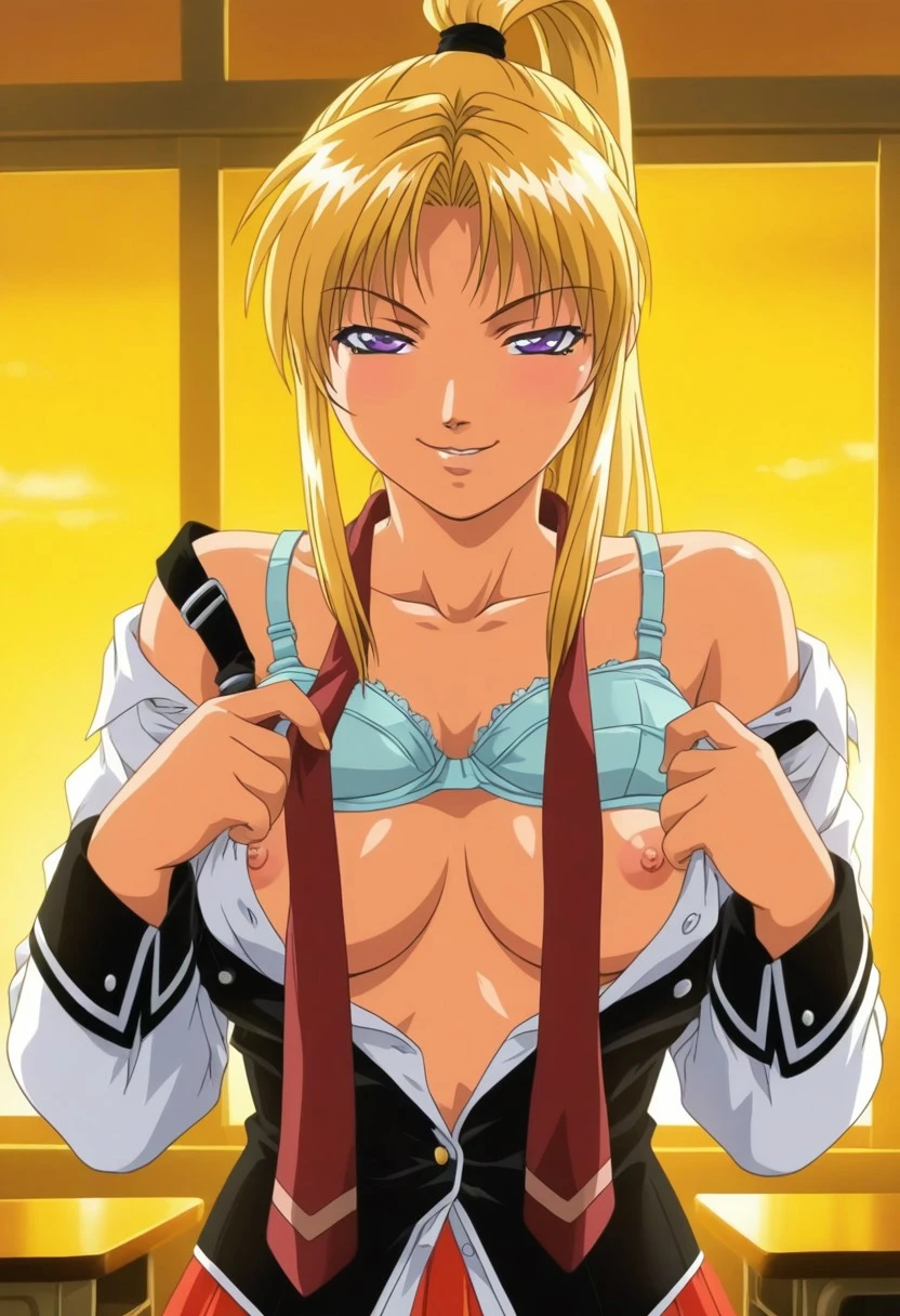 1girl, solo, saeki kaori, blonde hair, high ponytail, sidelocks, purple eyes,