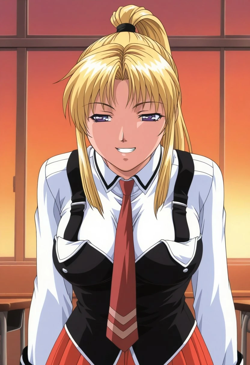 , 1girl, solo, saeki kaori, blonde hair, high ponytail, sidelocks, purple eyes, grin, dark purple robe,