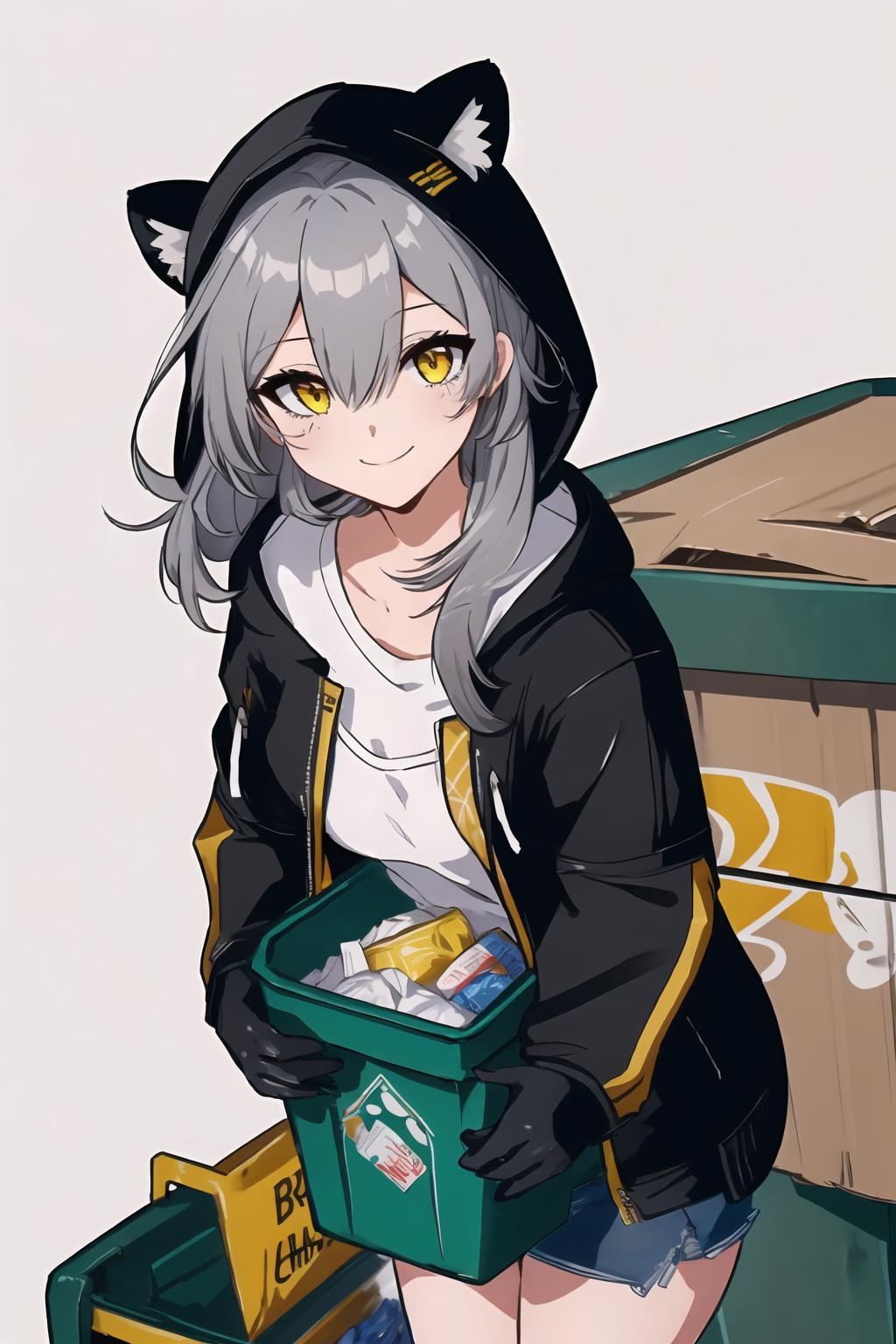 female trailblazer, long_hair, bangs, shirt, gloves, hair_between_eyes, closed_mouth, jacket, yellow_eyes, white_shirt, grey_hair, black_gloves, hoodi guess that is all, thanks you....