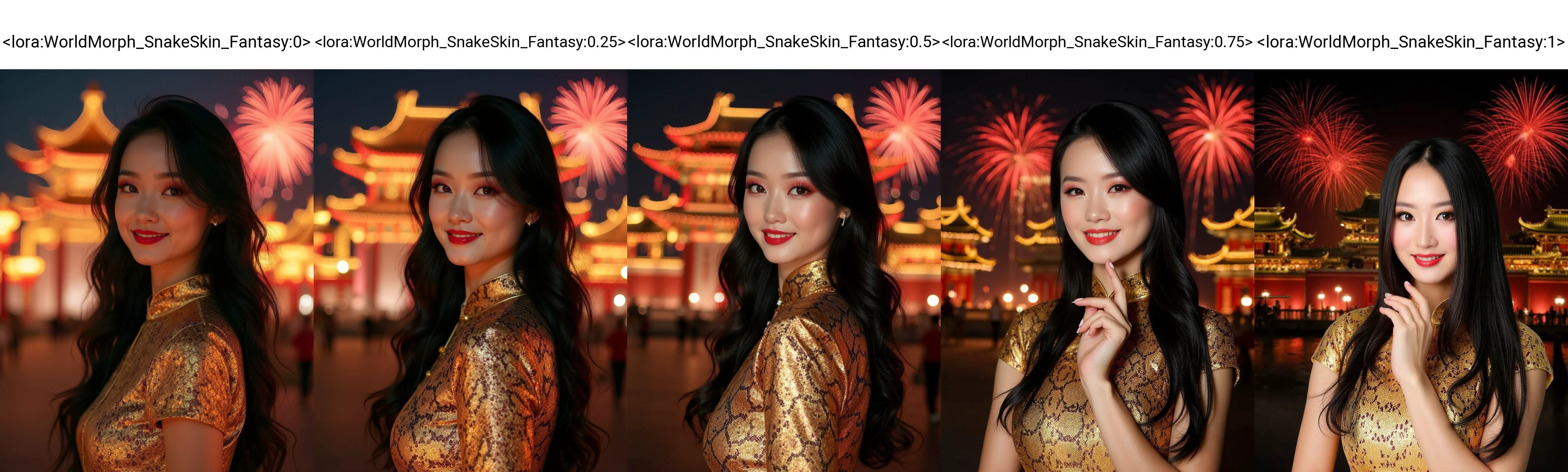 SnakeSkin Fantasy is my 2nd LoRA (and my first Flux LoRA!). I made this for celebrating the Year of the Snake. There are some great snake skin LoRAs in the site already from some amazing creators, but I wanted to try and make the snake skin effect a bit different. So this LoRA tries to add more detailed and contrasty colors for the snake scale patterns, rather than only focusing on the scales effect. Also, different male & female clothing items and accessories like hats, shoes...etc should be possible too. Trained on 60 images with the On-Site CivitAI Trainer. I'm not experienced in LoRA training so there might be a lot of errors and mistakes in this, so bear with me! Your feedback is highly appreciated! Thanks a Lot!!