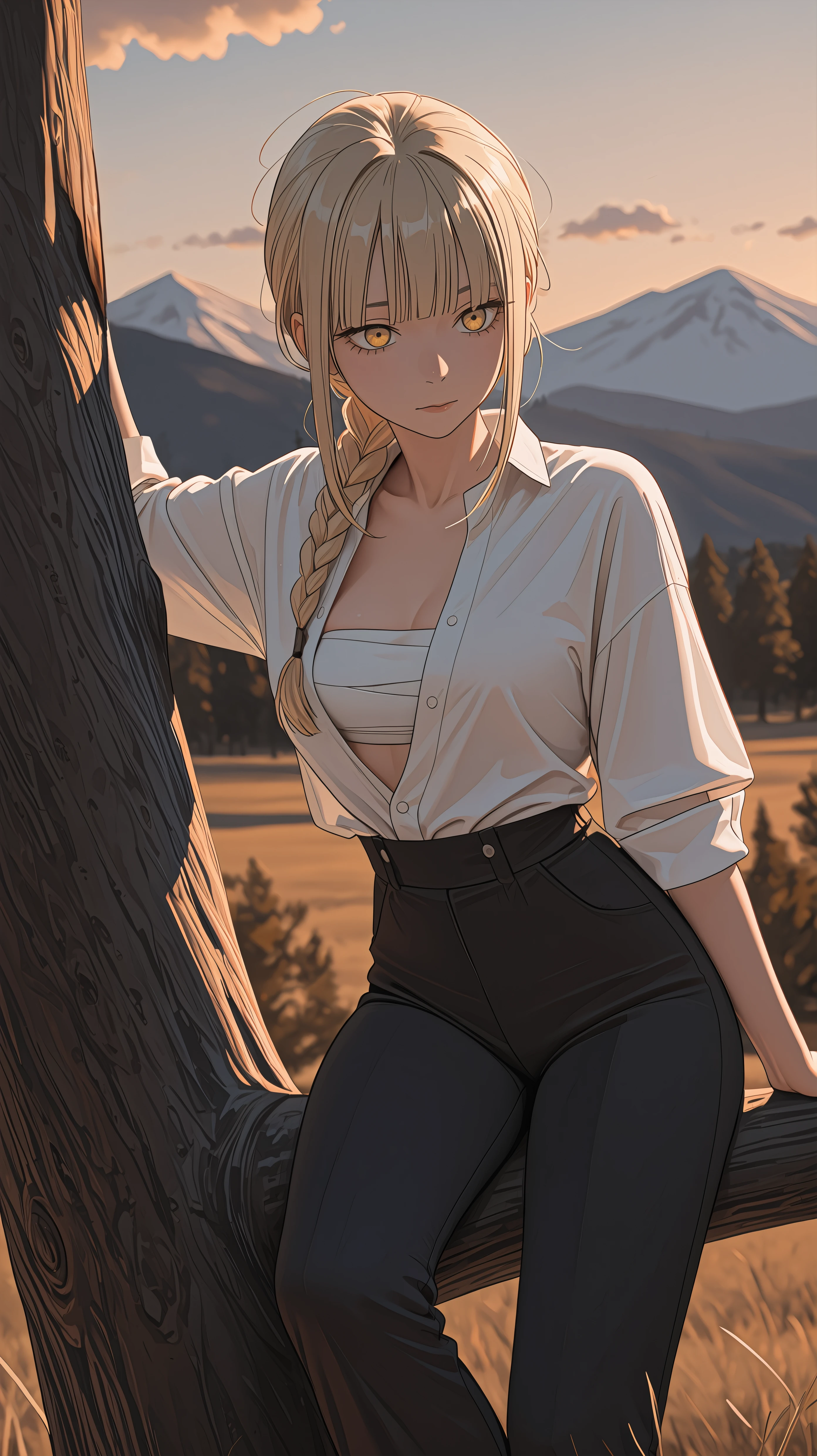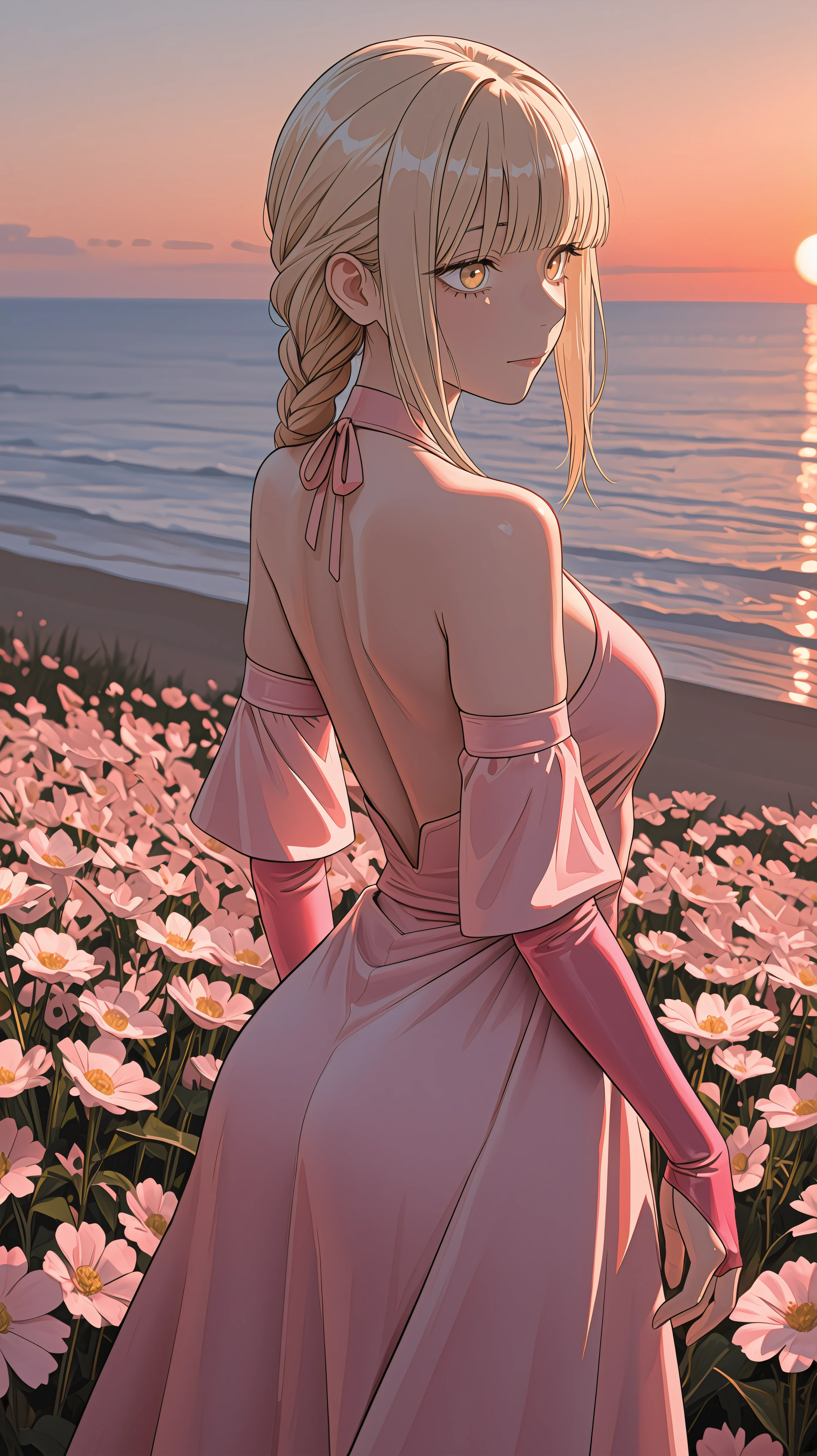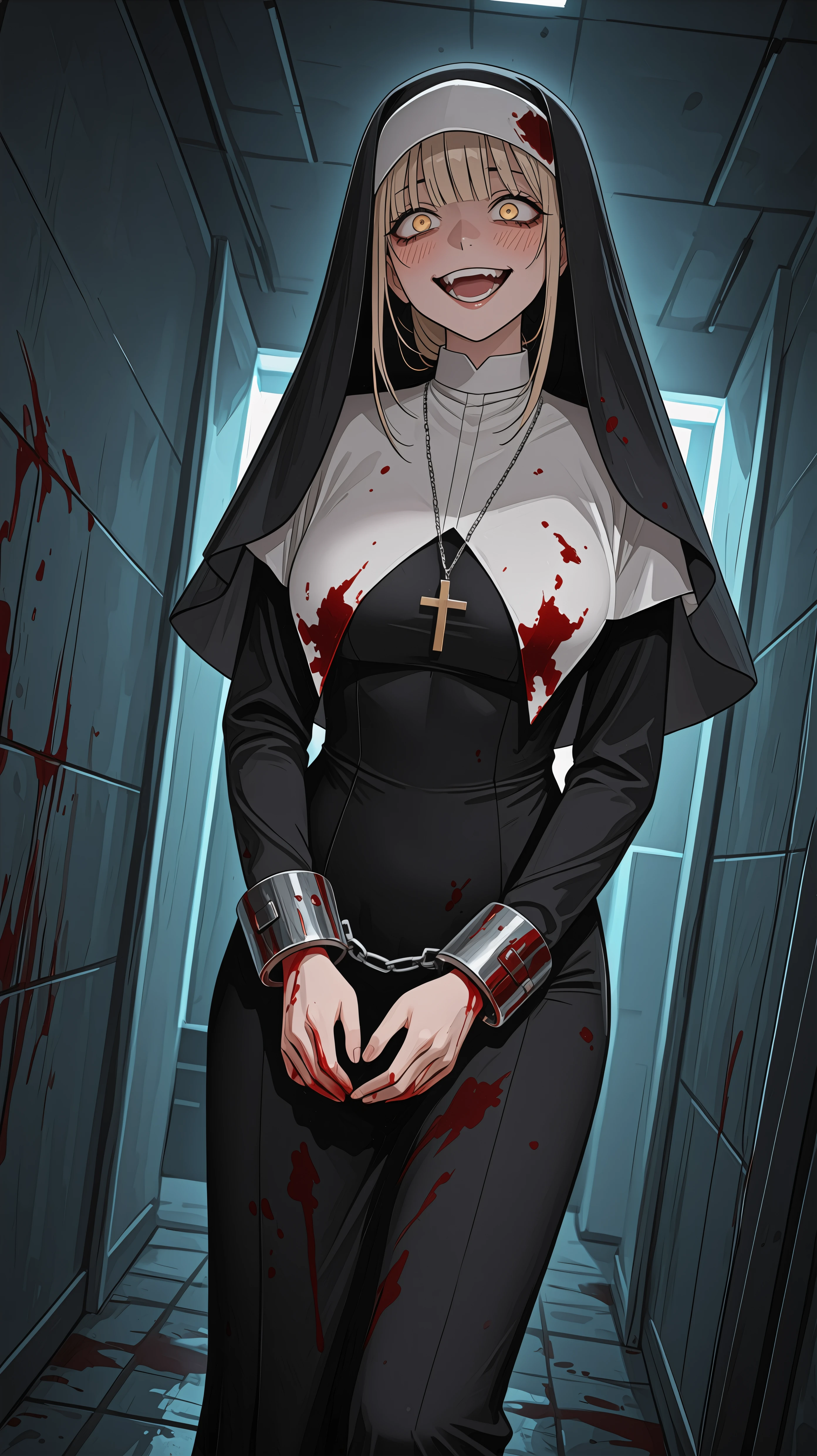 mira_mdud, blonde hair, sidelocks, blunt bangs, desaturated yellow eyes, nun outfit, nun headdress, cross necklace,Description