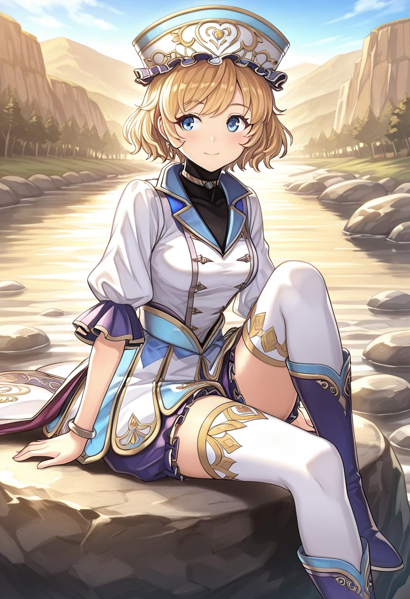 Trigger Words (Outfit): two-tone hat, black turtleneck, choker, blue sailor collar, white dress, short sleeves, puffy sleeves, purple frills, bracelet, two-tone skirt, purple bloomers, white thighhighs, purple boots, high heel boots,