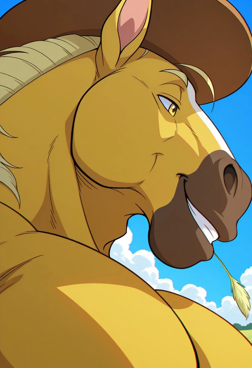 Outfit Prompts: "brown cowboy hat, yellow stalk in mouth"
