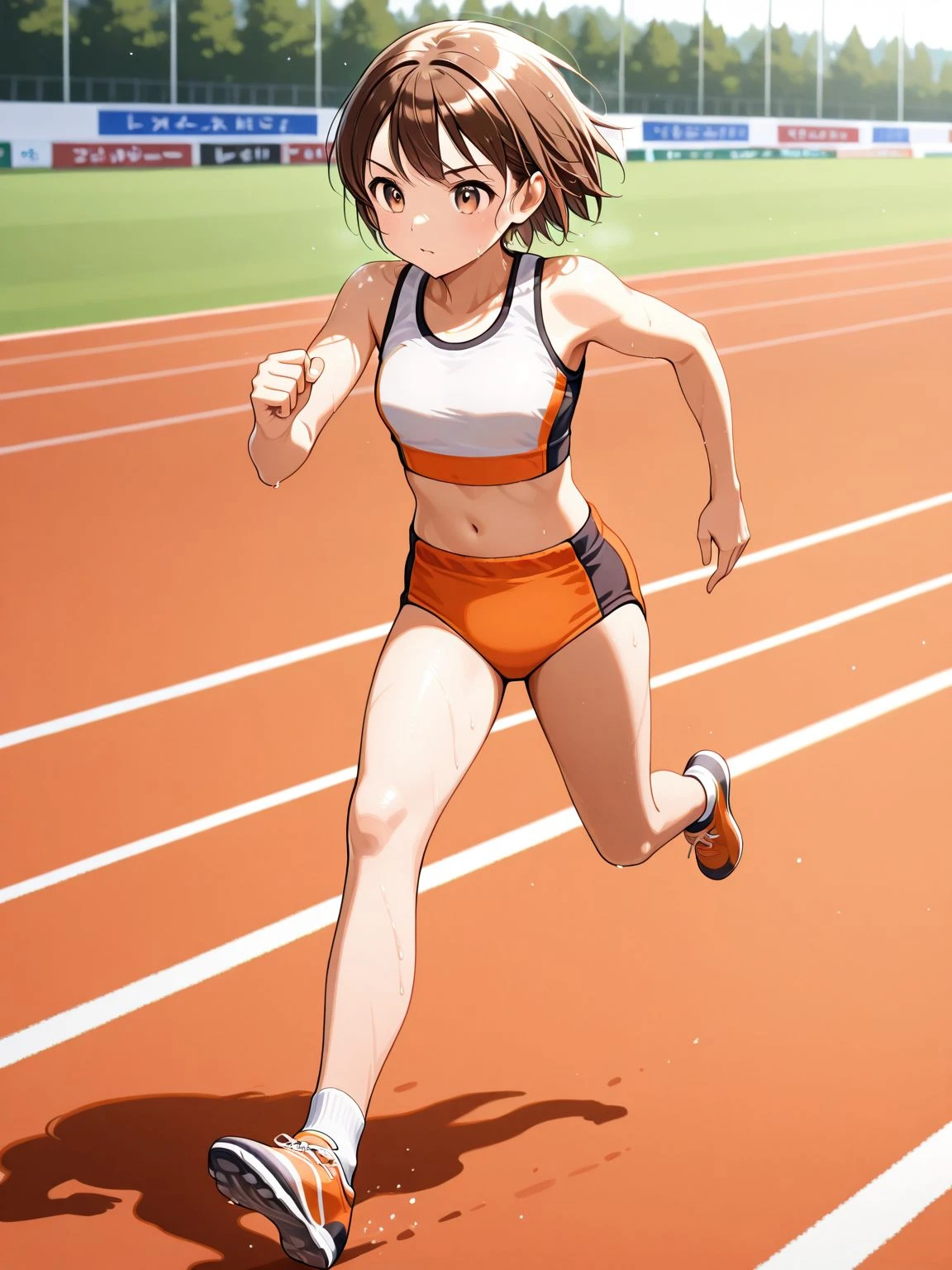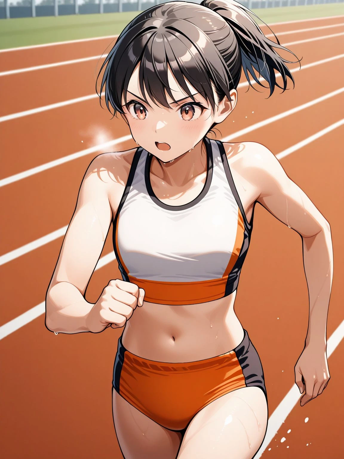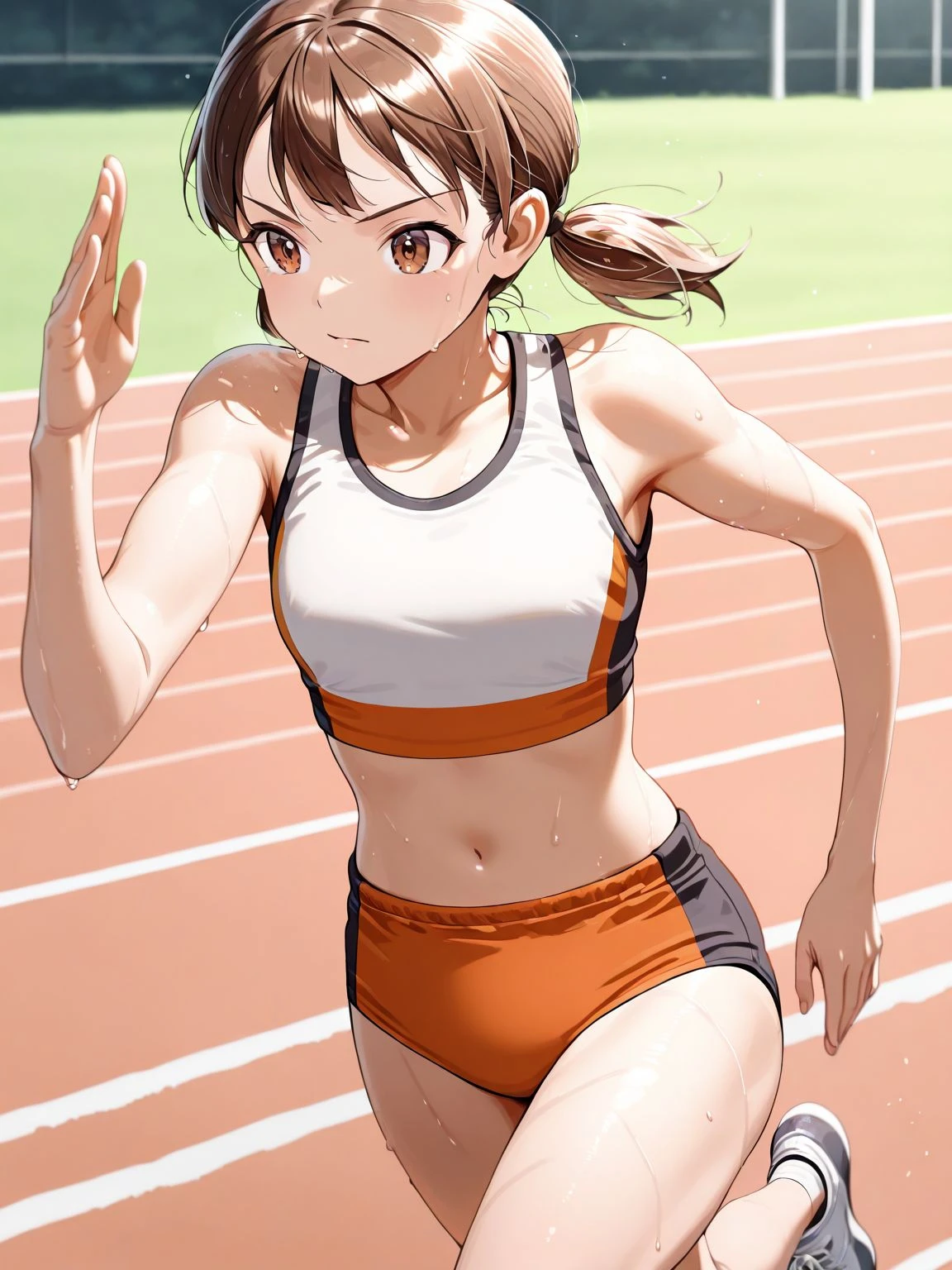 trackuni, track uniform,buruma, sportswear,sports bra, track and field,sports bikini,orange shorts, white sports bra,bare shoulders,two-tone sports bra,crop top,midriff,