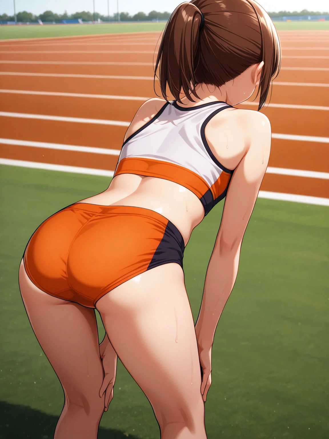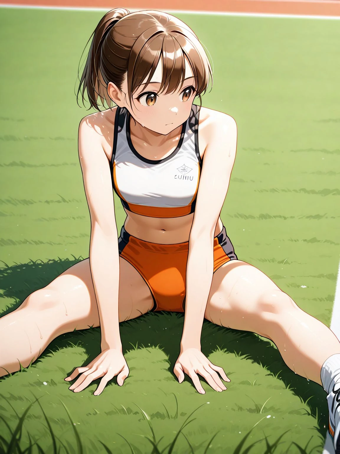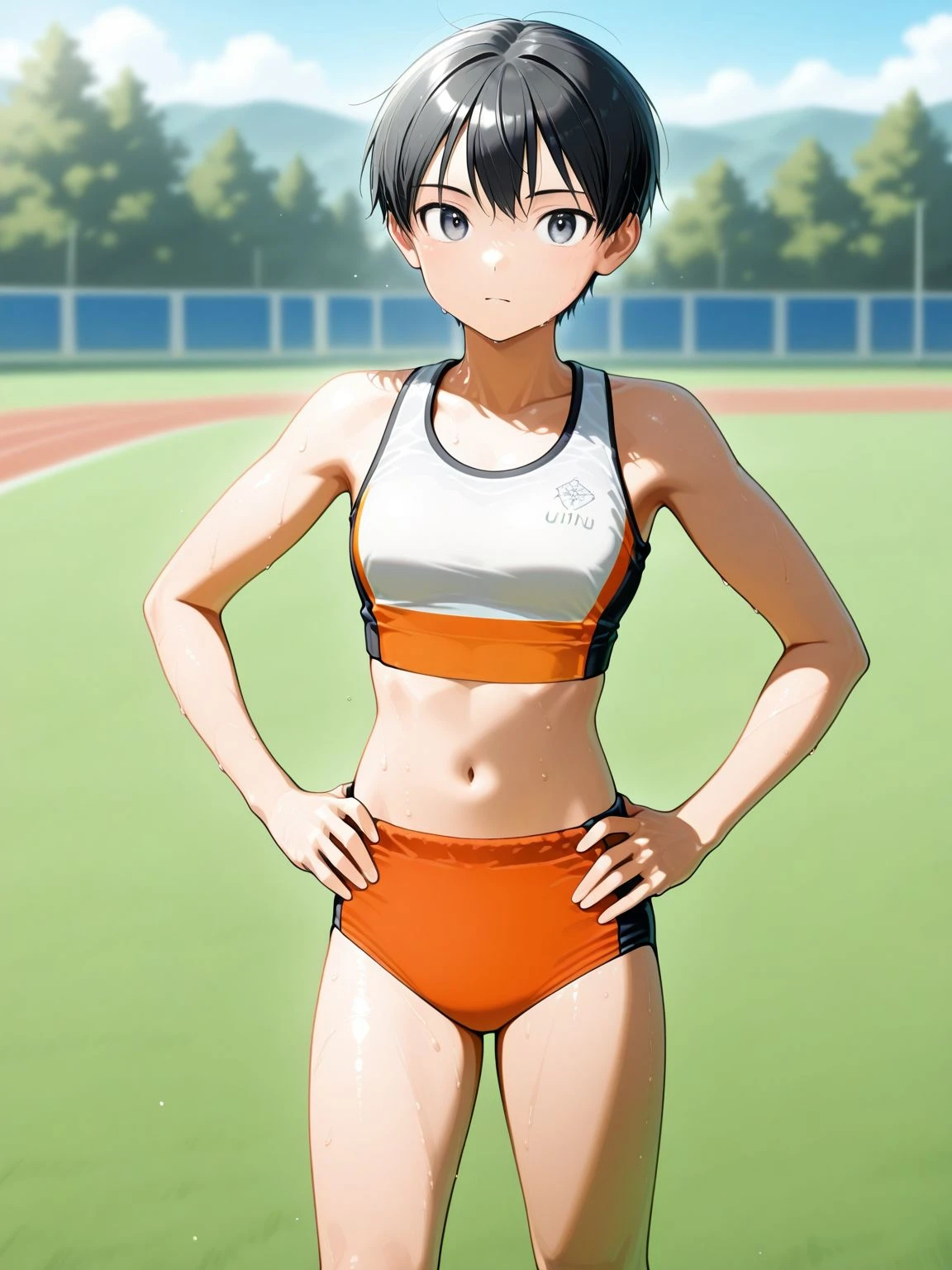 trackuni, track uniform,buruma, sportswear,sports bra, track and field,sports bikini,orange shorts, white sports bra,bare shoulders,two-tone sports bra,crop top,midriff,