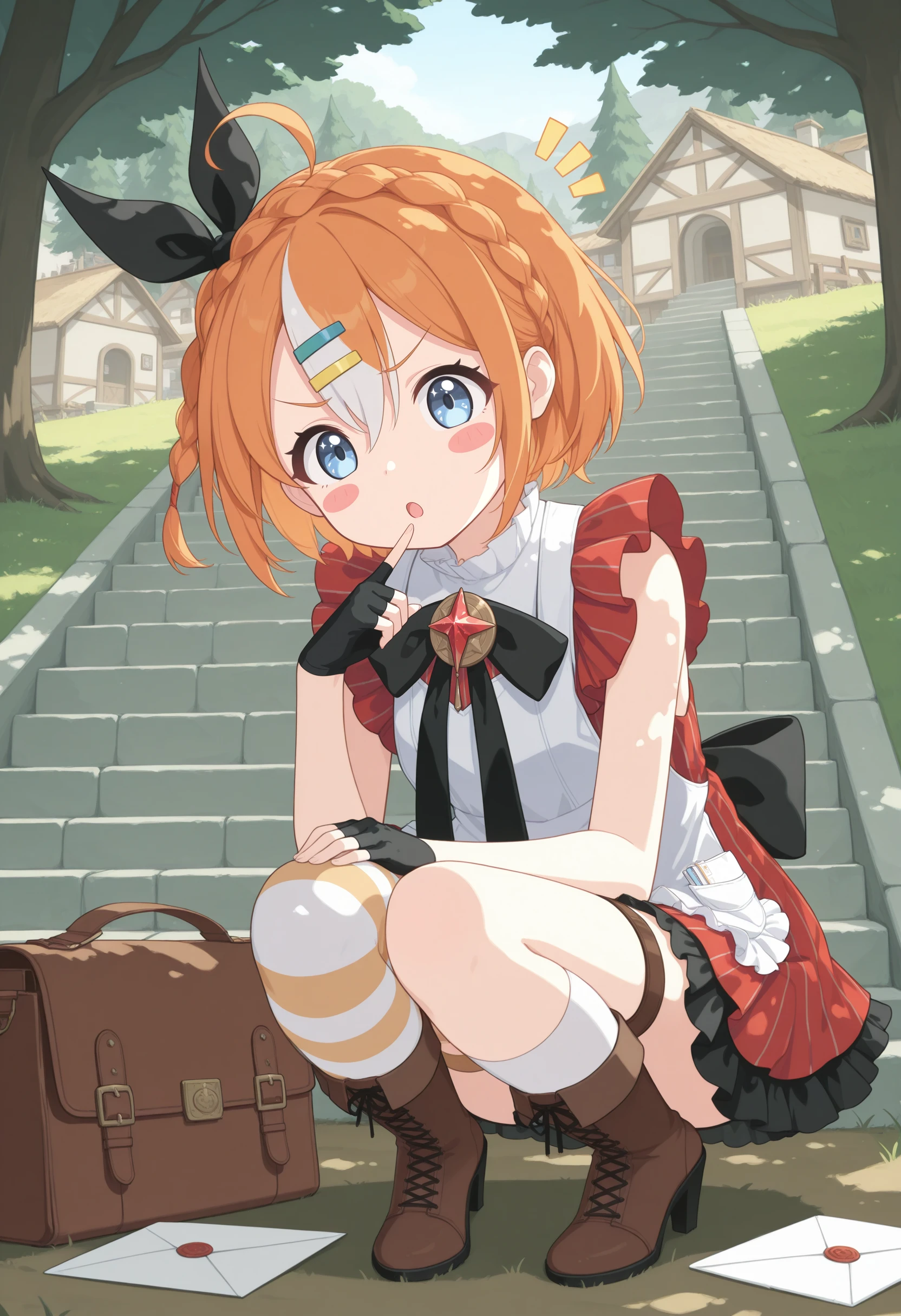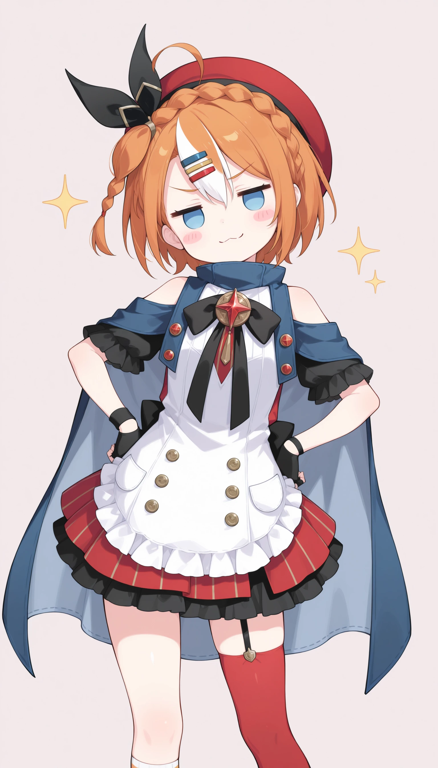 stell4donn4b0w, blue eyes, blonde hair, colored bangs, two-tone hair, short hair, crown braid, side braid, parallel hairclip, ahoge, blush stickers, hair ribbon, red beret,Trekker - Character Outfit
