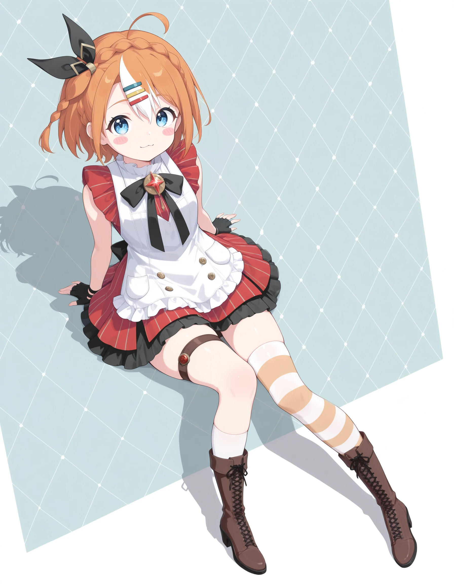 red dress, sleeveless dress, vertical-striped clothes, frilled dress, layered dress, black bowtie, brooch, frilled apron, pocket, buttons, black bow, black gloves, fingerless gloves, brown thigh strap, asymmetrical legwear, striped thighhighs, white socks, single sock, single thighhigh, brown knee boots, lace-up boots, high heels,Trekker- Base Appearance