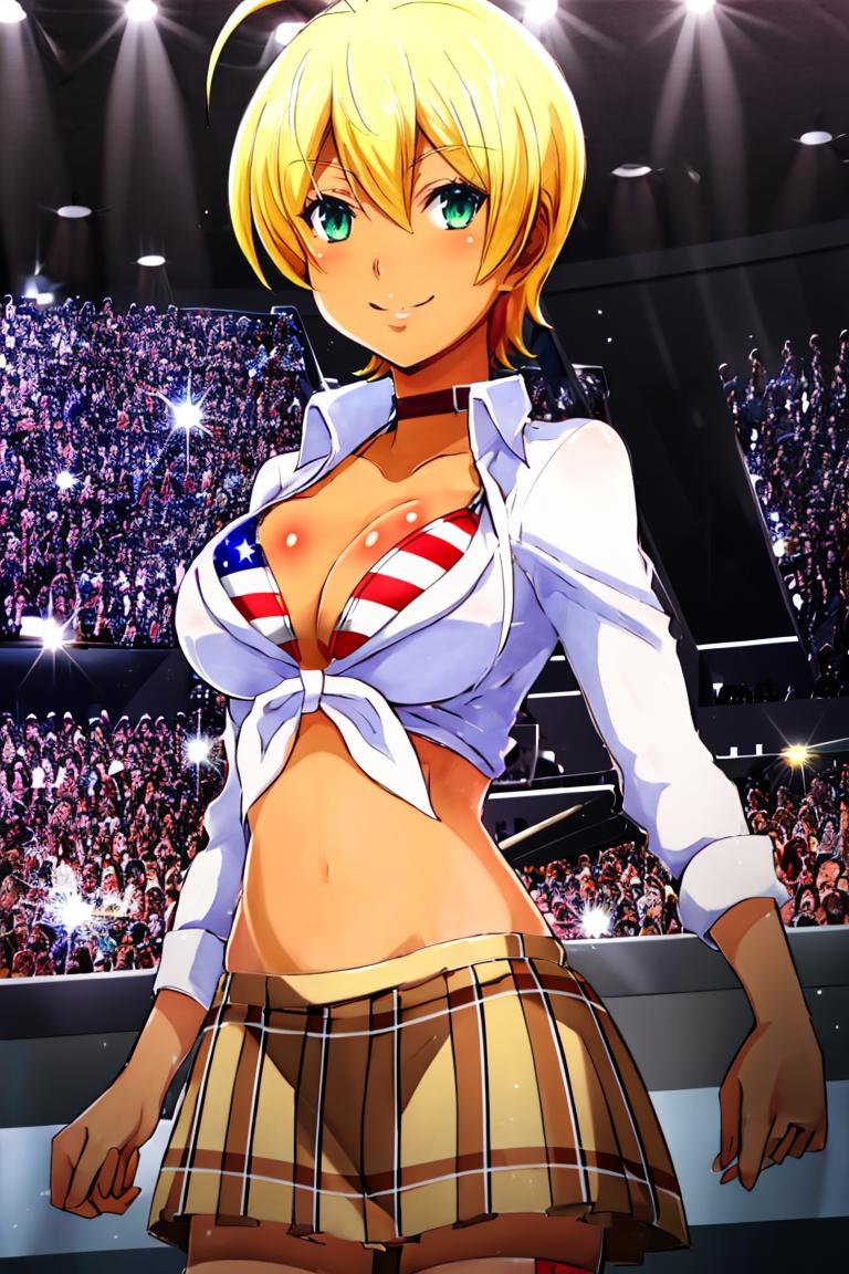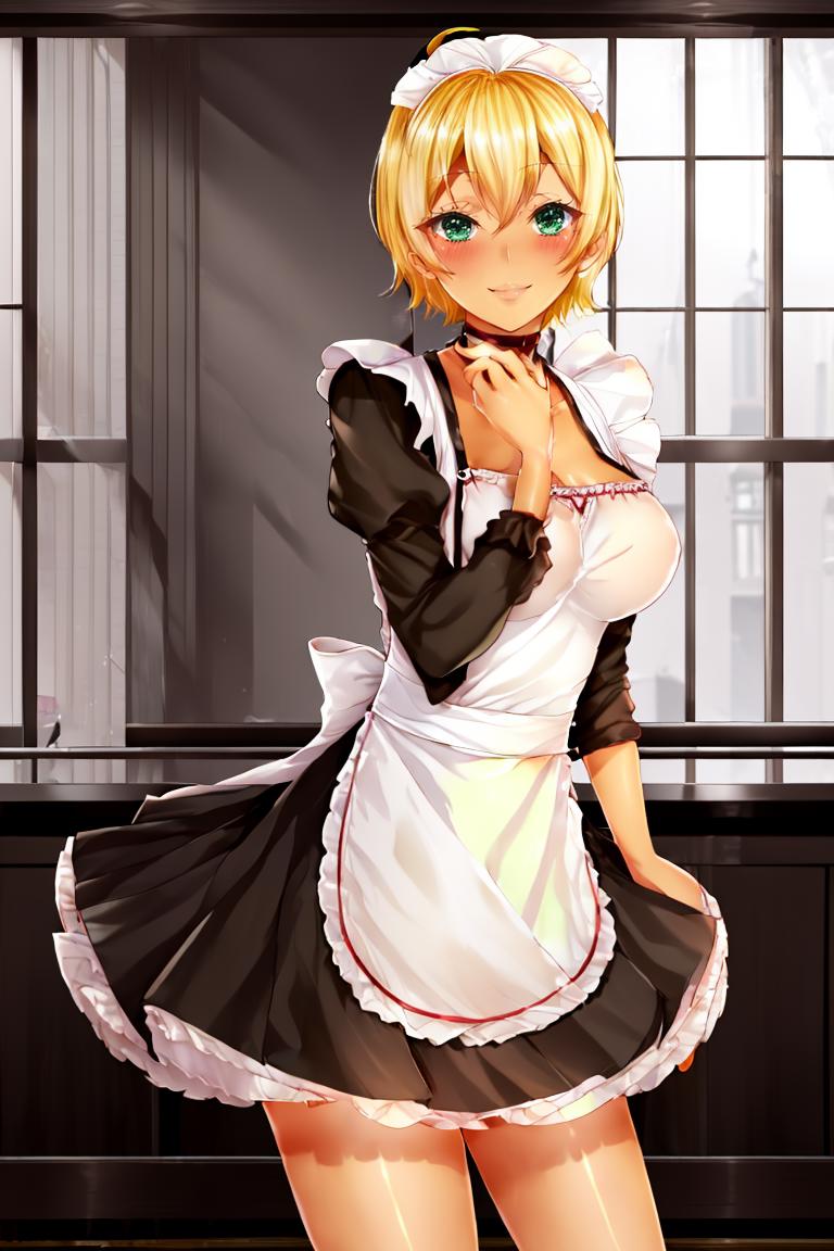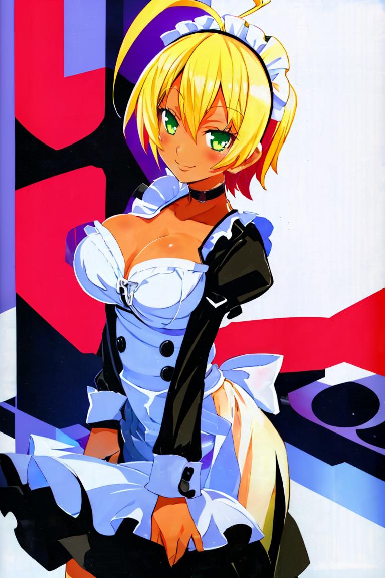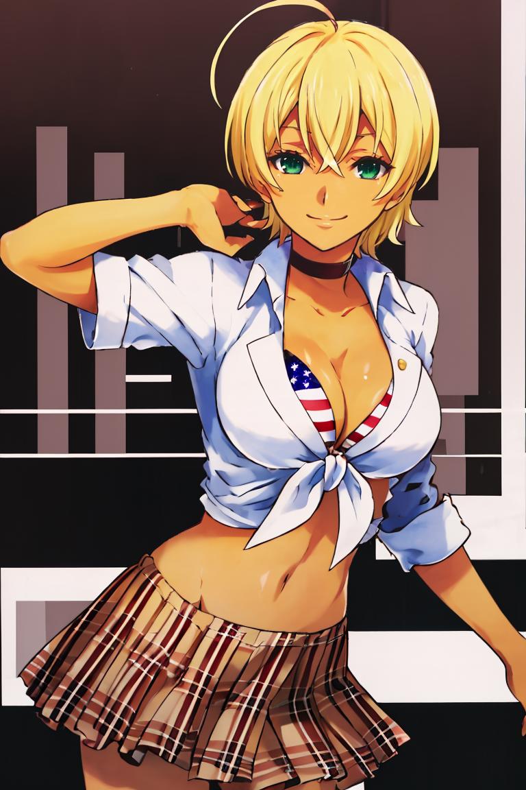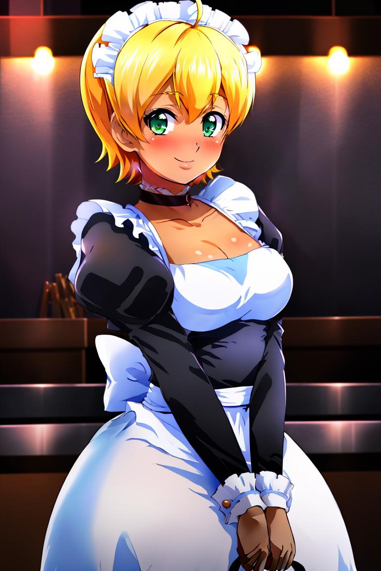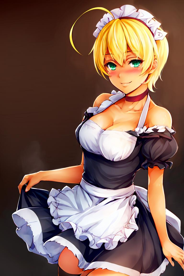 Mito_Ikumi_Shokugeki, blonde hair, dark skin, green eyes, short hair, 1girl, solo, ahoge, choker,