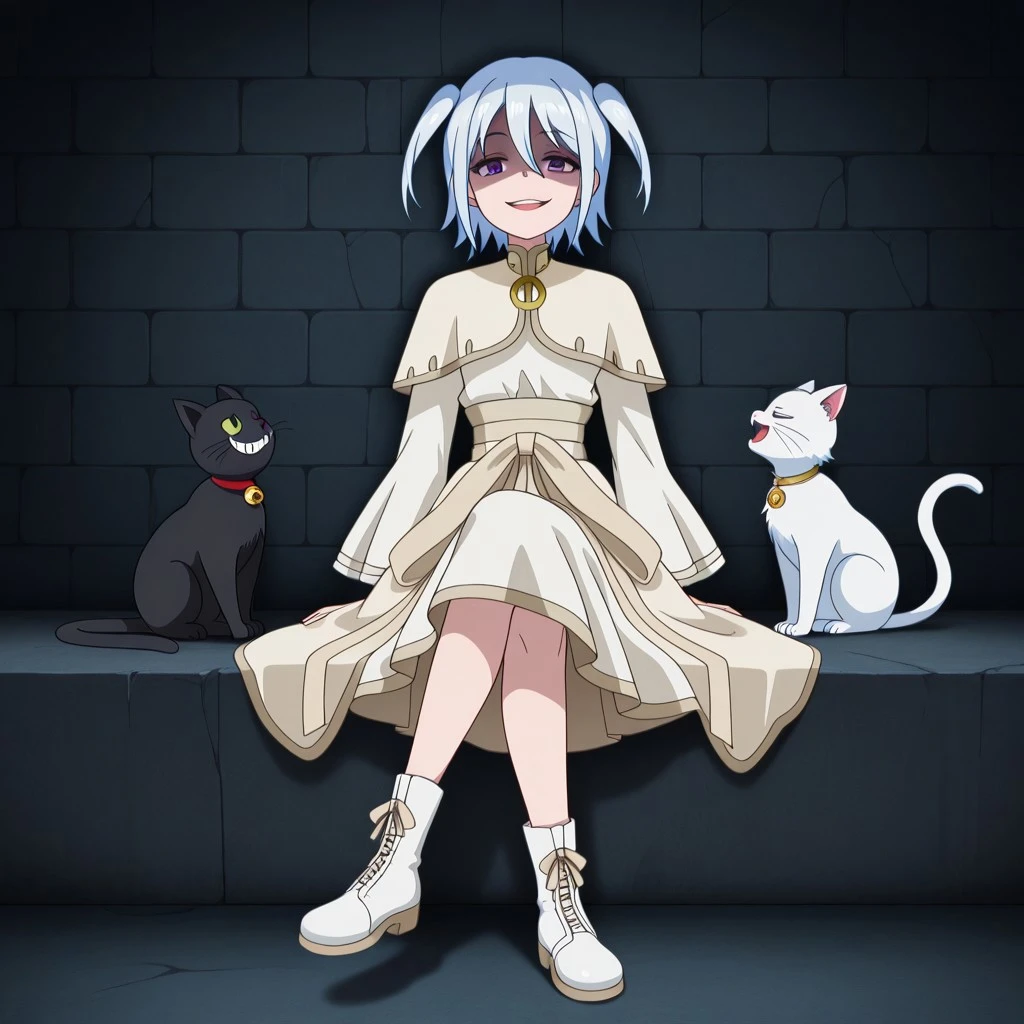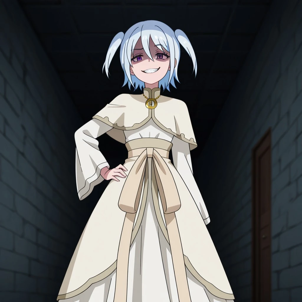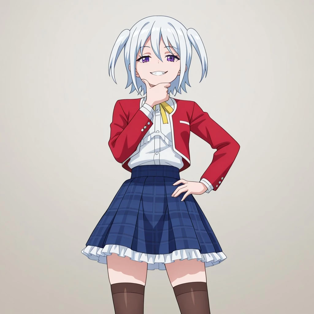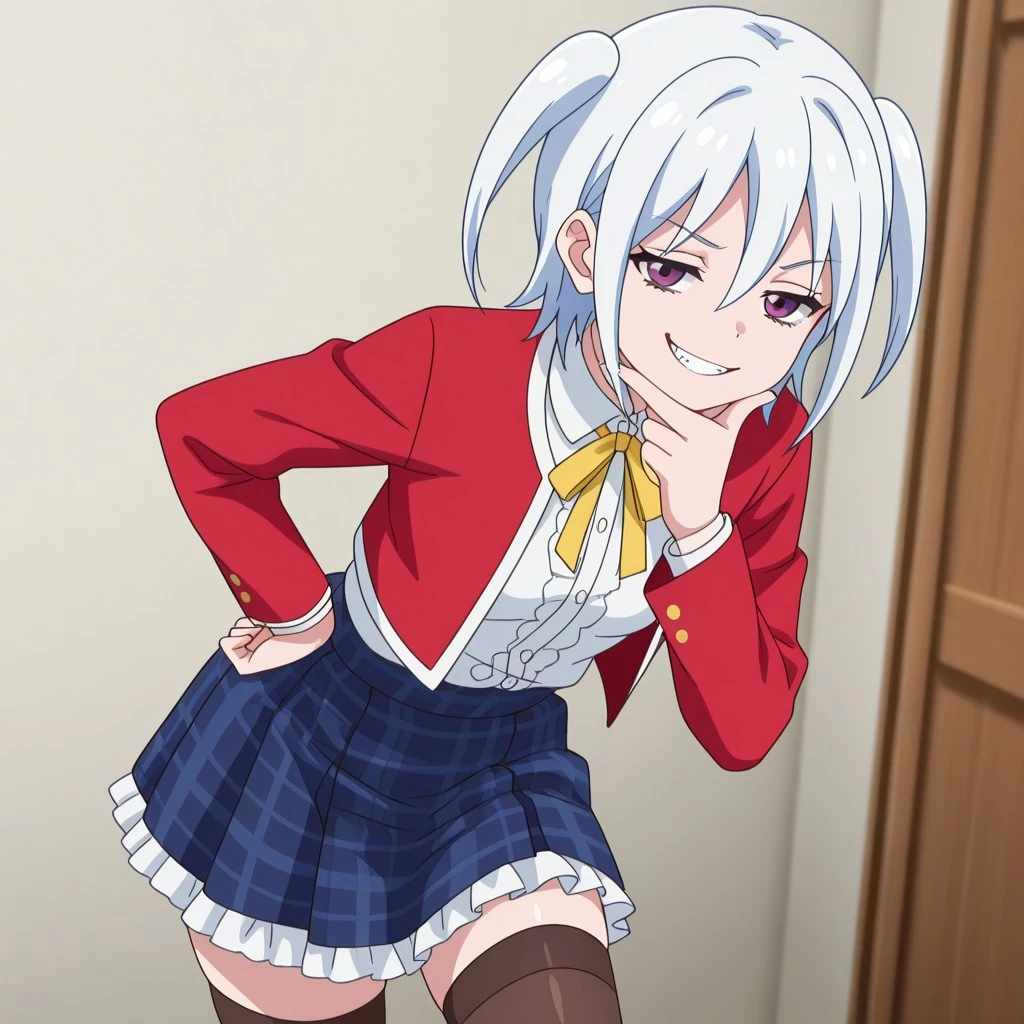 Character: 1girl, white hair, short hair, small twintails, purple eyes, small breasts,