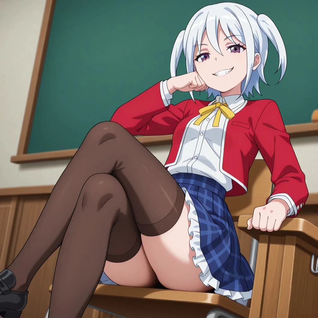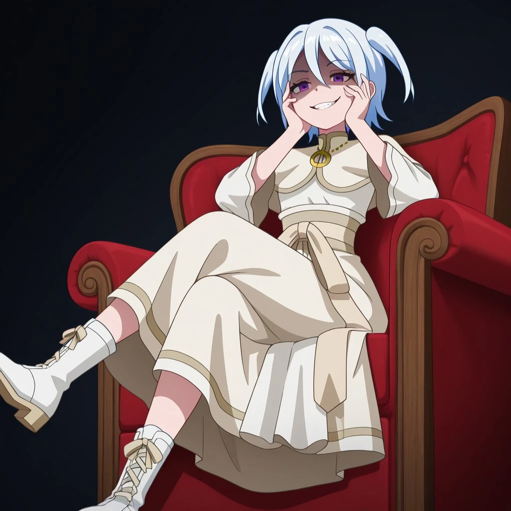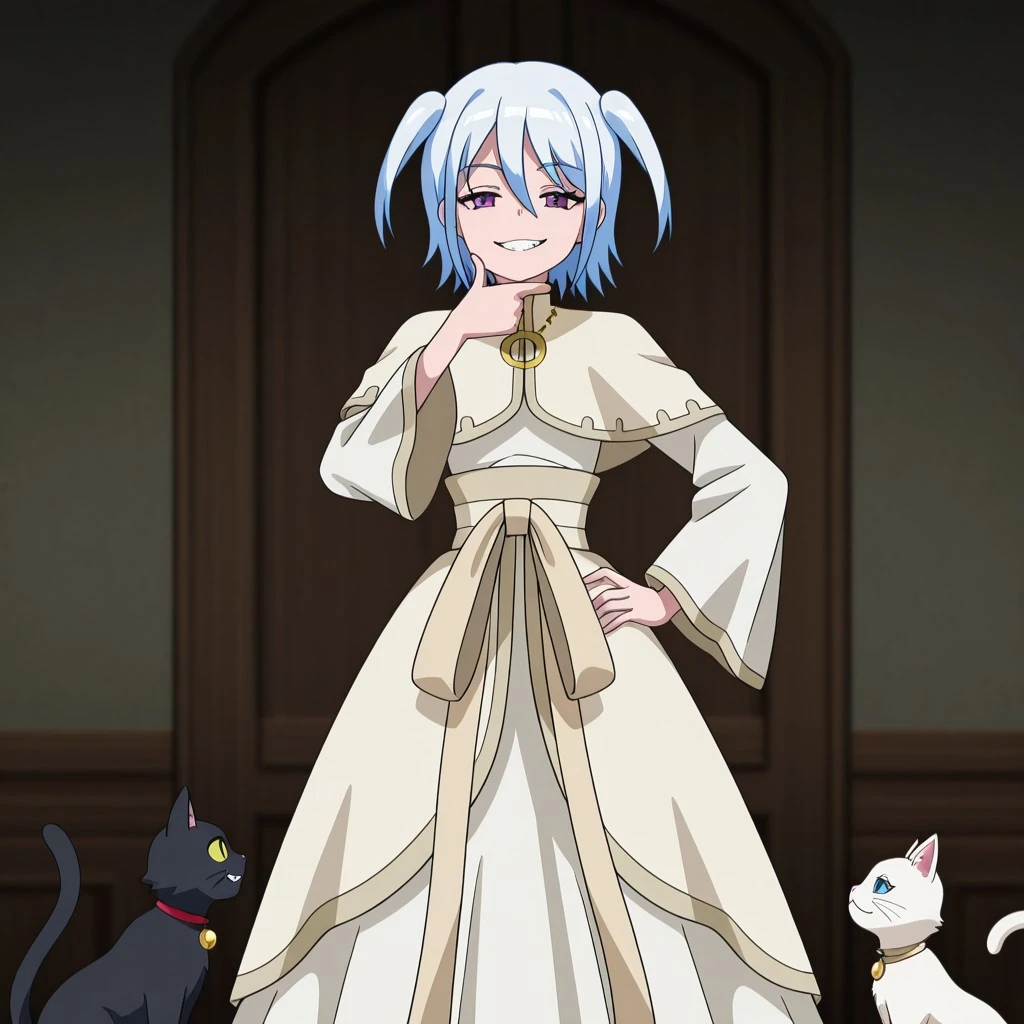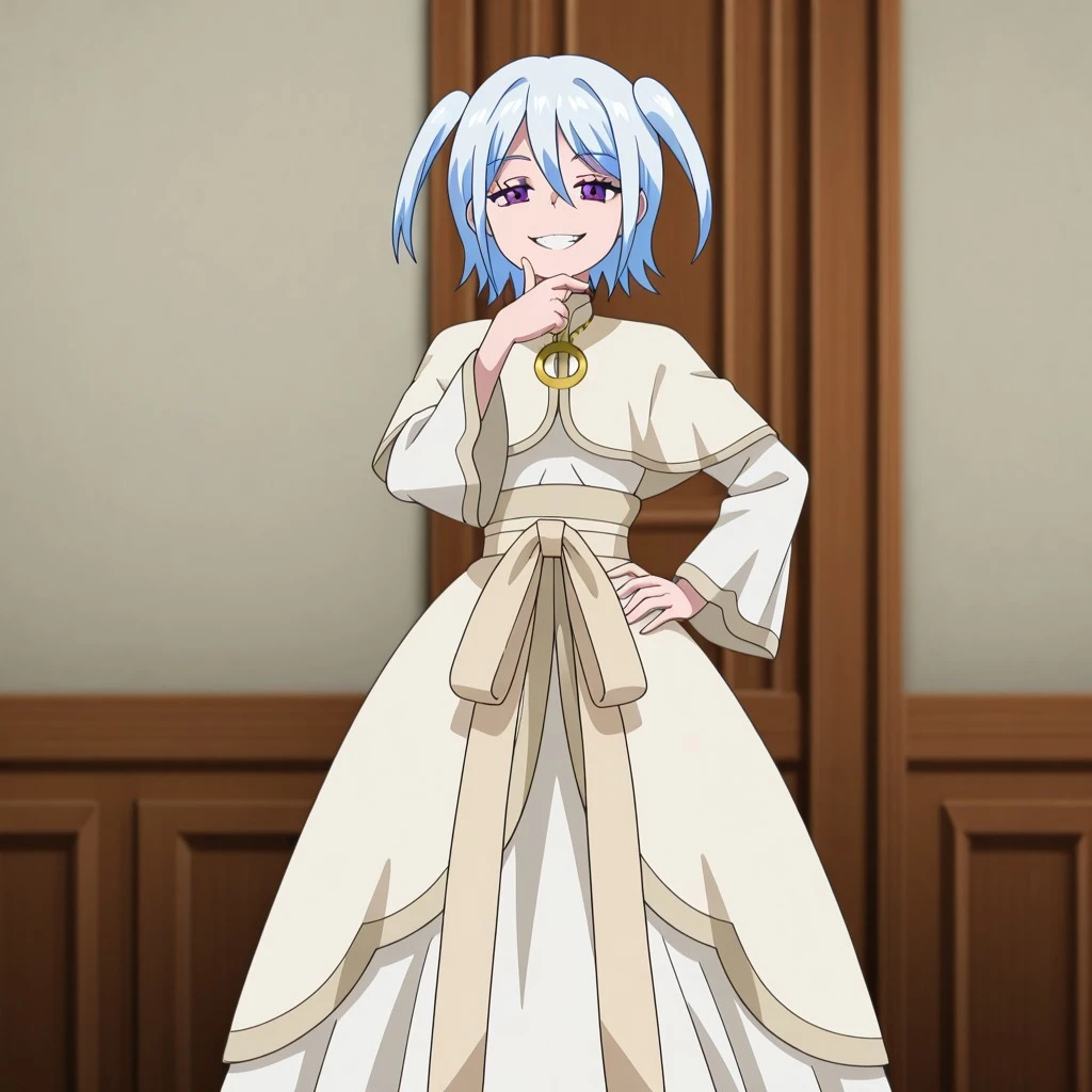 Character: 1girl, white hair, short hair, small twintails, purple eyes, small breasts,
