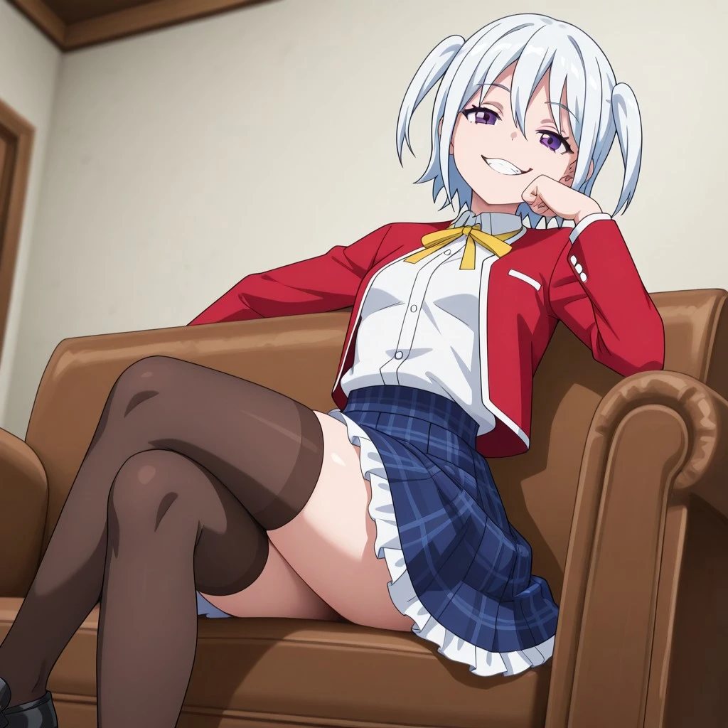 1girl, white hair, short hair, small twintails, purple eyes, small breasts,