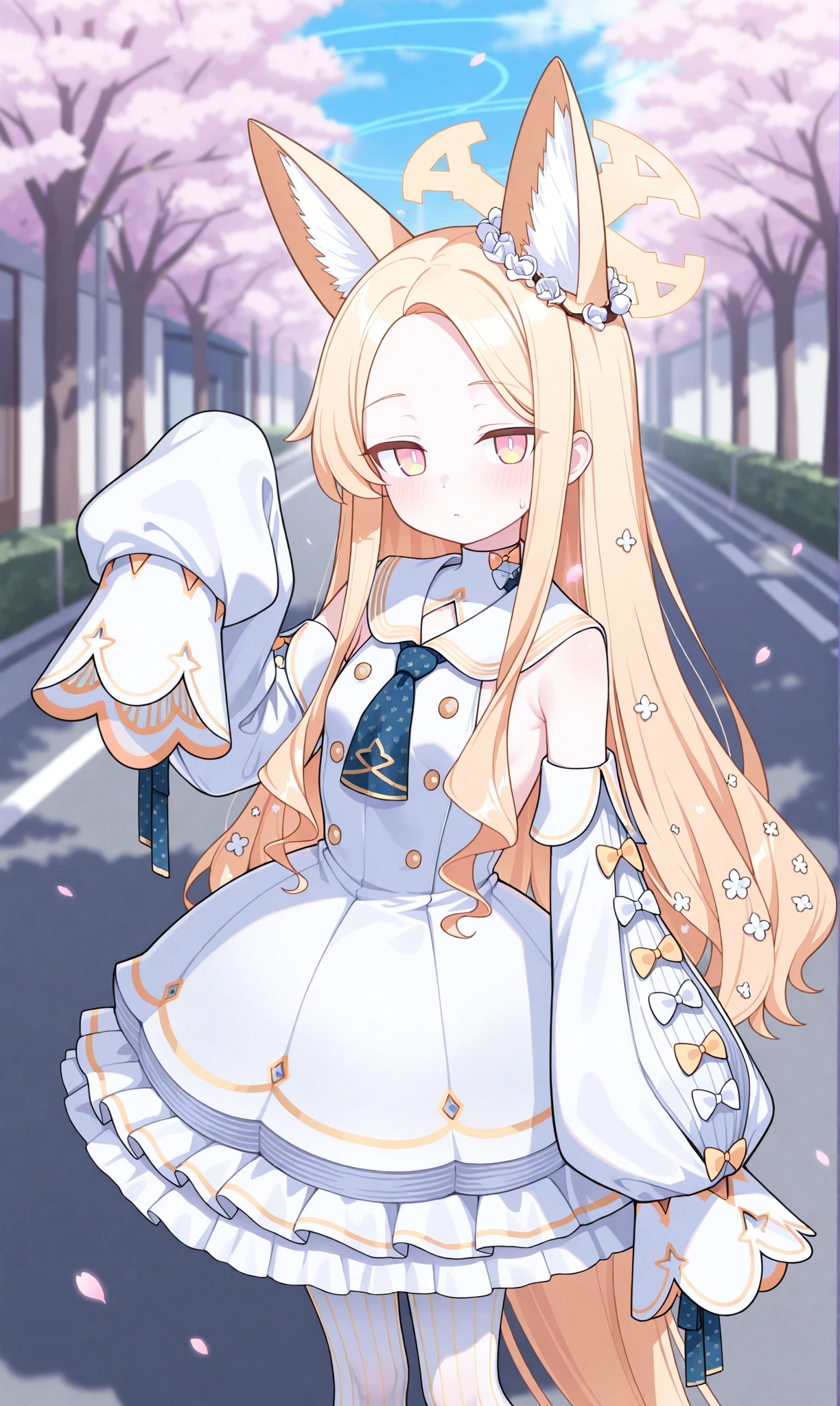 white dress, frilled dress, sleeveless dress, white sailor collar, blue necktie, detached sleeves, puffy sleeves, sleeves past wrists, sleeves past fingers, white pantyhose, vertical-striped pantyhose, white footwear, high heelsDescription