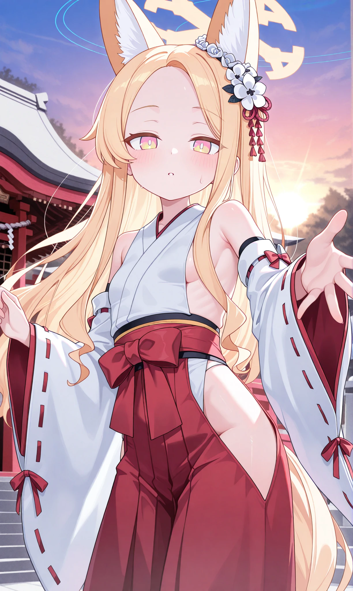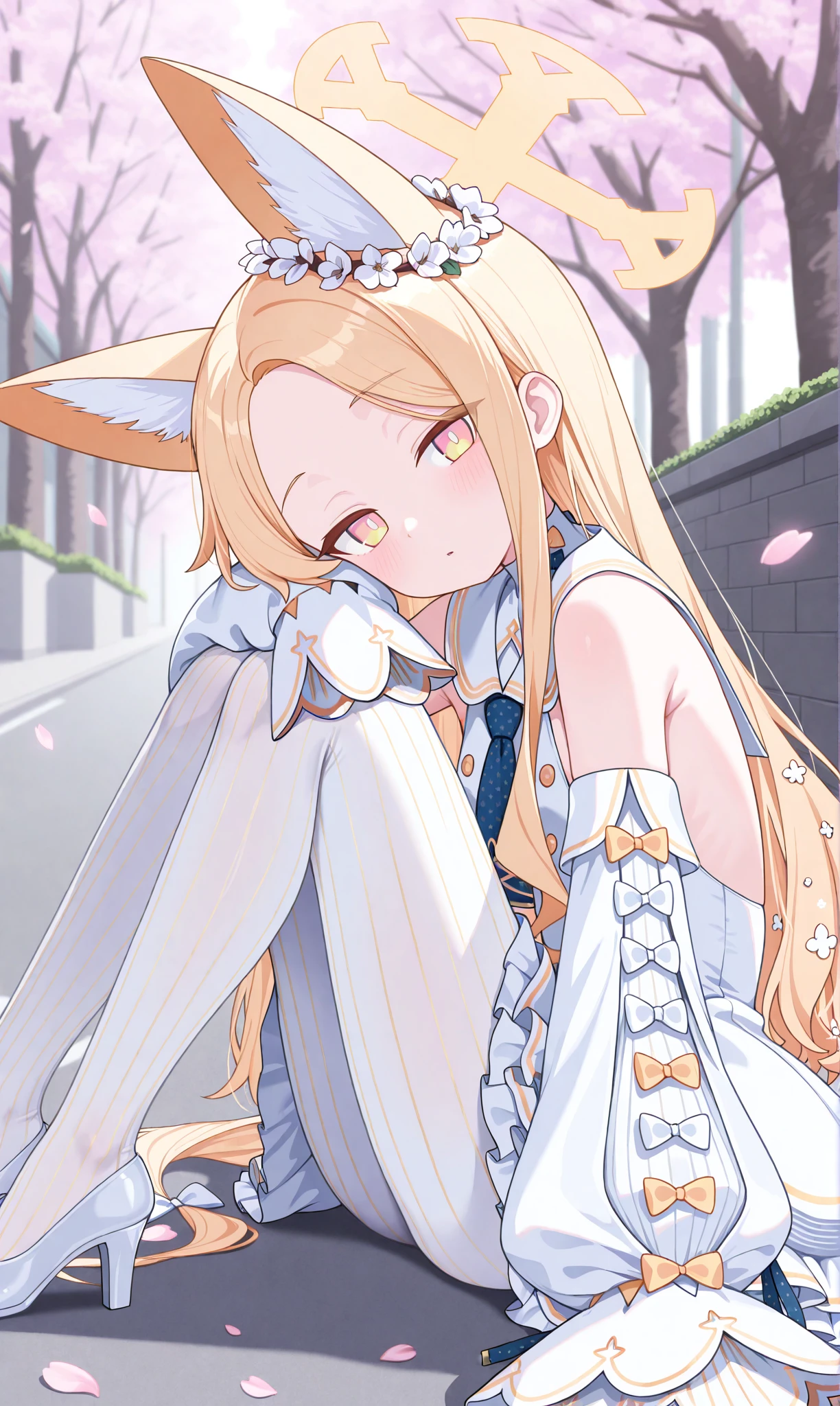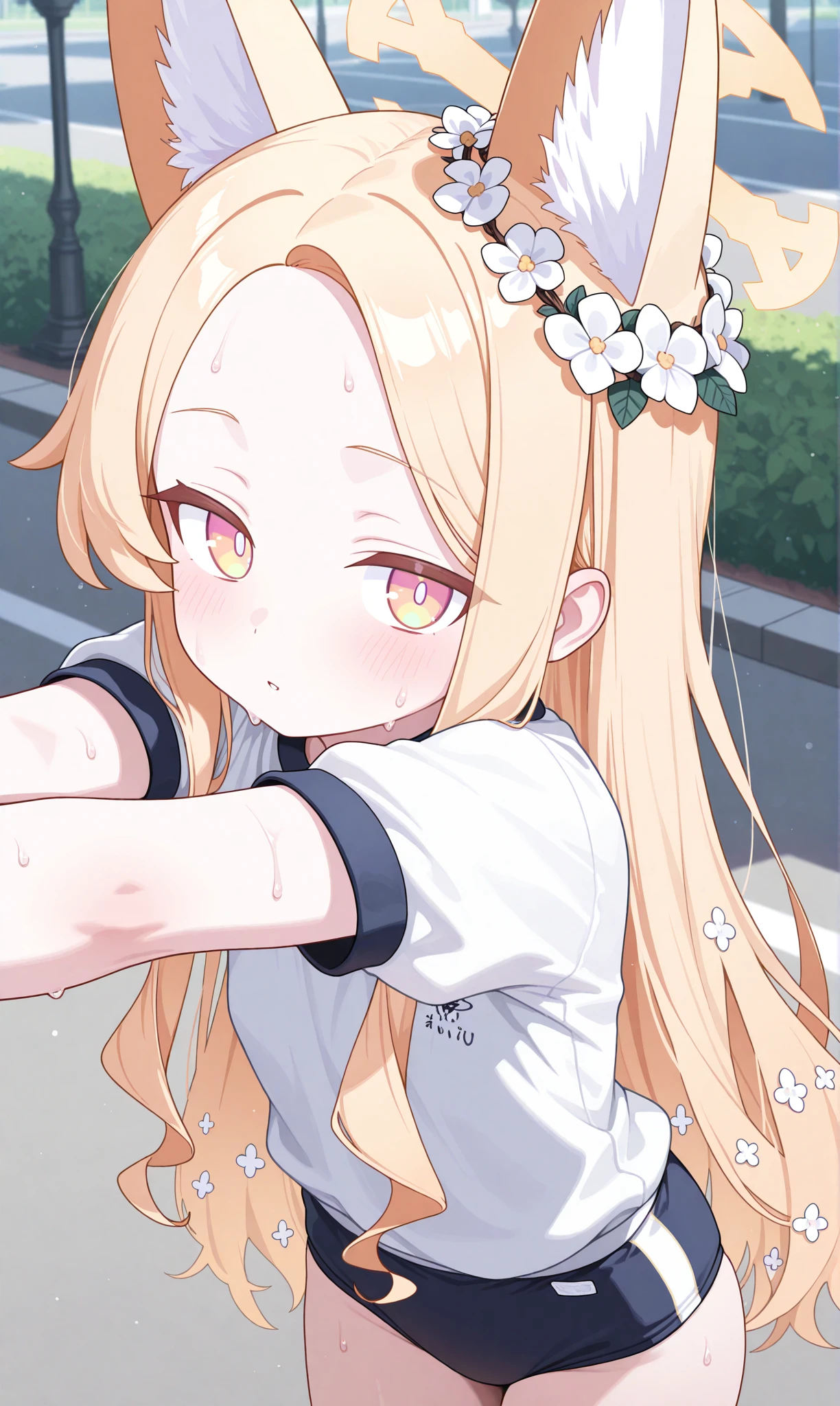 seia (blue archive), orange eyes, foreherad, parted bangs, bright pupils, blonde hair, very long hair, fox ears, hair ornament, hair flower, yellow halo, multicolored eyes, gradient eyes๐ข๐๐๐ณ๐ถ๐:
