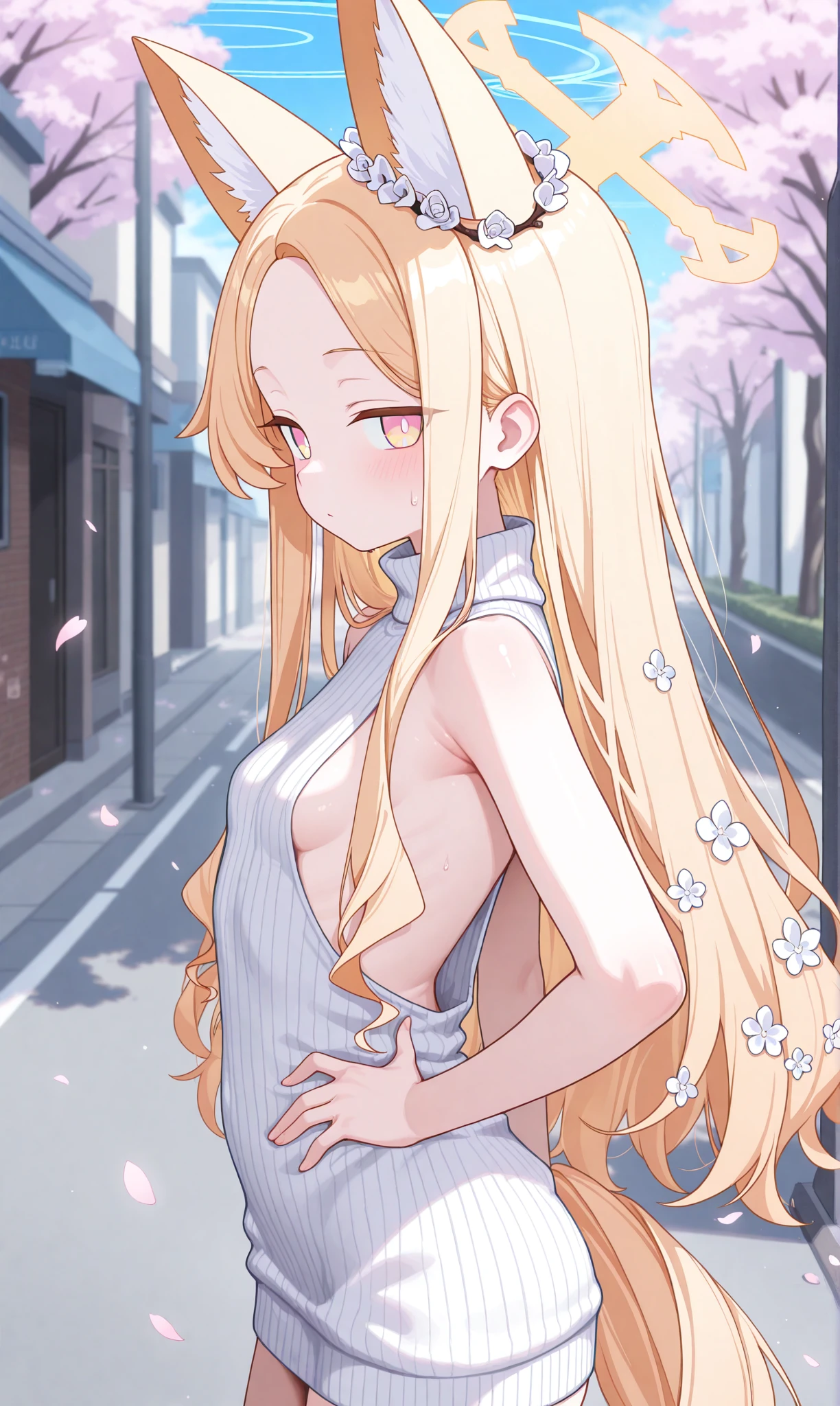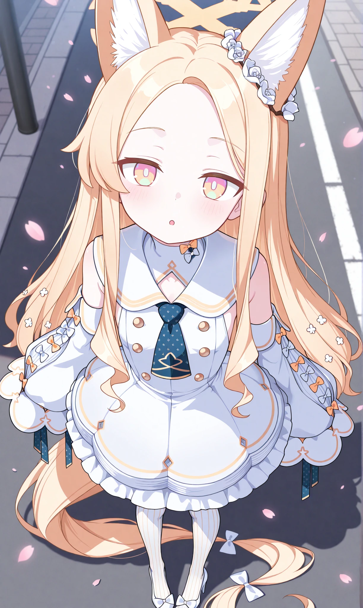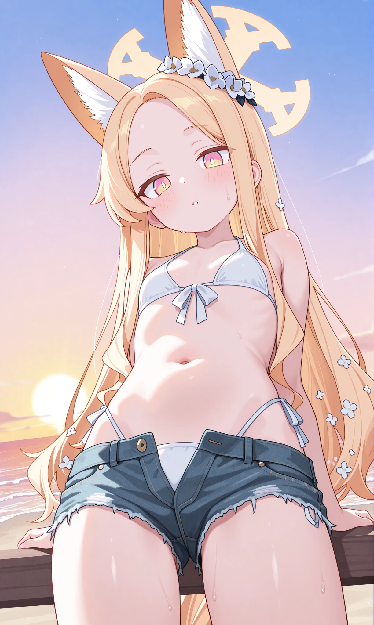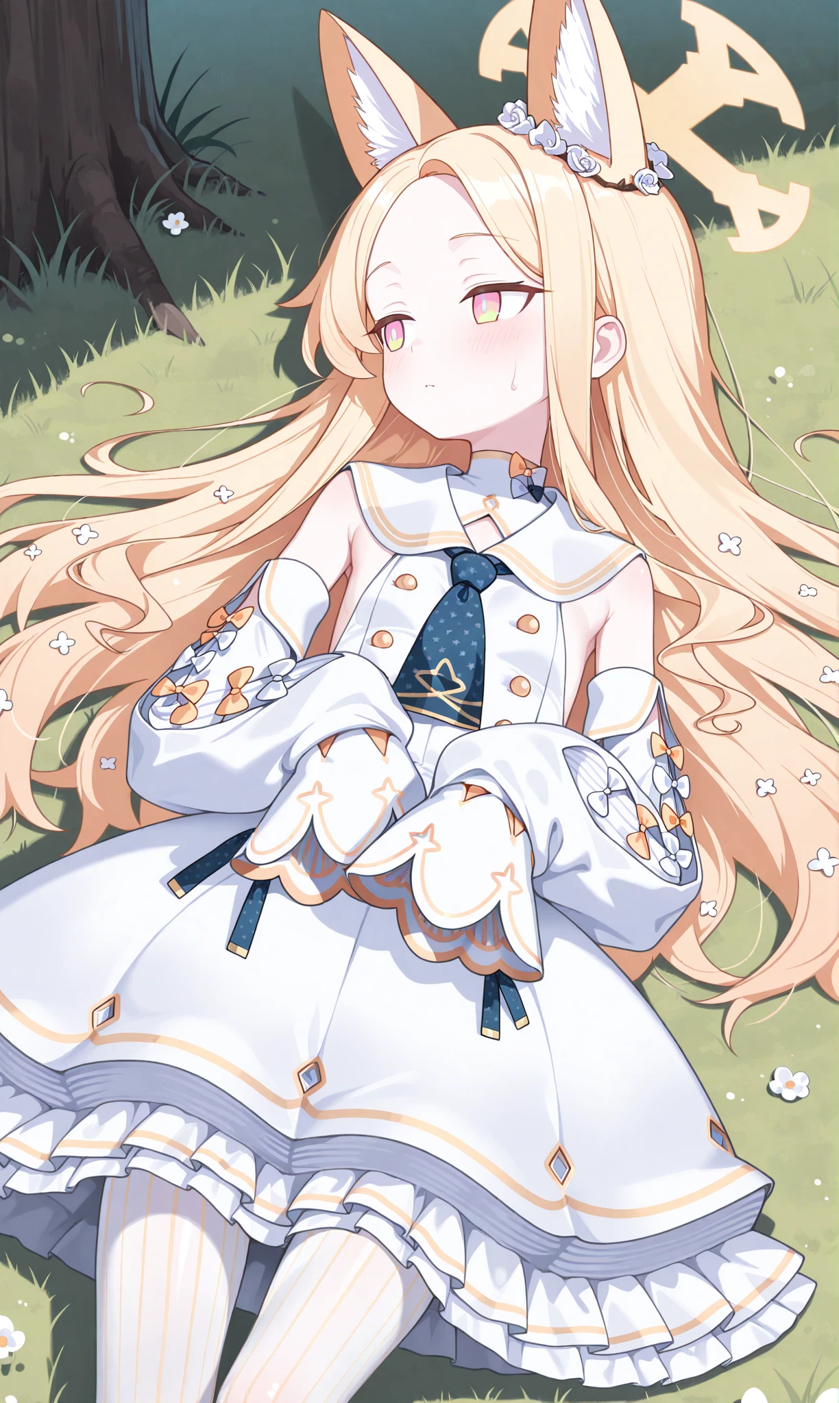 seia (blue archive), orange eyes, foreherad, parted bangs, bright pupils, blonde hair, very long hair, fox ears, hair ornament, hair flower, yellow halo, multicolored eyes, gradient eyes๐ข๐๐๐ณ๐ถ๐: