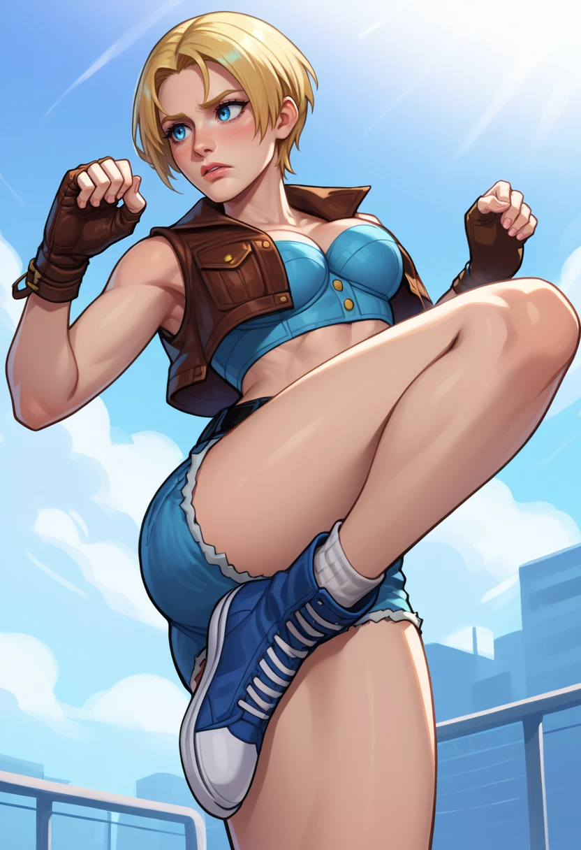 Outfit Descriptors: short hair, blue denim sports bra, brown vest, brown fingerless gloves, denim shorts, black belt, socks, blue sneakers