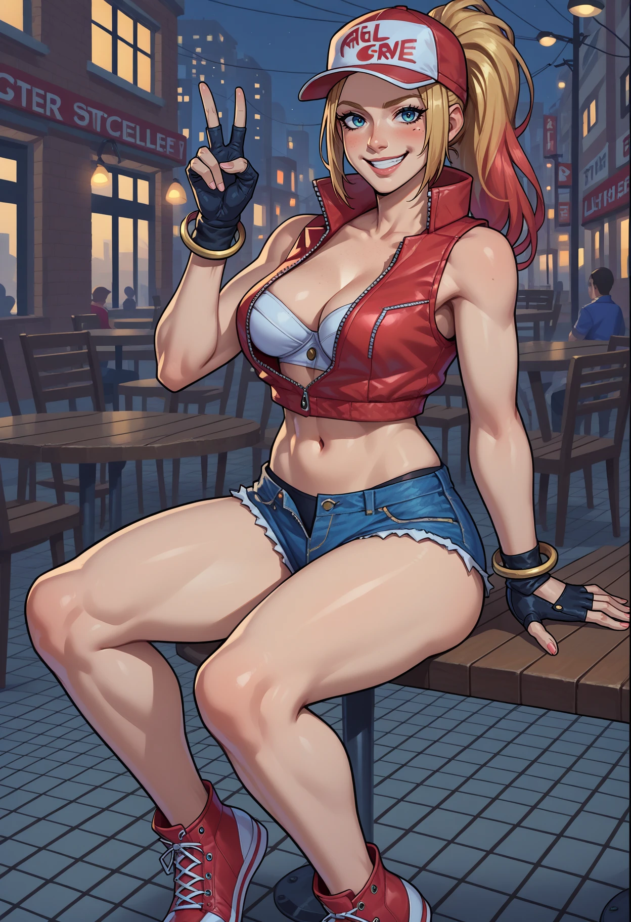 Outfit Descriptors: long ponytail, red trucker cap, red sleeveless jacket, white bra, gold bracelets, fingerless gloves, denim shorts, red sneakers, black panties