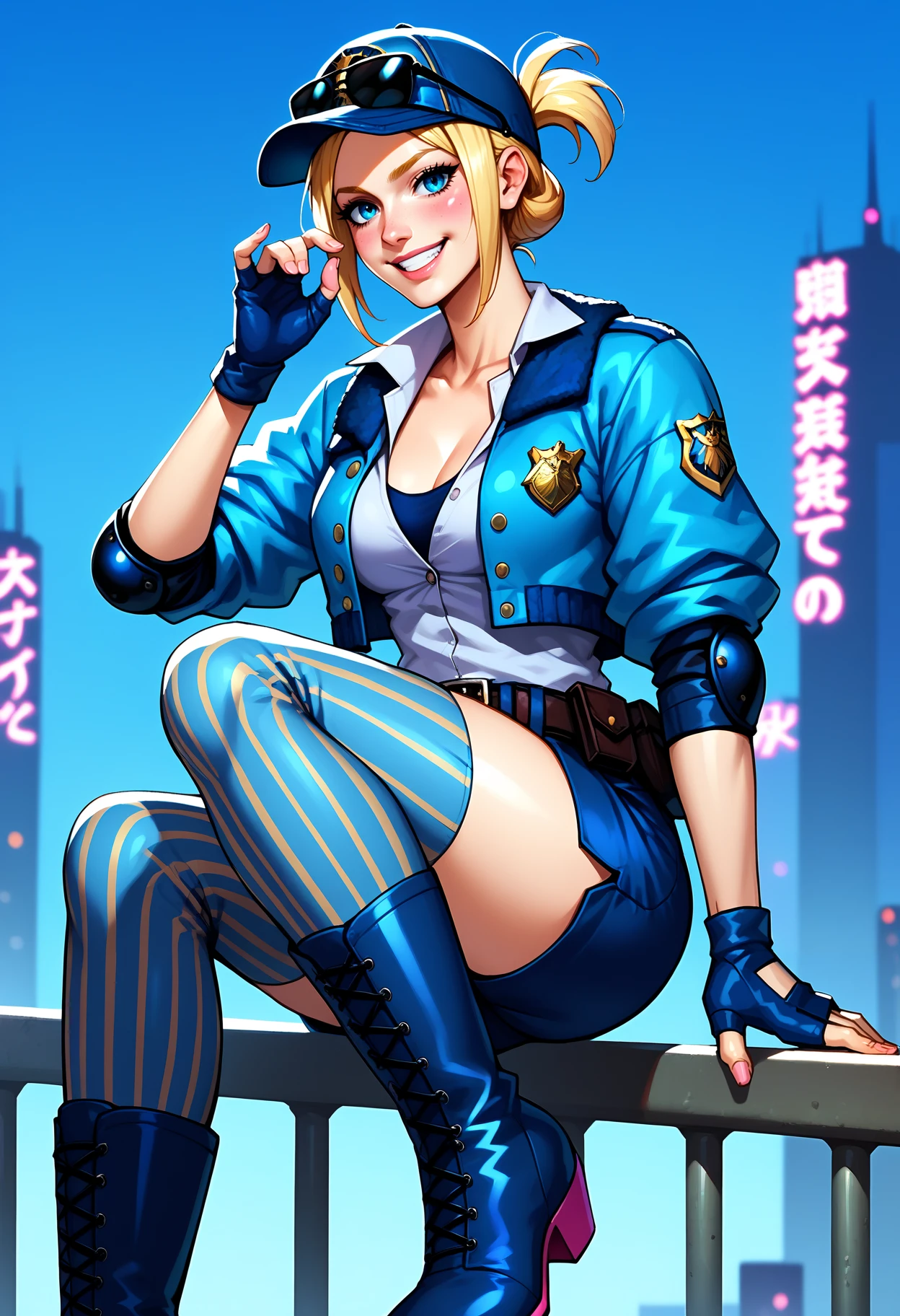 Outfit Descriptors: short ponytail, fingerless gloves, elbow pads, sunglasses on hat, police uniform, shorts, jacket, baseball cap, striped thighhighs, pink soled boots