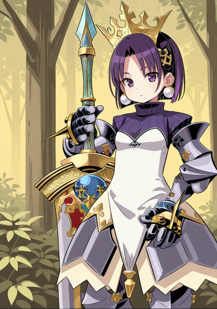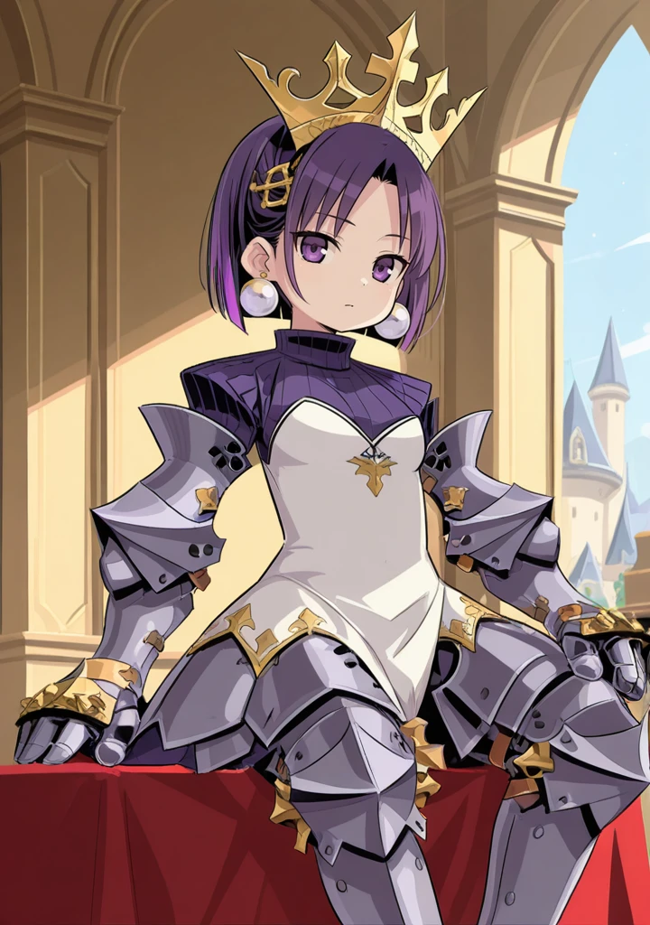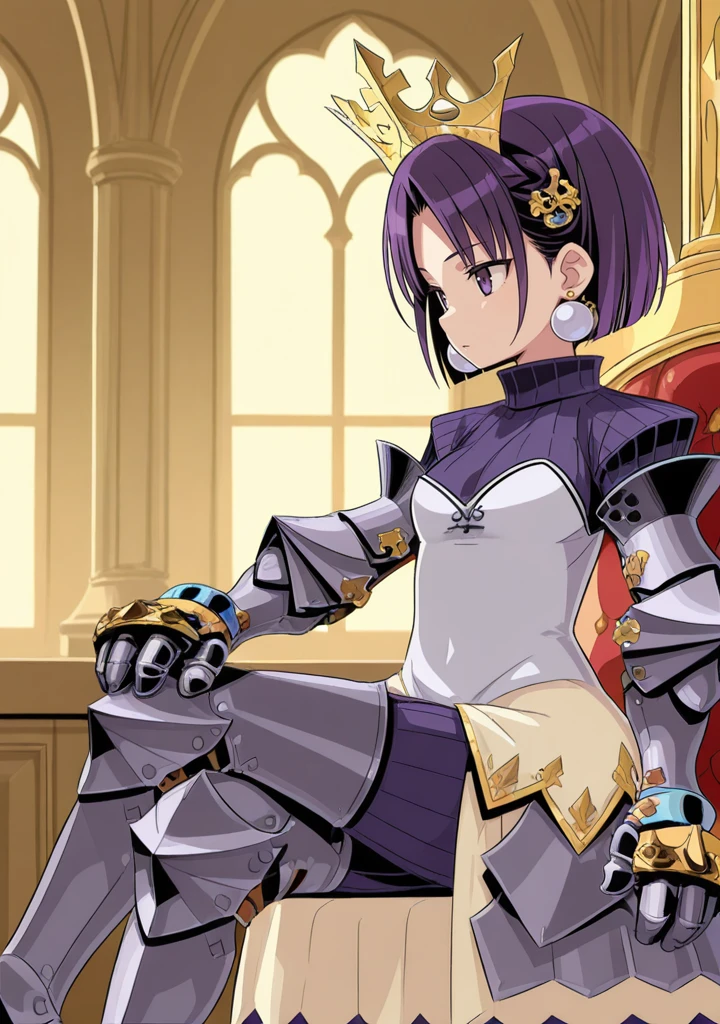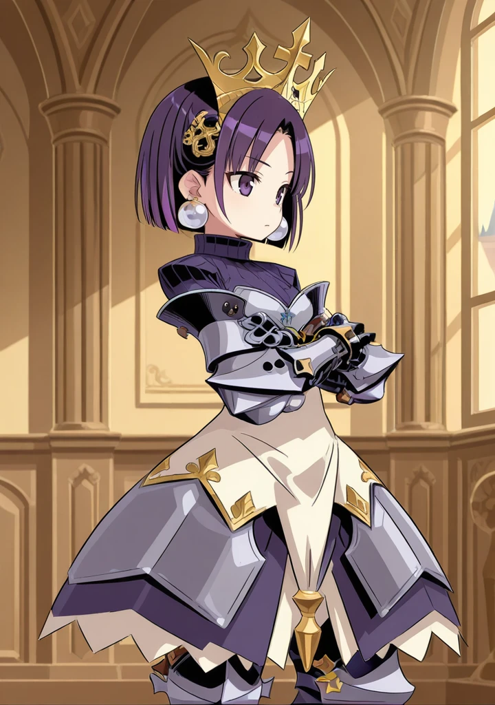 hl-princess-eo,purple hair,purple eyes,short hair,parted bangs,armored dress,armor,armored boots,greaves,gauntlets,crown,hair ornament,earrings,jewelry,turtleneck,armored skirt,