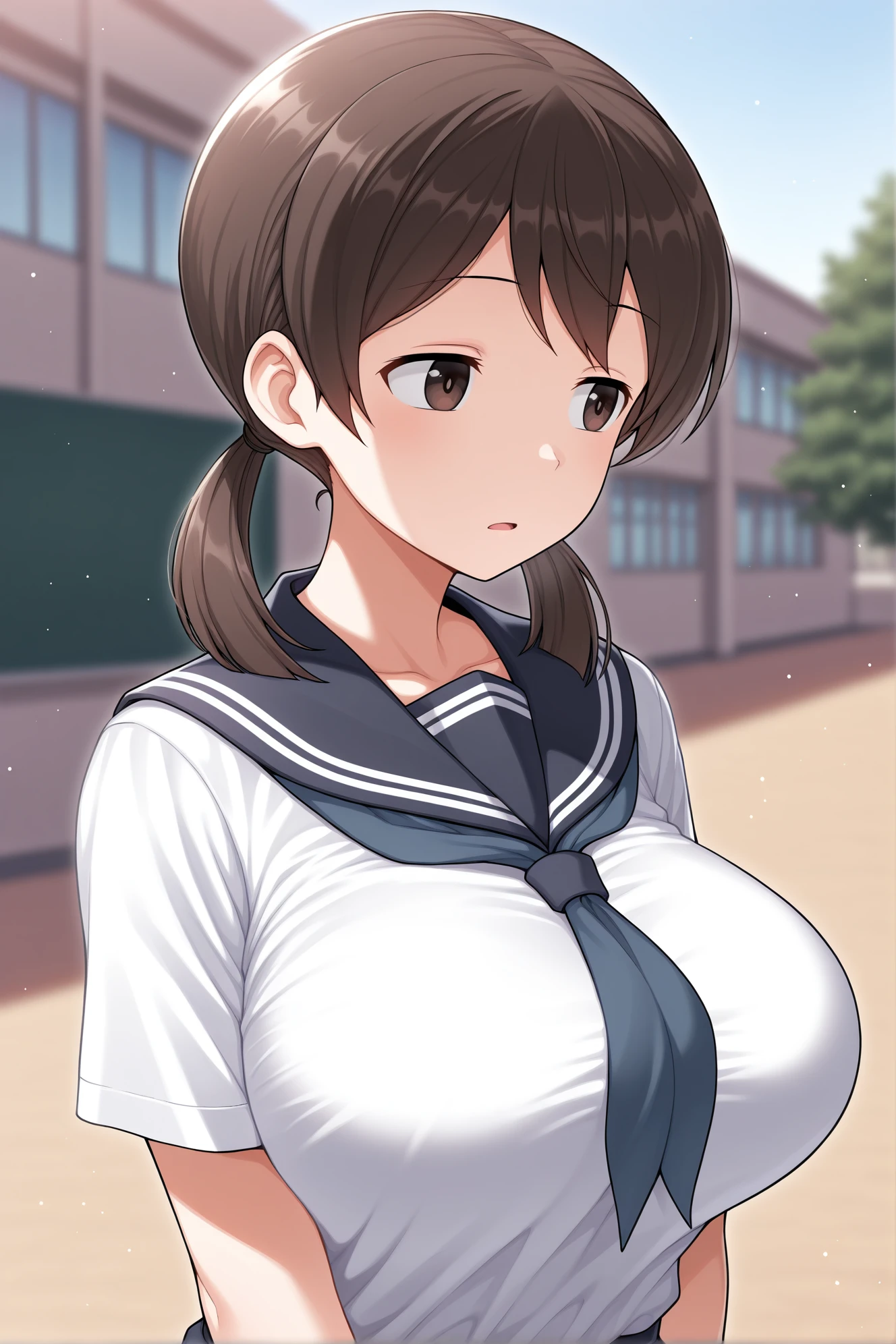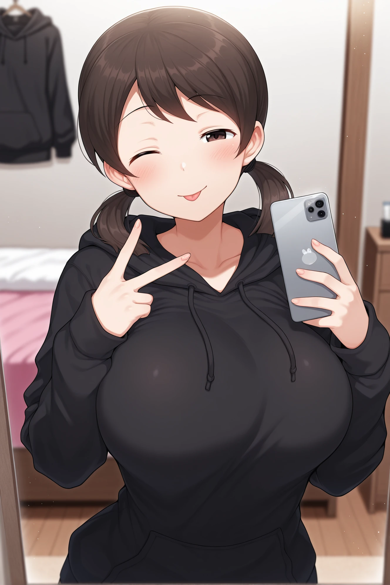 score_7_up,girlnao,brown eyes,low twintails,brown hair,medium hair,large breasts