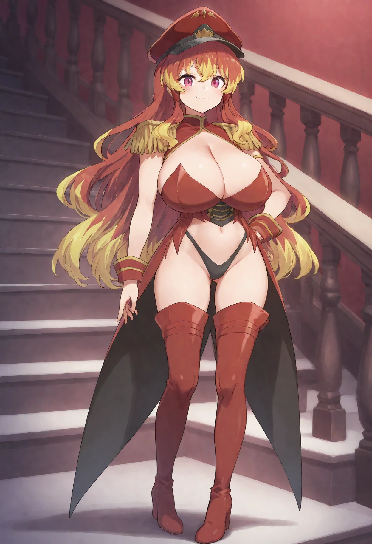 thigh boots, epaulettes, peaked cap, highleg panties, wrist cuffs, corset, midriff, sleeveless, tailcoat,For full-body image / 全身見たい場合 / 全身圖用: