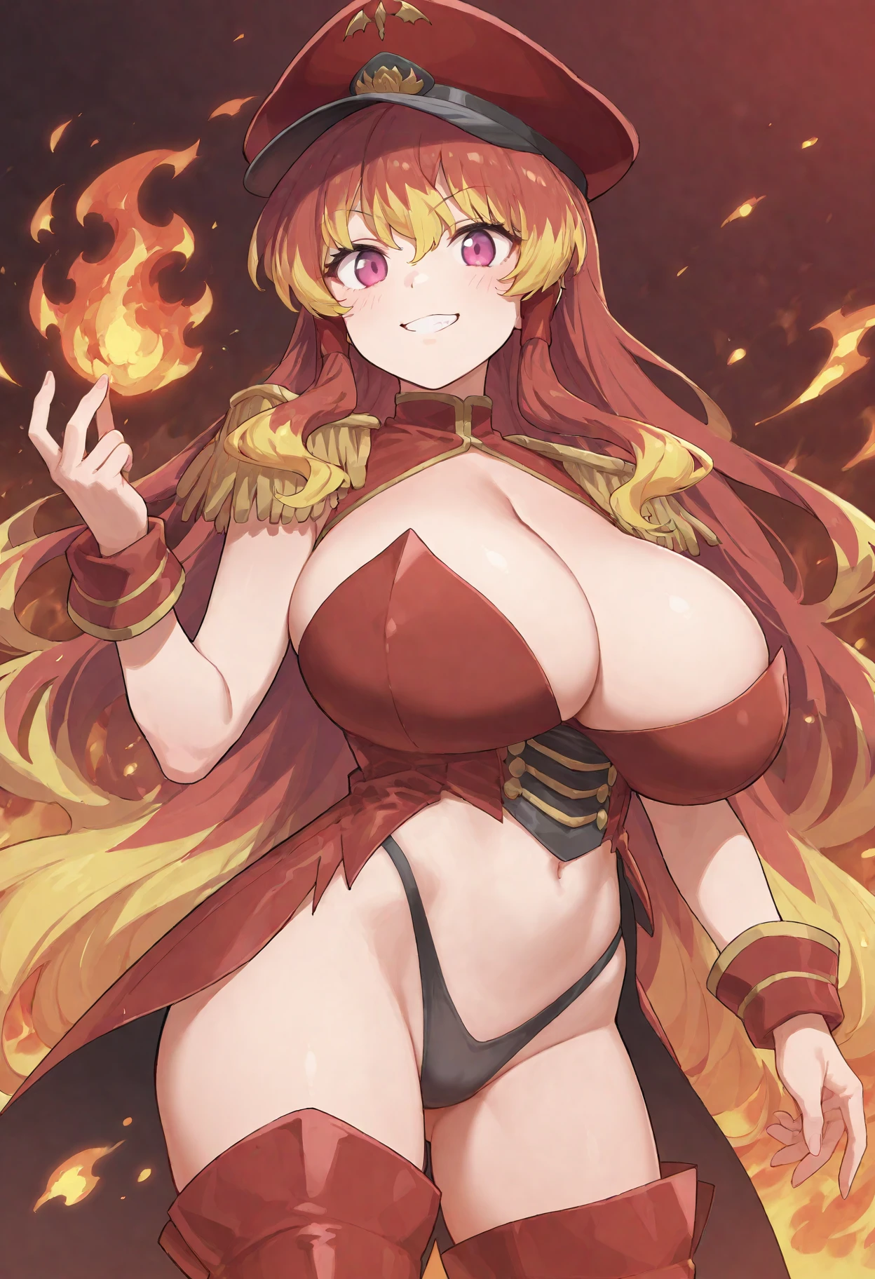flamingbelial, gradient hair, blonde hair, red hair, purple eyes, very long hair, hair tubes, sidelocks, huge breasts,