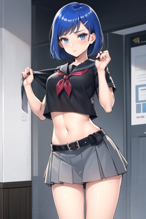 ShegobaraDegosaka, 1girl, solo, short hair, blue eyes, pleated skirt, black shirt, hair ornament, navel, medium breasts, blue hair, short sleeves, black serafuku, hairclip, midriff, belt, miniskirt, crop top, swept bangs, grey skirt