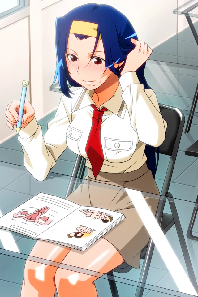 asahina natsuki, tanaka ryou, dark blue hair, very long hair, parted bangs, forehead, hairband, yellow hairband, tsundere, mole under mouth, red eyes, medium breasts