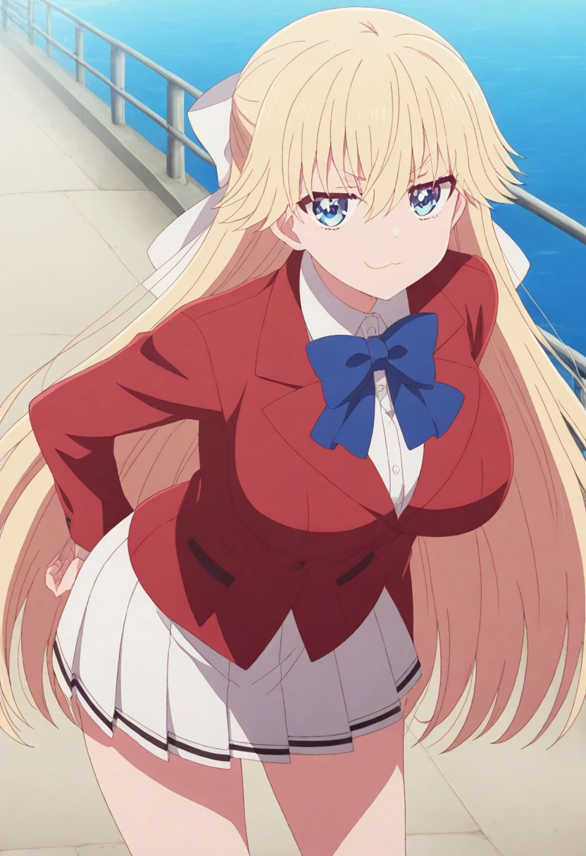 tsubasa nanase, long hair, blue eyes, blonde hair, bow, hair between eyes, hair bow, white bow, large breasts, anime screencap