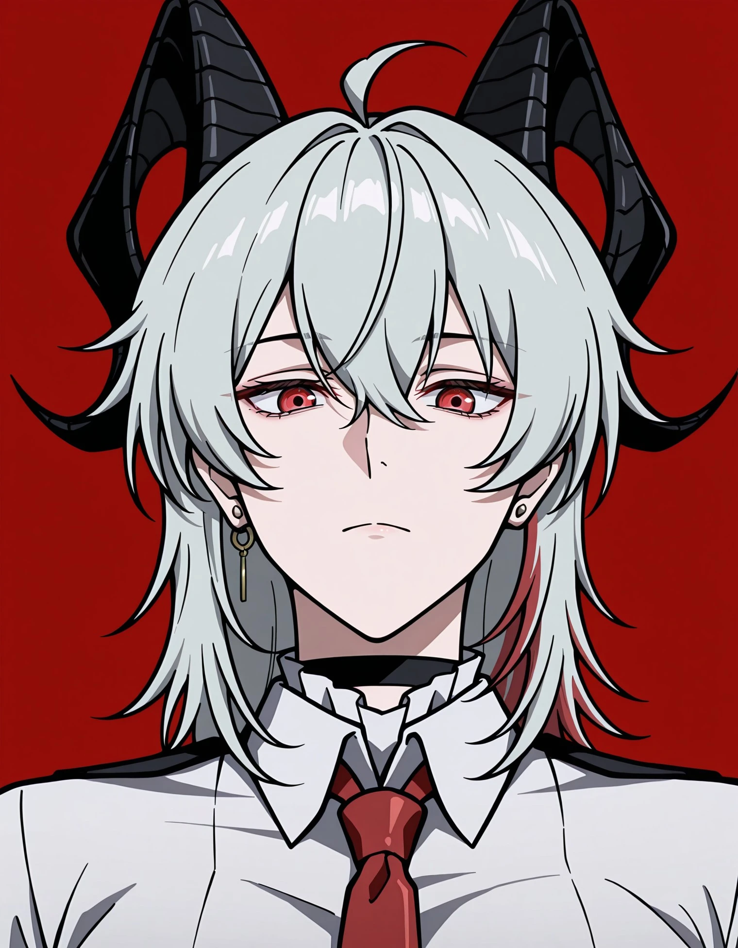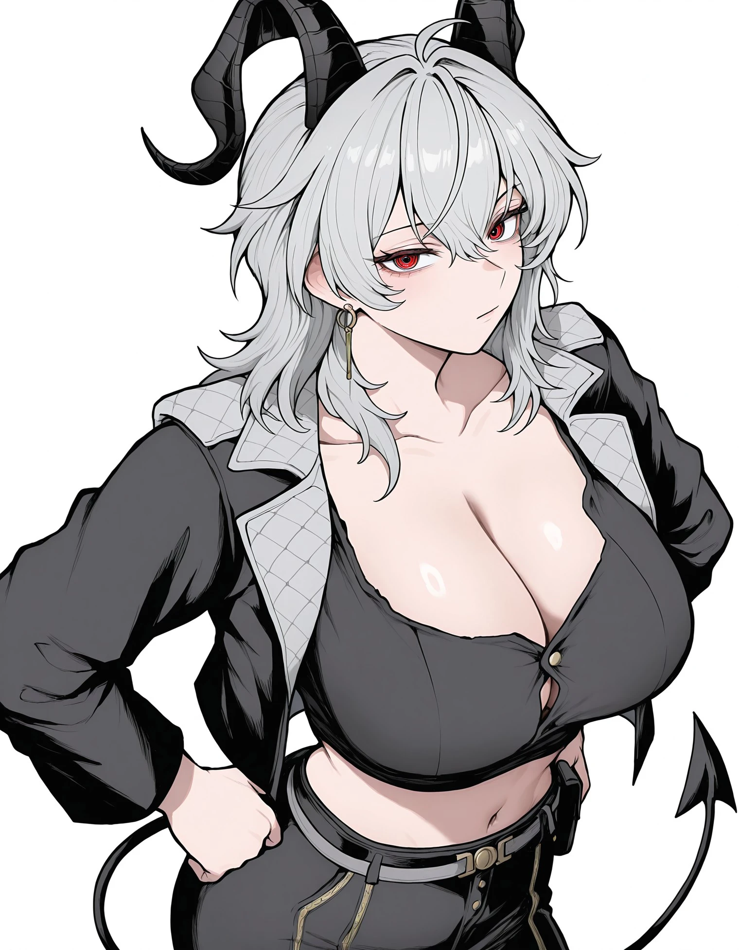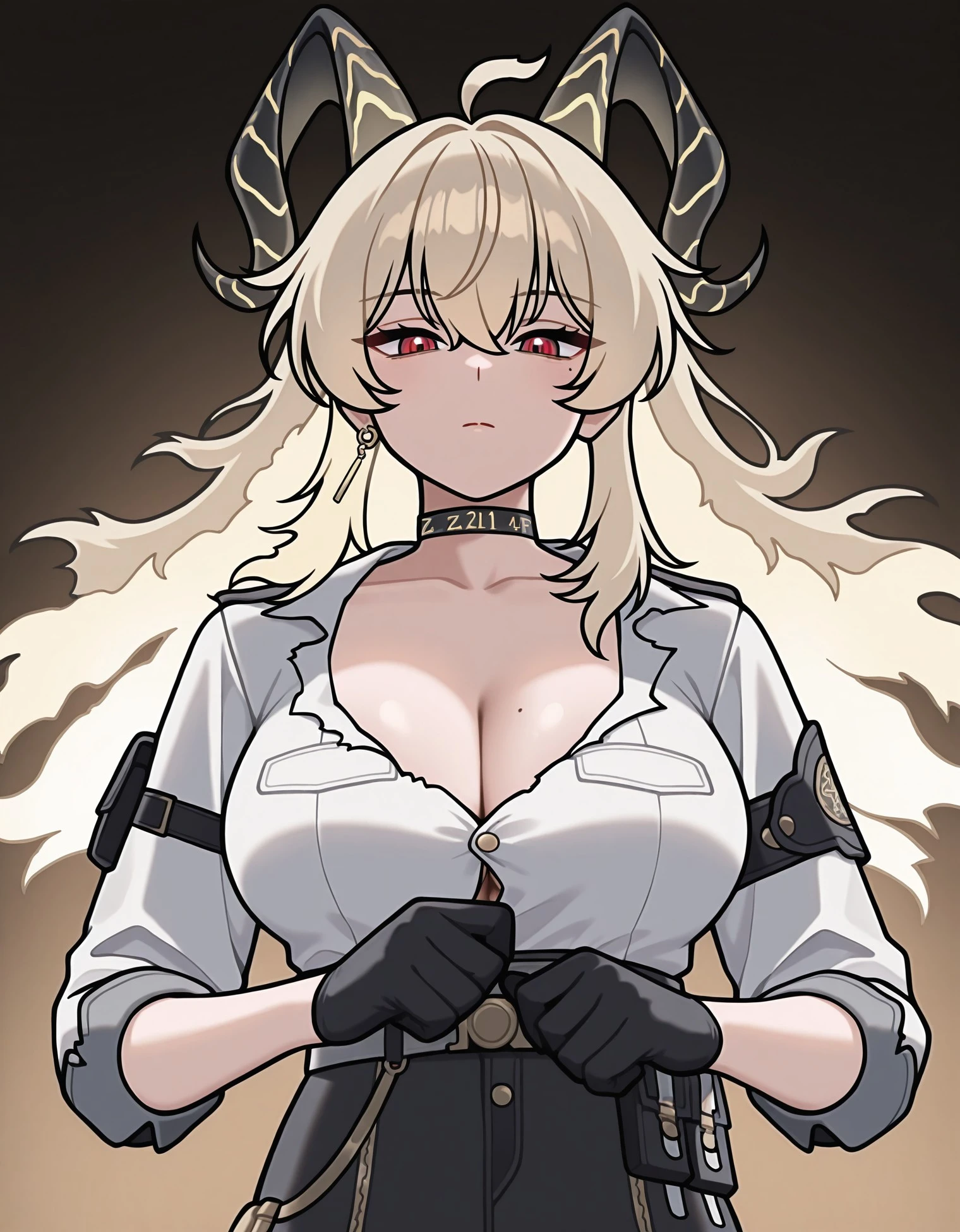 z1ni, red eyes, white hair, hair between eyes, horns, long hair, large breasts, bangs, shirt, white shirt, jewelery, earrings, choker, gloves, black gloves, pants, belt, netcktie, red necktie, mole under eye