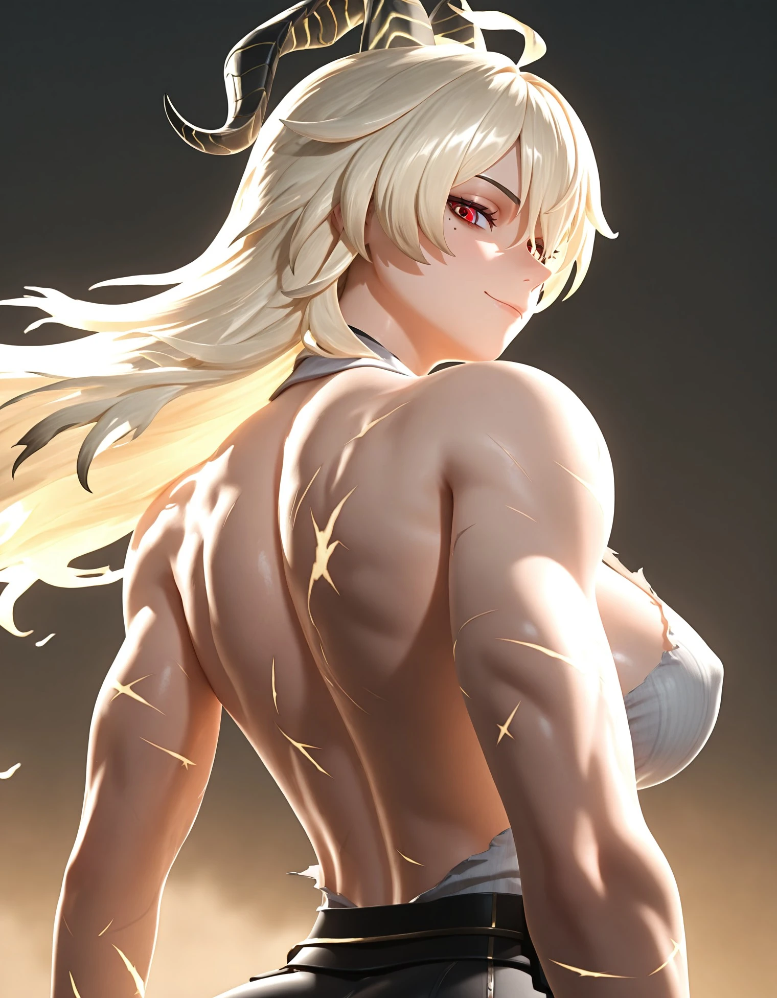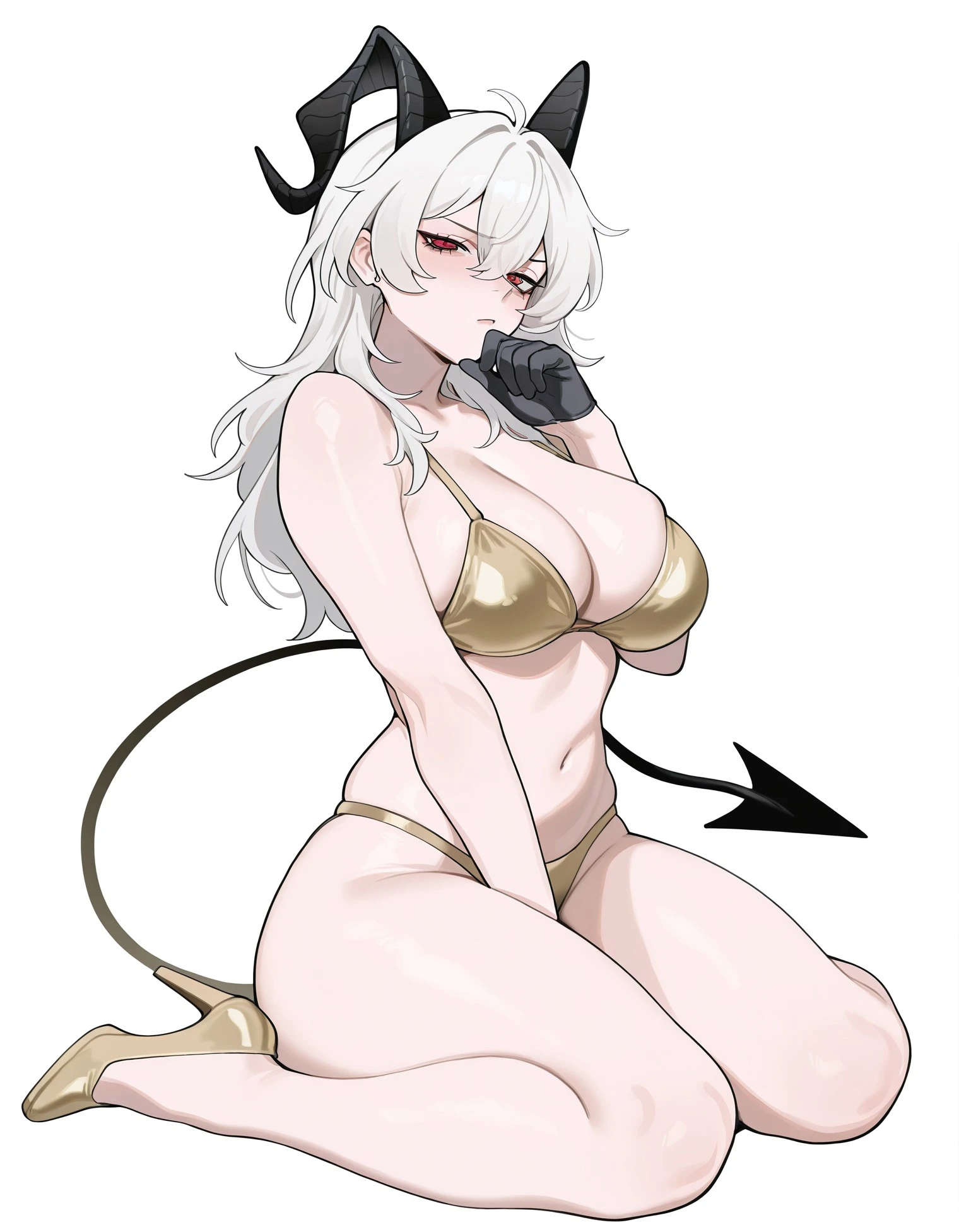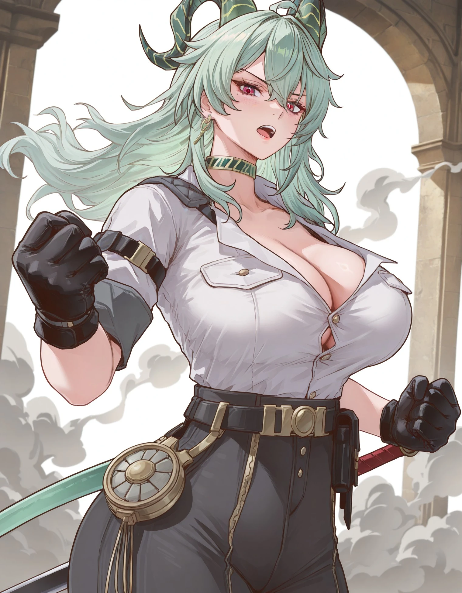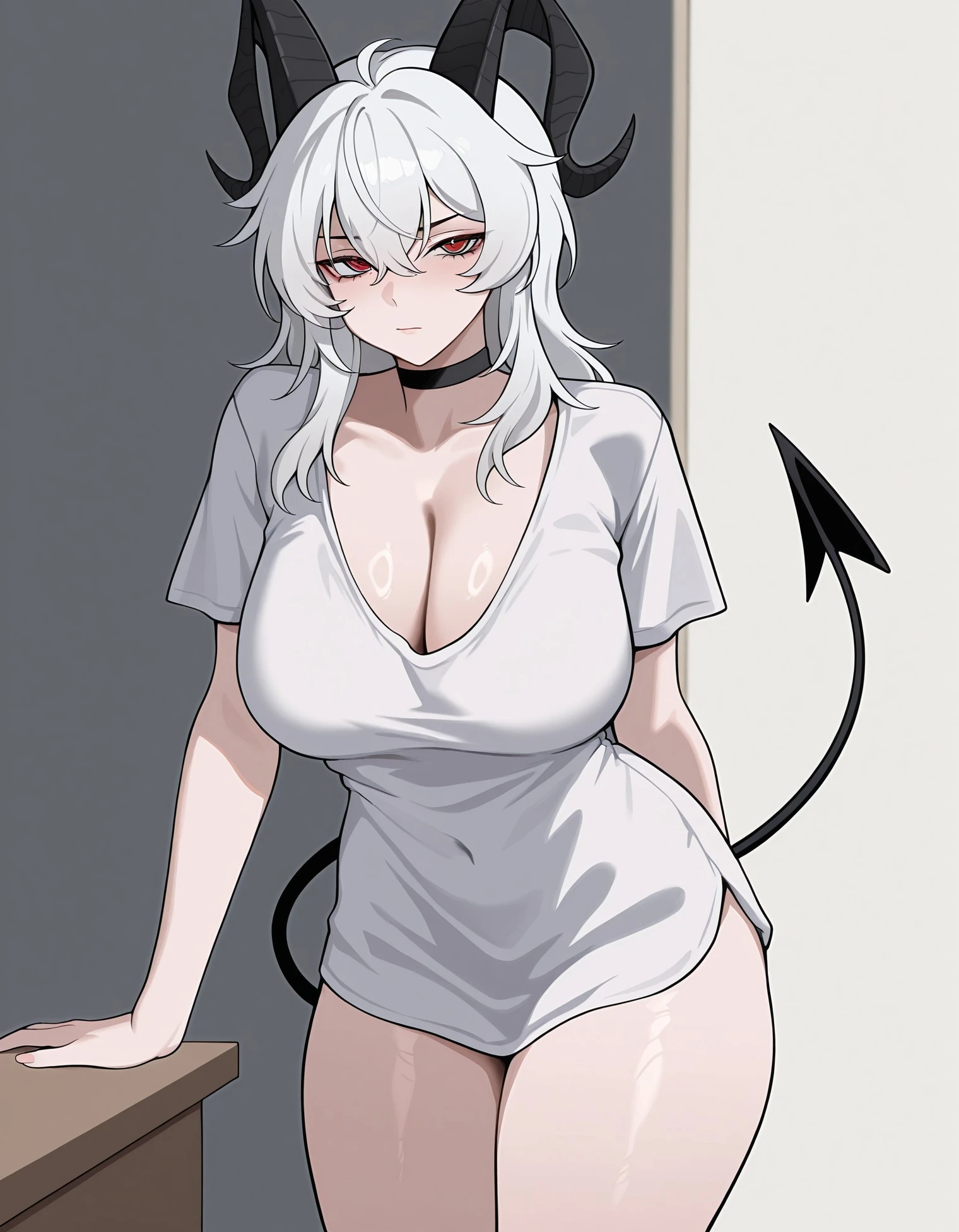 z1ni, red eyes, white hair, hair between eyes, horns, long hair, large breasts, bangs, shirt, white shirt, jewelery, earrings, choker, gloves, black gloves, pants, belt, netcktie, red necktie, mole under eye