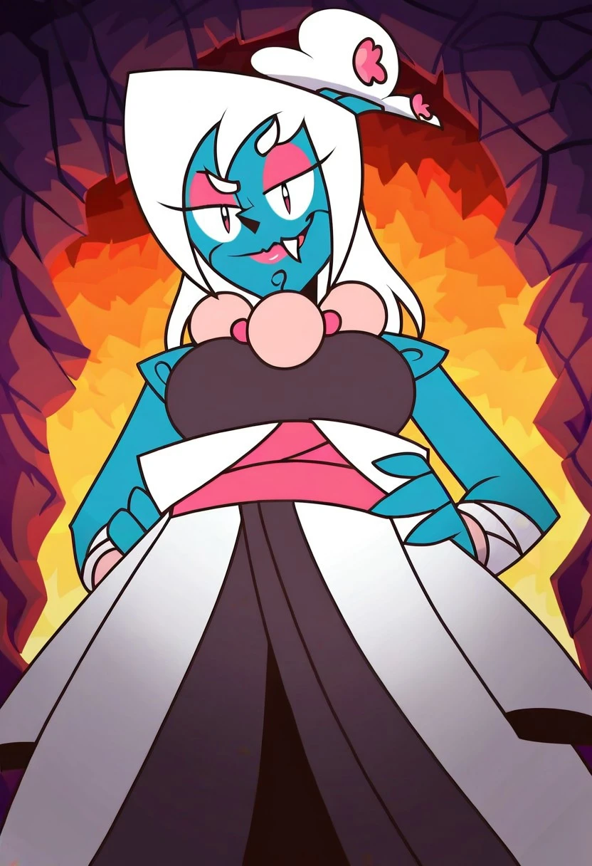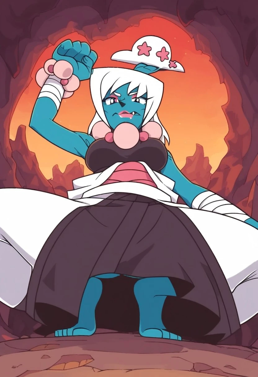 shiromori_msa_rage, 1girl, humanoid, light azure blue skin, small blue and white bonsai tree with pink flowers on the top of her head, shoulder-length white hair, red eyes (black sclera), makeup, pink eye shadow, pink lipstick on bottom lip, one sharp fang on the left, orange tongue, long arms, large hands wrapped in white bandages, legs with no feet, pink claw-like nails, large pink beaded necklace, large pink beaded bracelets, white and brown traditional Japanese-style robe (pink sash),